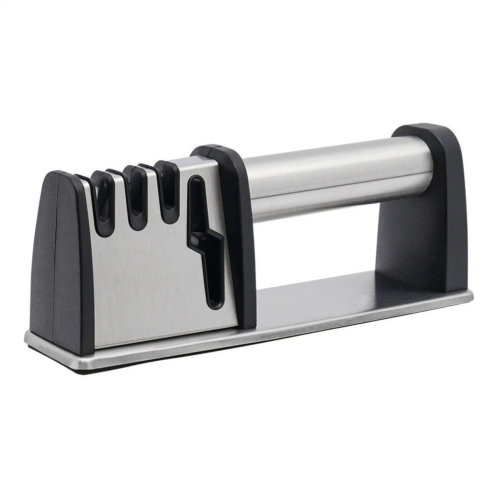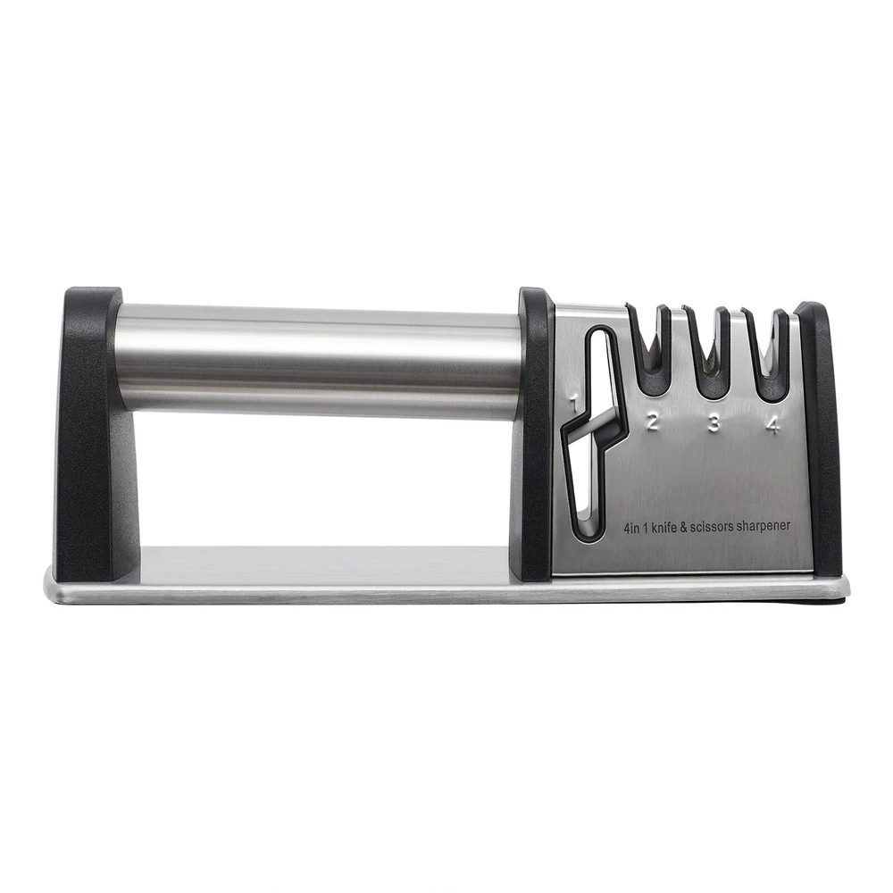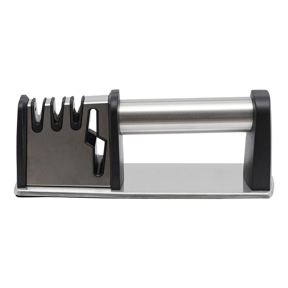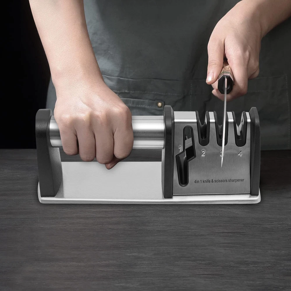 4 Stage Knife Sharpener Professional Ceramic Tungsten Kitchen Sharpening Tool Description The wear and tear of knives is inevitable, but fortunately, with this knit sharpener, you can easily sharpen them again! Four different sharpening slots can meet your various needs, keeping your kitchen free of dull knives for a more enjoyable cooking experience! Key Features 4-in-1 Function: Four different precision and material grinding slots allow it to adapt to more knives and even scissors. Tungsten steel, diamond, and ceramic can be distinguished into three gears: coarse, medium, and fine. The dedicated scissor groove is suitable for the daily sharpening of scissors, making the sharpening process more effective and labor-saving. Selected Material: It is mainly made of sturdy and durable food-grade stainless steel and ABS, allowing you to rest assured that it comes into contact with the knives. Selected tungsten steel, diamond, and ceramic sharpening stone allow you to quickly polish your knives and scissors. Easy to Use: The ergonomical round handle is both suitable for right- and left-handed users to hold comfortably with one hand. The large spacing allows you to easily align the knife with the grinding slot, and the one-way backward pull operation is simple and labor-saving. High Stability: The large PVC anti-slip pad at the bottom can increase the friction between the base and the table, making it stand more stable and less prone to shaking or falling during use, and also protecting the table from scratches. It helps you maintain good posture when using it while also protecting you from injuries caused by sliding when sharpening your knife. Shiny Appearance: The wire drawing process makes it more shiny and less prone to scratches, ensuring aesthetics and practicality. Easy to Clean: Its surface is smooth and not prone to dust or water stains. After sharpening the knife, you can clean it with a soft bristle brush or rinse it with running water then wipe it dry with a dry towel. Convenient Storage: This small (8.66 * 2.6 * 3.07in) and lightweight (0.64 lbs) knife sharpener can be easily stored in the kitchen drawer without taking up too much space. Buy with Confidence: We have been working hard to provide better service and quality for our customers, which is our goal. If there is any problem with our products, please contact us in time. Details V-shaped Groove: The V-shaped groove is designed to keep the knife stable so that you can pull the blade through even pressure. Round Corners: Its edges have been rounded to prevent scratches during use. Smooth Surface: Our knife sharper with fine processes has a smooth and burr-free surface that can better care for your skin, improving you with a compatible user experience. Application It can be used to polish chef knives, kitchen knives, bone cutters, fruit knives, scissors, bayonets, hunting knives, pocket knives or any other non-serrated blades, etc. to improve the sharpness of the knife. How to Use Place the knife into the corresponding grinding hole, keeping it perpendicular to the countertop. Hold the handle of the sharpener with one hand, and press it down with appropriate force with the other hand. Repeat pulling the knife back several times. Grinding the blade tip: When the curved part of the blade passes through the blade groove, the handle should be slightly raised and the blade tip inserted into the blade groove. The larger the curvature of the blade, the more it is necessary to lift the handle. Grinding scissors: Open the scissors and insert them into the grinding groove. Then clamp the polishing rod with the scissors blade. Press forward evenly and then pull back to clamp. Repeat this process several times. The scissors will immediately sharpen. Slot Introduction The grinding slot #1: It is used for sharpening scissors. Open the scissors and insert them into the grinding slot. Then clamp the grinding rod with the scissor blade. Press them evenly forward and pull them back clamping. Repeat this process several times. The scissors will be instantly sharp. The grinding slot #2: Use this slot only when your knife is particularly dull. Pull the knife vertically backwards three times. Sharpening is carried out once every six months or only if necessary. The grinding slot #3: It is used for daily maintenance and grinding of knives, so that sharp knives are always available. It is recommended to use it once a week. The grinding slot #4: It is used to remove small burrs on the blade. Repeat the process two to three times in the same direction. Specifications Color: Silver, Black Material: Food-grade Stainless Steel, ABS, PVC, Ceramic, Diamond, Tungsten Steel Surface Treatment: Wire Drawing Number of Items: 1 Gross Weight: 0.34kg/0.75lbs Net Weight: 0.29kg/0.64lbs Product Size: 22*6.6*7.8cm/8.66*2.6*3.07in Package Size: 22.7*6.5*8.8cm/8.93*2.56*3.46in Package Included 1*Knife Sharpener Notes Please note that ceramic knives, notched knives, serrated knives, axe, pedicure knives and butcher knives are not applicable to this product. Please do not place this product within the reach of children. The blackening of ceramic grinding stones after use is a normal condition and does not affect their use. After sharpening the knife, please use a soft bristle brush to clean it, and do not wipe it with your fingers to avoid injury. If you need to wash it with water, please dry it with a dry towel after cleaning to prevent rusting. Please keep a certain distance between your body and this product when using it to avoid hurting yourself if you accidentally drop it. Please allow the slight color difference caused by the shooting light and 1-3cm error due to manual measurement, and make sure you do not mind before you order. Payment Delivery details Terms of sales About us Contact us Payment We accept ebay payment 。 Fees such as import duties, taxes are not included in the item price or shipping costs. These charges are the buyer's responsibility. Delivery det