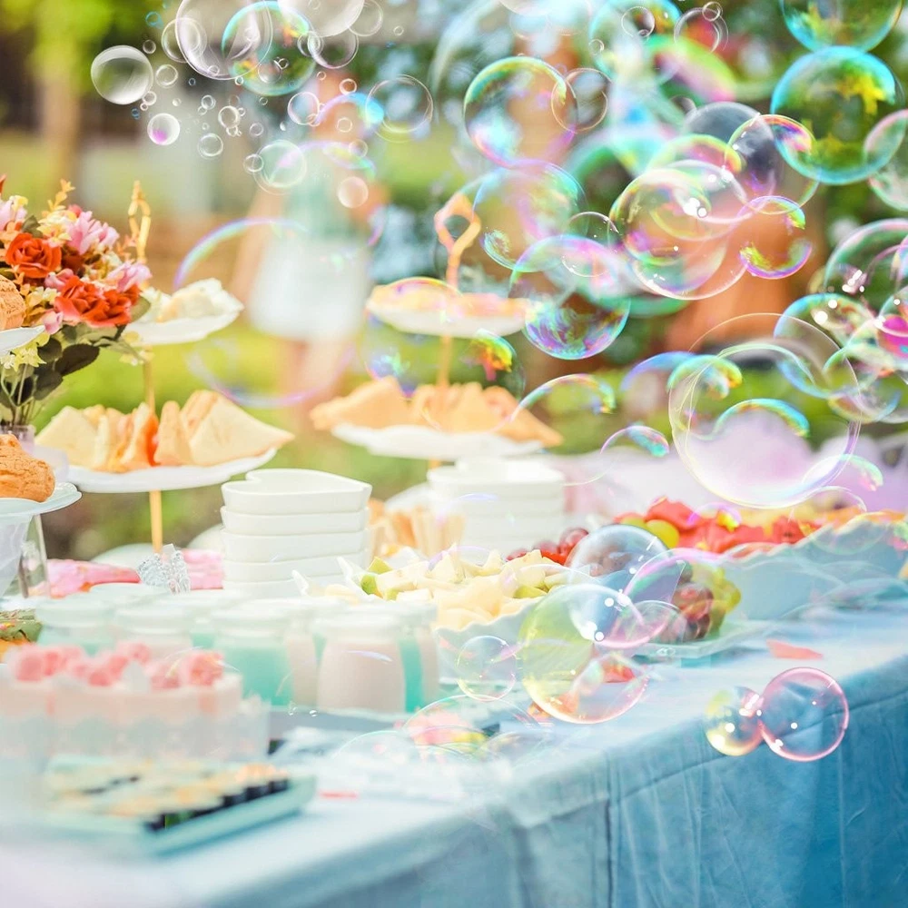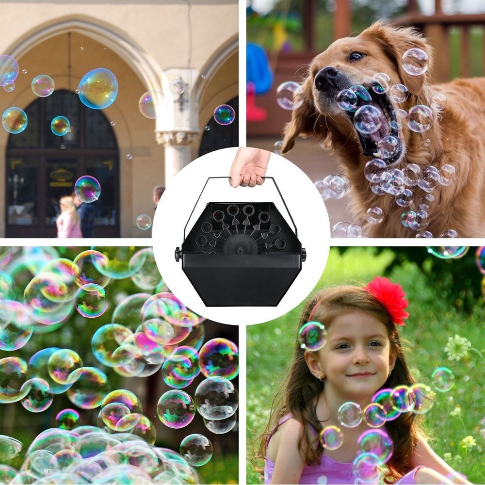 Operational Instruction: Install the supplied handle via screws. Place the bubble machine on a flat platform, then plug the power cable to an appropriate power socket. Refill a certain volume of bubble fluid into the reservoir. Manual control: switch button to “I” gear to generate bubbles. Switch button to “O” gear to turn off the device. Remote control: switch button to “II”gear, then press unlock button to generate bubbles. Press lock button to stop bubble generating. Open the antenna, you can increase the remote control distance, up to 14m(45ft). Switch button to "O" gear to turn off the device. Unplug the power cable and then remove remaining fluid after each use. Wipe out bubble residue on its surface with dry towel to avoid erosion. Caution: If the red light of the remote control is off, it is possible that the battery is exhausted. Open the rear cover screw and replace the new battery(23A battery). Make sure no more than 15 degrees of inclination when using the device. Do not let bubbles shoot directly at any one’s face. Avoid to use under strong wind weather, Gale would affect its performance. Avoid to continuously use it for more than 8 hours. Walk carefully in case of slippery when you using it indoor. Please use regular bubble fluid. Specifications: Voltage: AC100-120V 60HZ Power:25W Fluid tank capacity: 0.75L Rotor rotating: speed of 18-20 rpm Liquid consumption:1.2L/h Control: manual and remote Remote distance: ≤14m(45ft) Material:Metal Shell Size:9.5*6.7*8.3in Weight: 3.85lbs Package Contents:1×bubble machine 1×handle 1×remote control(1×23A battery included) 1×user manual DREAMY ATMOSPHERE CREATOR: Large high velocity fan makes bubbles rise quickly in the air to create dreamy and romantic atmosphere for birthday, parties, stages, wedding, disc, family get-together, dogs & cats and pets playing, Halloween, Christmas, Thanksgiving Day, any festivals and much more occasions. HIGH OUTPUT BUBBLES: Up to 16 bubble wands, high performance rotor rotating at speed of 20 rpm equipped with high velocity fan can generate thousands of bubbles and blow far away. 750ml high capacity liquid tank make it unnecessary to add bubble liquid in several times, enjoy uninterrupted bubbles! It can blow thousands of colorful bubbles Faster, Higher, Farther, Larger and last Longer. EASY to USE: Two ways to operate, it can be used in fixed automatic mode or wireless remote control. The farthest remote control distance is about 14m(45ft). Note: The bubble liquid must exceed the minimum line, the ring of bubble wands needs to be completely covered by the bubble liquid. Otherwise, there is not enough bubble liquid attached, and bubbles cannot be generated. PORTABLE DESIGN: Equipped with a detachable handle and lightweight design, portable for convenient use; weight 3.6lbs, size 9.5*7.2*9.5inch. SAFE and DURABLE: Super safe design, blocked reverse rotation, when the bubble wands rotate, it will automatically reverse rotation under external force, which is more durable and safe. Constructed in rugged metal shell, antirust treatment, it can be used indoor and outdoor.