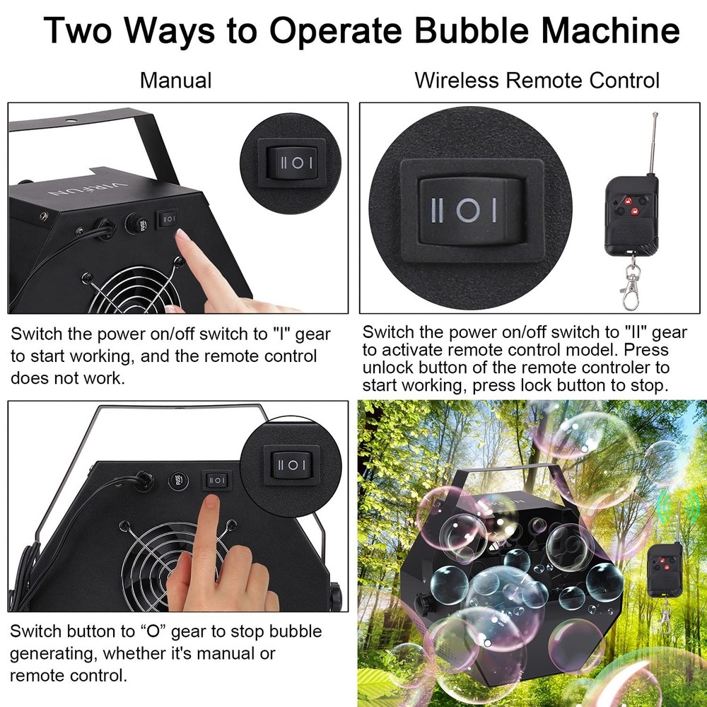 Operational Instruction: Install the supplied handle via screws. Place the bubble machine on a flat platform, then plug the power cable to an appropriate power socket. Refill a certain volume of bubble fluid into the reservoir. Manual control: switch button to “I” gear to generate bubbles. Switch button to “O” gear to turn off the device. Remote control: switch button to “II”gear, then press unlock button to generate bubbles. Press lock button to stop bubble generating. Open the antenna, you can increase the remote control distance, up to 14m(45ft). Switch button to "O" gear to turn off the device. Unplug the power cable and then remove remaining fluid after each use. Wipe out bubble residue on its surface with dry towel to avoid erosion. Caution: If the red light of the remote control is off, it is possible that the battery is exhausted. Open the rear cover screw and replace the new battery(23A battery). Make sure no more than 15 degrees of inclination when using the device. Do not let bubbles shoot directly at any one’s face. Avoid to use under strong wind weather, Gale would affect its performance. Avoid to continuously use it for more than 8 hours. Walk carefully in case of slippery when you using it indoor. Please use regular bubble fluid. Specifications: Voltage: AC100-120V 60HZ Power:25W Fluid tank capacity: 0.75L Rotor rotating: speed of 18-20 rpm Liquid consumption:1.2L/h Control: manual and remote Remote distance: ≤14m(45ft) Material:Metal Shell Size:9.5*6.7*8.3in Weight: 3.85lbs Package Contents:1×bubble machine 1×handle 1×remote control(1×23A battery included) 1×user manual DREAMY ATMOSPHERE CREATOR: Large high velocity fan makes bubbles rise quickly in the air to create dreamy and romantic atmosphere for birthday, parties, stages, wedding, disc, family get-together, dogs & cats and pets playing, Halloween, Christmas, Thanksgiving Day, any festivals and much more occasions. HIGH OUTPUT BUBBLES: Up to 16 bubble wands, high performance rotor rotating at speed of 20 rpm equipped with high velocity fan can generate thousands of bubbles and blow far away. 750ml high capacity liquid tank make it unnecessary to add bubble liquid in several times, enjoy uninterrupted bubbles! It can blow thousands of colorful bubbles Faster, Higher, Farther, Larger and last Longer. EASY to USE: Two ways to operate, it can be used in fixed automatic mode or wireless remote control. The farthest remote control distance is about 14m(45ft). Note: The bubble liquid must exceed the minimum line, the ring of bubble wands needs to be completely covered by the bubble liquid. Otherwise, there is not enough bubble liquid attached, and bubbles cannot be generated. PORTABLE DESIGN: Equipped with a detachable handle and lightweight design, portable for convenient use; weight 3.6lbs, size 9.5*7.2*9.5inch. SAFE and DURABLE: Super safe design, blocked reverse rotation, when the bubble wands rotate, it will automatically reverse rotation under external force, which is more durable and safe. Constructed in rugged metal shell, antirust treatment, it can be used indoor and outdoor.