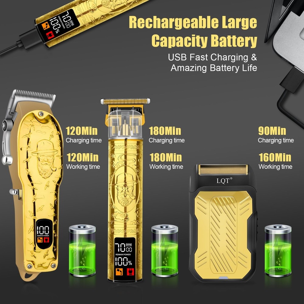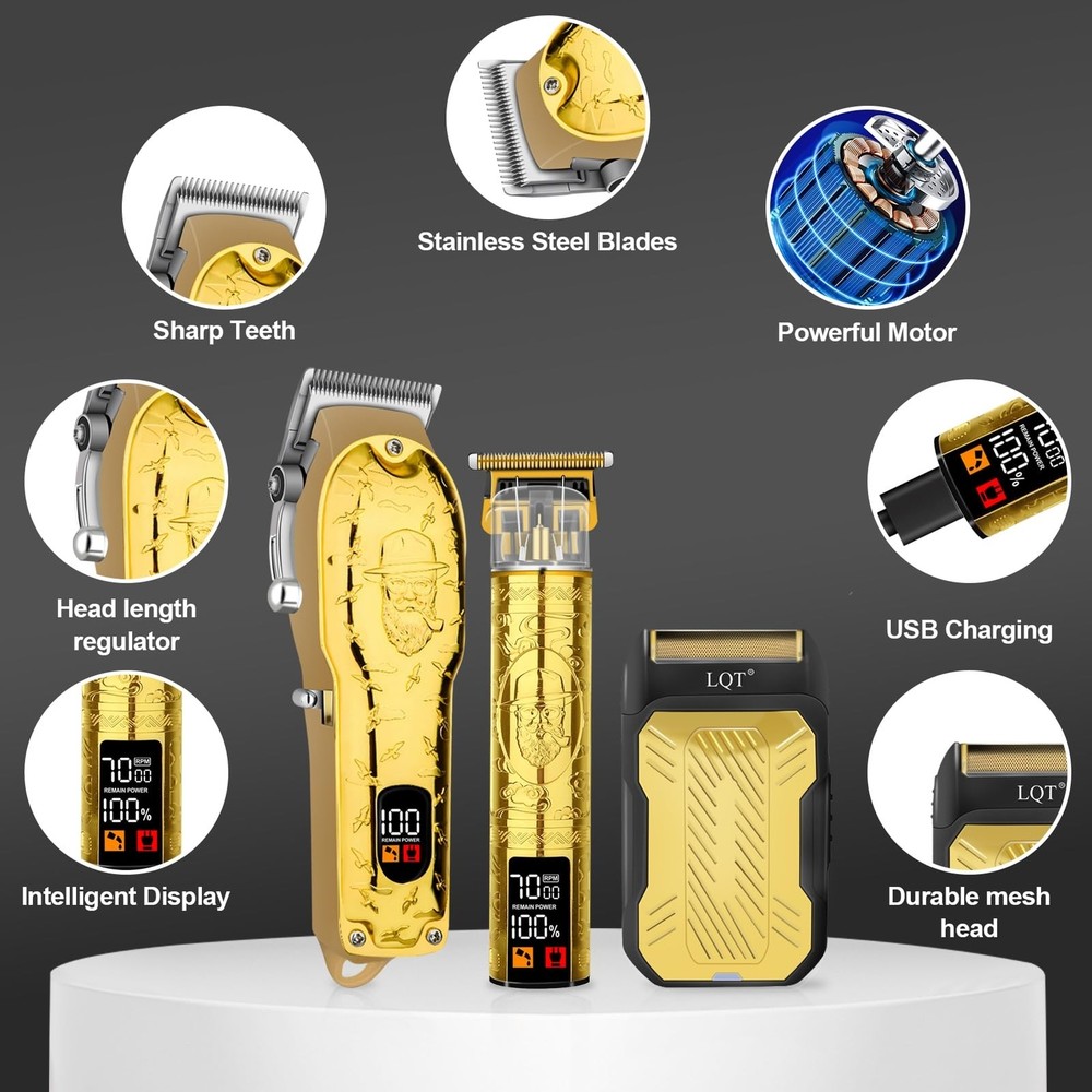 Professional Hair Clipper Set for Men Electric Shaver Razor Cordless Hair Cutting Barber Clippers Beard Trimmer Men’s Grooming Kit Gifts for him (Gold) Product Details Color: Gold Brand: LQT MPN: LQT-300 kit UPC: 797999867508 EAN: 0797999867508 Brand: LQT Battery Description: Lithium-Ion Included Components: Barber Cape, Guide Combs, Cleaning Brush, T-blade Trimmer, Hair Clipper, Barber's Comb, USB Cable See more Runtime: 2 hours Unit Count: 1 Count Package Dimensions : 11.93 x 7.87 x 3.43 inches; 2.55 Pounds Item model number : LQT-300 kit Batteries : 1 Lithium Ion batteries required. (included) Date First Available : November 8, 2024 Manufacturer : LQT Country of Origin : China PROFESSIONAL HAIR CLIPPERS SETThe LQT professional hair clipper set perfectly matched to create any hairstyle you want,metal embossed body design,unique scissors logo,this haircut kit not only can show your style taste,but also meet your daily haircut needs,perfect for home use,barbershop and travel. UPGRADE ACCESSORIES The LQT clippers for men equipped with 4 guide combs(,3,6,10,13,mm) ,The T-blade trimmer equipped with 4 guide combs (1.5,2,3,4,mm),a barber cape,3 cleaning brush, 3 USB charging cables,a barber's comb, Suitable for both professional in a salon or barbershop and home hair cuts as well as beard trimming. Powerful motor and large capacity batteryThe LQT hair clipper contains a high-capacity battery that can be used for 120 minutes after 2 hours of charging. The engraving machine can be used for 3 hours after 3 hours of charging. The shaving machine can be used for 160 minutes after 1.5 hours of charging, and can be connected to a USB adapter, laptop, and car charger using the USB charging port. SUPER SHARP & SKIN-FRIENDLY BLADEThe blades are made up of high quality stainless steel,men hair clippers allow you to easily design your hairstyle and shape the edges. Full metal body, Sharp and safe blade design,Even if you trim the thickest hair, it will not pull any hair. The R-shaped obtuse edge design makes gentle contact with the skin and will not harm your skin. Only the blades can be rinsed,easy to clean. Gifts for Men & Women This electric trimmer set can satisfy daily hair trimming and can also be used as an electric shaver for shaving and trimming body hair, etc.It is an all-in-one set and is very suitable as a gift for a partner who likes to trim hair at home. It can be given as a birthday gift, Christmas gift, Valentine's Day gift, Father's Day gift, Mother's Day gift.