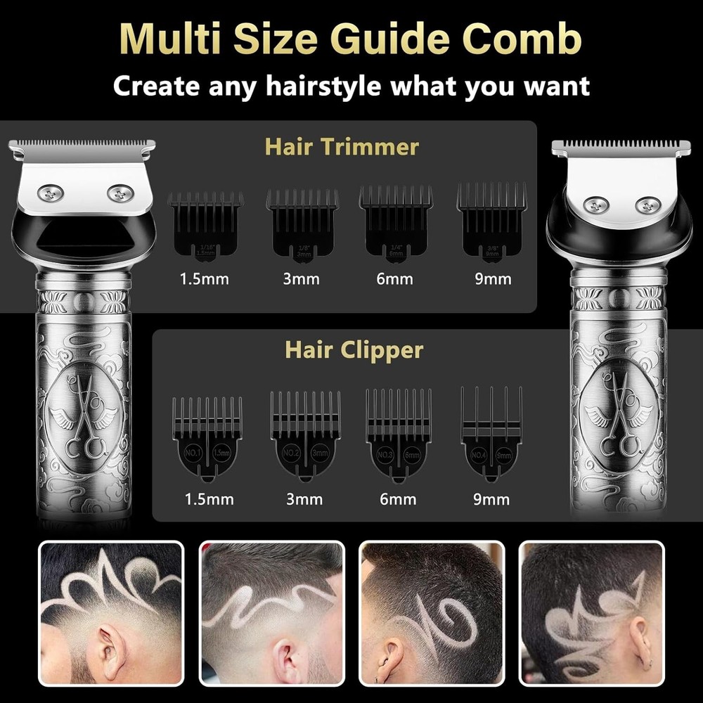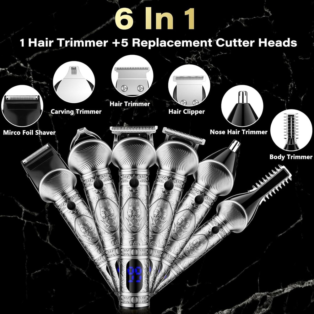 Beard Trimmer for Men, Hair Clipper Trimmer for Men, Cordless Beard Grooming Kit Description : [6 in 1 Beard Grooming Kit] -The beard trimmer grooming kit includes 6 detachable trimmer heads, a T-blade body nose hair face trimmer equipped with 4 guide combs (1.5/3/6/9mm), a hair cutting razor equipped with 4 guide combs (1.5/3/6/9mm), a design trimmer, a micro shaver, a nose trimmer, a body shaver. The The beard trimmer includes 18 accessories, meet the daily electric trimmer's needs. [ Zero Gapped & T-Blade] - The zero gapped t-blade clippers is made of high quality stainless steel with self-sharpening capability. Beard trimmer for men is sharp enough to cut through fine, coarse and thick hair/beard without pulling hair or hurting the scalp. The hair clippers blade (not the body) can be rinsed under running water and be included brush for thorough cleaning. [ Powerful Motor ]- Full metal body design, comfortable grip, 6 replacement heads are very easy to install. Equipped with a powerful 6200 RPM motor and self-sharpening blade. You can easily trim hidden hairs with the electric trimmer, even in narrow areas such as the abdomen, back and buttocks. The silent upgrade motor allows you to sleep at night and in the morning without disturbing your family. [ LED Display & USB Fast Charge] - Professional close hair and beard trimmer for men has a large built-in smart LED display that shows the battery level and reminds you to recharge for trimmer for men. Plus Type-C fast charging, hair clippers for men can be fully charged in just 2 hours and can shave for 180 minutes on a full charge. No more worry about the electricity of the beard trimmer. [Ergonomic Design ] - Electric razor for men use for body/beard/face/nose/ear hair trimmer easy to hold and use, you can hold the trimmer for a long time, but hand and arm won't feel sore. Weighing less than 200g, hair clippers is easy to use even for women, beginners. Retro body design, atmospheric and aesthetic, sure your husband/dad/boyfriend will love this.