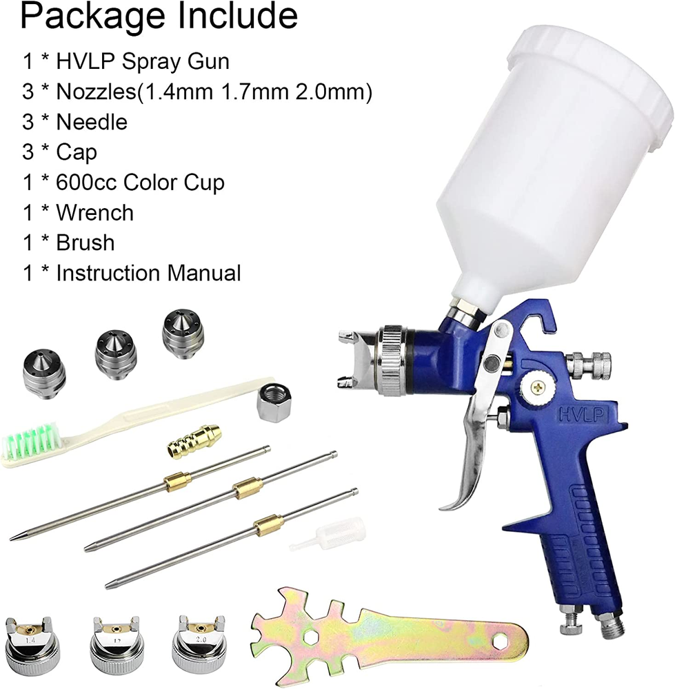Application of HVLP Paint Spray Gun: This is a great car paint spray gun with 600cc cup for car primer,furniture surface painting,wall painting, art craft, automotive paint, cloth spray,base coatings. 3 Nozzle and 3 Needle: In order to achieve the effect of spraying, we will give three additional replaceable 1.4mm 1.7mm 2.0mm nozzle needle caps in this hvlp spray gun set, which can fully meet your needs.Please test and adjust the spray gun to the desired state with water before use.The pigment you are using needs to be diluted and operated according to the manufacturer's requirements to achieve a good spraying effect Practical Spray Gun: Use HVLP spray gun kit to reduce spraying. The gravity feed design helps to reduce the waste of residual material in the color cup, thereby helping you save costs and materials. What a practical spray gun it is! Durable and reliable: Materials of the needle and nozzle of the HVP spray gun are made of high-quality stainless steel, which is sturdy and durable, can be used for a long time, wear-resistant and scratch-resistant. Easy to Use and Clean: The nozzles of the hvlp spray gun is made of high-quality stainless steel, which is easy to clean the surface of the spray gun. In addition, the spray gun is lightweight and easy to operate, suitable for beginners and professionals. Product Description HVLP Spray Gun with 3 Nozzles 1.4mm 1.7mm 2.0mm, ideal for various surface spraying, suitable for car prime,automobile spraying, furniture spraying,cloth spraying,wall painting,base coatings and painting spraying.Save time and effort with a large spray pattern and enjoy a smooth spraying experience! Package Include 1 × HVLP Spray Gun 3 × Nozzle(1.4mm 1.7mm 2.0mm) 3 × Needle 3 × Cap 1 × 600cc color cup 1 × Wrench 1 × Brush 1 × Instruction manual Multi-function Hvlp Spray Paint Gun Good Helper for Paint Spraying This is an excellent car paint spray gun, equipped with a 600cc cup, suitable for car primer, furniture surface painting, wall painting, art craft, car paint, cloth spraying and base coatings. HVLP technology helps to reduce the waste of residual material in the color cup, thereby helping you save costs and materials..Air sprayer gun is lightweight and easy to operate, suitable for beginners and professionals. Cleaning brush and wrench for easy clean up. Air cap prevents paint from splashing. Mesh filter can filter dirt particles in paint 600cc PVC color cup is transparent to better check the paint level and save time. Replacable 1.4mm 1.7mm 2.0mm Nozzle Needle Cap We provide three types of nozzles with a diameter of 1.4mm / 1.7mm / 2.0mm to better meet your needs!The direction of 360° can be adjusted. 600cc Color Cup 600ml PVC plastic color cup is more durable and resistant to falling than ordinary pots, high spraying efficiency and it is more convenient to clean. 3 Control Knobs Fluid control adjusts the amount of spray paint, pattern control adjusts the fan pattern size, and the air conditioning valve provides the ability to adjust the air flow rate. It is designed to provide uniform spraying and particle size for all types of surface coatings. Specification Work Pressure:0.2-0.4(Mpa)/29-58PSI Air consumption: 200L/min/7CFM Spraying Distance:250mm Nozzles Size: 1.4mm,1.7mm, 2.0mm Air Inlet: 1/4 bsp Spray Width :250mm Capacity of Cup(ml): 600ml Nozzle Material: Stainless steel Color Cup Material: Plastic Strong Point Easy to operate 600cc Color Cup Lightweight and compact Gravity feed design to save cost Replacable 1.4mm 1.7mm 2.0mm Nozzle Needle Cap Wide Application Air Spray Gun for Art Craft HVLP Sprayer Gun for Wall Painting Spray Paint Gun for Car Painting