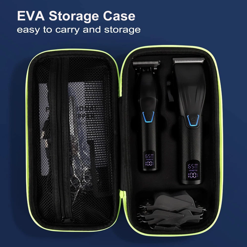 COMPLETE MENS GROOMING KIT: This professional hair cutting kit features a full size hair clipper with 8 metal guide combs, a detailed hair trimmer with 4 guide combs, EVA storage case, 2 scissors, cleaning brush, barber comb,cape, 2 charging cables. Suttik complete hair clippers set has everything you need for a successful haircut at home or salon. SMOOTH CUT: Suttik hair clippers adopts self-sharpening precision ground blades that can cut through all hair types and stay sharp longer. This clippers and trimmers set with powerful heavy duty motor is available in a variety of styles to meet your home hair cutting and personalized needs. BATTERY LIFE & LCD DISPLAY: Built-in rechargeable large capacity and premium battery, the hair clipper can work for 150 minutes after 2.5 hours charging, the hair trimmer can work for 180 minutes after 2.5 hours charging. Incorporated LCD screen displays the battery status and rotational speed. DETAIL TRIMMER: This hair trimmer is equipped with a precision T-shaped blade that can be near zero gapped distance. Ideal for cleaning up around necklines, sideburns and beard. CONVENIENT STORAGE: With this high quality EVA storage case, you can easily organize your barber tools after each haircut. Lightweight and compact to fit in your backpack, or luggage for improved traveling protection. 100% SATISFACTION GUARANTEE: Purchase our hair clipper with no-risk, any problems of our hair clipper set within 30 days, replacement or refund will be provided.Please contact us if you have any problem,we will surely provide you 100% satisfaction solution. Product Description Suttik Professional Hair Clippers and Trimmers Set Here is good news for you! Those who are stuck at home, can’t find a salon nearby, or who need a professional premium hair clippers set for barbers or anyone who want to cut hair by themselves. This Suttik professional cordless hair clippers set is a must have, it contains everything you need to have a professional cut right in the comfort of your own home or salon. This high-end hair clippers allow men to blend barbershop-quality taper fades easily as well as achieve a variety of cuts and styles. Warm Tips: Please switch off the hair clipper before charging and connect to the power supply Never charge the product above 104 degrees Fahrenheit heat source or below 32 degrees Fahrenheit environment. Only the professional are allowed to replace the battery with the same type if it is necessary. If the battery is completely used up, the indicator light will not light up immediately, but light up after a few minutes. Barber Clippers Professional Set: What will you get? 1*Hair Clipper (no oil) 1*Hair Trimmer 2*USB Charge Cable (no adapter) 12*Clipper Guards 1*Long Comb 1*Apron 2* Scissors 1*Storage Carrying Case 1*Cleaning Brush Specification: Power: 10W Cordless: Yes Charging Time for Hair Clipper: 3 hours Working Time for Hair Clipper: 2.5 hours Charging Time for Hair Trimmer: 3 hours Working Time for Hair Trimmer: 3 hours 4 Speed Option for Hair Clipper: 5000-6500 RPM 3 Speed Option for Hair Trimmer: 5500-6500 RPM Professional Hair Clippers for Barber This complete barber clippers and trimmers set meets all your styling needs, you can easily create a variety of fashion hairstyles. Sharp Carbon Steel Blade Designed with a high quality carbon steel blade, this sharp & durable head will offer you fast, smooth, and precise hair cutting. Excellent Battery Performance Cordless hair clipper is equipped with a rechargeable battery, that gives you 2.5 hours of non-stop operational capacity when fully charged. EVA Storage Carrying Case Barber clippers case made of premium EVA material, with good shock resistance and waterproof. It provides a full range of protection for haircut kit. Smart LCD Display Incorporated built-in digital display to show the remaining power as well as charging status and rotational speed indicators. USB Universal Charging The rechargeable clipper has a long-lasting battery life and can be charged by USB or adapters for ultimate convenience.