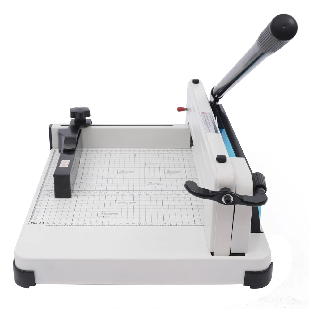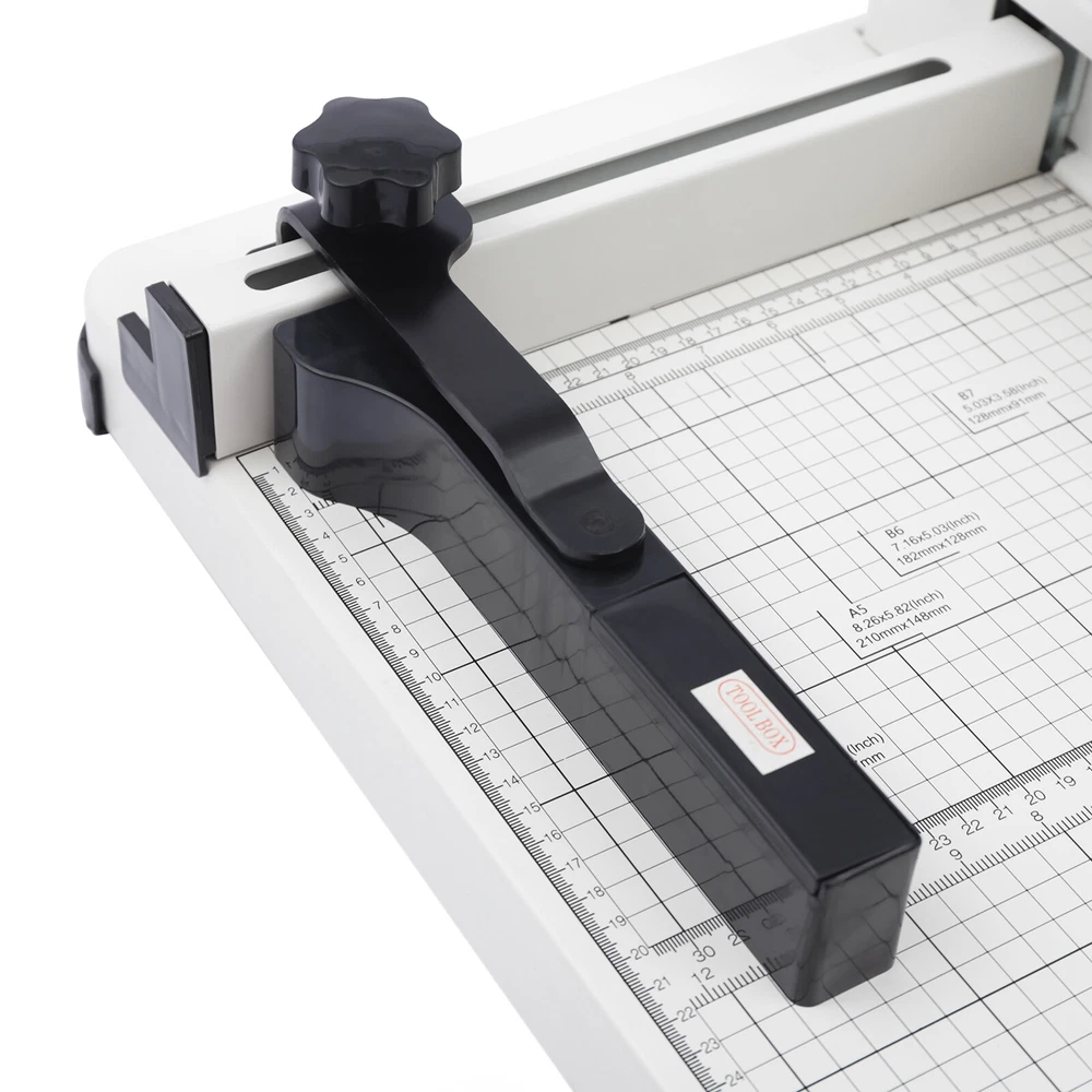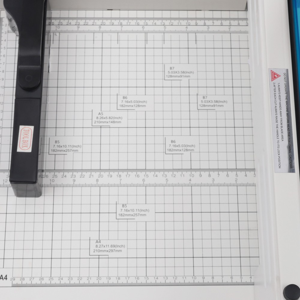Specifications Style: Simple, Modern Material: Cold Rolled Steel, HSS High-Speed Steel, ABS Process: Plastic Spraying Color: White Operation Mode: Manual Max. Cutting Thickness: 40mm/1.57in Max. Cutting Capacity: 400 Sheets of A4 Papers Paper Size: A4, B5, A5, B6, B7 Base Size: 53*39cm/20.87*15.35in Product Size: 70*39*33.5cm/27.56*15.35*13.2in Package Size: 60*44*24cm/23.62*17.32*9.45in Gross Weight: 16kg/35.27lbs Package Included 1* Manual Paper Cutter 1* English Manual Other Accessories for Use Professional Paper Trimmer Office Manual Guillotine A4 Papers Cutter Heavy Duty Description Our manual paper cutter is made of high-quality cold-rolled steel and ABS which is durable and has a long service life. Its blade is very sharp and can cut up to 400 sheets of A4 paper at a time. It has a double safety structure, including a safety lock and safety shield to prevent accidents. Its handle uses the principle of leverage to make cutting paper very effortless. Key Features Excellent Material: This manual paper cutter is made of high-quality cold-rolled steel and ABS which is wear-resistant and rust-resistant. Therefore, it is durable, sturdy, and has a long service life. Sharp Blade: This manual paper cutter's blade is made of HSS which is hard, sharp and durable without burr to achieve neat and easy cutting. And the blade is replaceable. Scale Panel: This manual paper cutter has a precise scale on the panel, and the scale is accurate to millimeters, so you can accurately cut the paper into different sizes. User-Friendly Handle: This handle is made of ABS which is durable and comfortable. It is ergonomically designed and uses the lever principle to make cutting paper effortless. Large Cutting Capacity: The cutting thickness of this manual paper cutter reaches 1.57in. It can cut 400 sheets of A4 paper at a time, which is highly efficient and time-saving. Space-Saving: The manual paper cutter takes up a small area of your space because its footprint is 20.87*15.35in. It would save your room space. Positioning Ruler: This manual paper cutter has a positioning ruler that holds the paper to make cutting easier. You can adjust it to the best position according to the paper size. Rotating Paper Press Handle: This manual paper cutter uses a rotating pressure paper handle that adopts the principle of leverage and is effort-saving, easy and convenient. Easy To Clean: Because of its smooth surface , you only need to wipe it with a cloth, and then it will shine like a brand-new one. Customer Service: We aim to provide quality products and services. If you have any problems, please feel free to contact us. We will reply and solve the problem for you as soon as possible. Details Anti-Slip Footbeds : This manual paper cutter has four rubber anti-slip footbeds on the bottom, which keeps the machine stable while cutting paper for your convenience. Safety Lock: This manual paper cutter has a safety lock, which can prevent accidents. Translucent Shield: The translucent guard prevents hand injuries and debris from entering the blade while cutting. Multi-Functional Bracket: This manual paper cutter has a multi-functional bracket to support the paper that has already been cut, making it more convenient to use. And it can be flipped up and down. Hidden Tool Storage Box: This manual paper cutter has a hidden tool storage box that can store some installation tools, which is convenient and makes the cutter neater. Plastic Spraying: This manual paper cutter adopts a plastic spraying process, which makes the product delicate, anti-wear, waterproof and rust-resistant. One-piece Knife Changing Bracket: The one-piece knife changing bracket that is a reasonable structure design, enables easy blade replacement. Metal Rail: Metal rail can make the positioning ruler move smoothly to bring a more accurate position. Application It can cut all kinds of paper, such as A4, B5, A5, B6, and B7 in small printing houses, institutions, groups, colleges, libraries, and reference rooms. Operation Steps 1. Please check whether the product is intact or not. 2. Take out the tools in the toolbox. 3. Use the tool to remove the fixing screw of the paper press handle. 4. Change the direction of the paper press handle, and tighten it with screws. 5. Turn the paper press handle counterclockwise to raise the pressboard. 6. Positioning ruler can be adjusted left and right to block the paper. 7. Turn the press handle clockwise and the paper will be pressed tightly. 8. Press the security lock button with the left hand, and press the paper cutting handle with the right hand. Specifications Style: Simple, Modern Material: Cold Rolled Steel, HSS High-Speed Steel, ABS Process: Plastic Spraying Color: White Operation Mode: Manual Max. Cutting Thickness: 40mm/1.57in Max. Cutting Capacity: 400 Sheets of A4 Papers Paper Size: A4, B5, A5, B6, B7 Base Size: 53*39cm/20.87*15.35in Product Size: 70*39*33.5cm/27.56*15.35*13.2in Package Size: 60*44*24cm/23.62*17.32*9.45in Gross Weight: 16kg/35.27lbs Package Included 1* Manual Paper Cutter 1* English Manual Other Accessories for Use Notes Please note that when pressing down the handle of the cutter, you need to open the safety lock to avoid damage to the safety lock. Please note that you need to remove the platen handle and change its orientation at the first use. Please note that a thickness of 40mm is the suitable cutting thickness. A force of about 500kN is required for cutting thicknesses over 40mm, which is not suitable for manual cutting. Please allow the slight color difference caused by the shooting light and 1-3cm error due to manual measurement, and make sure you do not mind before you place the order. Welcome to the ycmjbestgo ! We are committed to providing customers with better and more favorable products ! If you have any questions, please feel free to contact us ! Thank you for your support ! Welcome to the ycmjbestgo ! We are committed to providing customers with better and more favorable products ! I