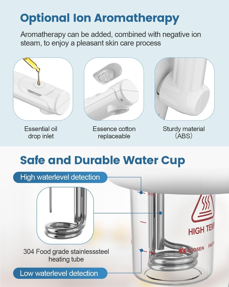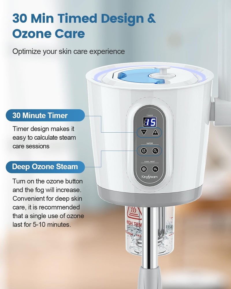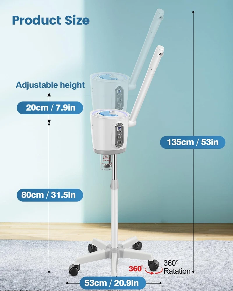 Facial Steamer, Facial Steamer for Home, Ionic Facial Steamer for Esthetician, Professional Nano Water Mist with Large Water Volume and 30 Min Timer for Beauty Salons 【Professional Facial Steamer for Estheticians】The facial steamer is expertly designed for both salon and home use, making it ideal for professional treatments. Its ionic steam deeply cleanses, opens pores, hydrates, and revitalizes skin, delivering spa-quality results for a fresh, radiant complexion at home 【30-Minute Timer with LED Display】Customize your skincare experience with the steamer’s 30-minute timer and clear LED display. Tailored for esthetician-level needs, this feature lets you enjoy a relaxing spa session 【Professional Ozone Facial Steamer】Equipped with an ozone switch, the steamer intensifies atomization, enhancing skin hydration and pore opening. This ozone steam helps dry skin retain moisture and can reduce acne and blackheads by promoting deeper absorption and improved clarity 【Detachable, Height-Adjustable Design】With a detachable, easy-to-clean water cup and a height-adjustable stand, this steamer is built for convenience. Adjust the height and enjoy a 360° rotating nozzle, perfect for a personalized, comfortable treatment while sitting or lying down. The wheeled stand offers effortless mobility, suiting both home and salon use 【Practical Design】The steamer combines sleek aesthetics with functionality. Its long, adjustable spray arm enables comfortable positioning for optimal treatment. The 650ML water tank offers extended use, with stronger steam output than comparable models—delivering professional results in a stylish package