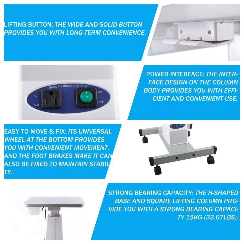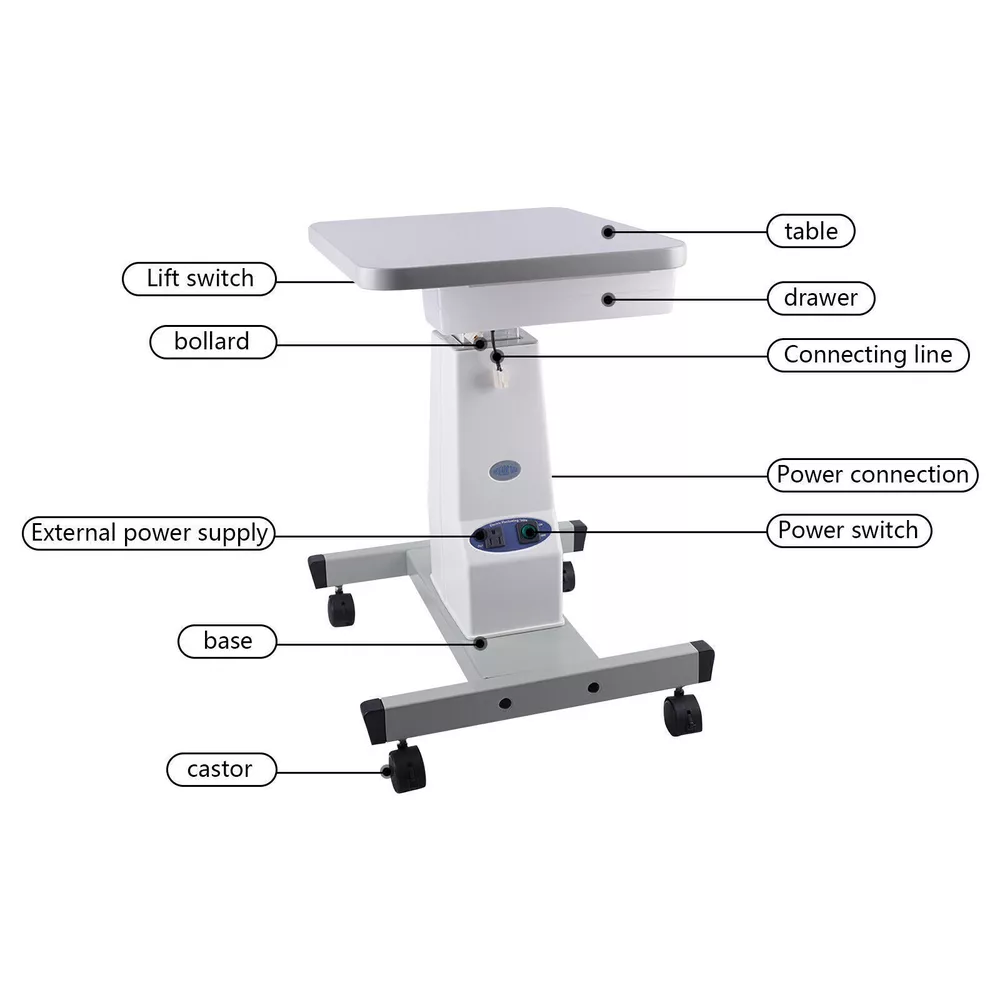 Specifications Color: White Material: Iron, Aluminium, Plastic, Paintless Board Surface Treatment: Blister Paint Motor: Big Power AC Motor Wheel: Fine Wheel Plug: US Standard Power Supply: AC 110 V/ 60 Hz Loading: 15kg/ 33.07lbs Adjustable Height Range: 60-82cm/ 23.62-32.28in Table Top Size: (L*W)40*48cm/ 15.75*18.9in Package Size: 61*53*26.5cm/ 24.02*20.87*10.43in Net Weight: 19kg/ 41.89lbs Package Included 1* Motorized Instrument Table 1* English User Manual All Needed Accessories Professional Ophthalmic Electric Optical Equipment Motorized Lifting Table Description Specifications Color: White Material: Iron, Aluminium, Plastic, Paintless Board Surface Treatment: Blister Paint Motor: Big Power AC Motor Wheel: Fine Wheel Plug: US Standard Power Supply: AC 110 V/ 60 Hz Loading: 15kg/ 33.07lbs Adjustable Height Range: 60-82cm/ 23.62-32.28in Table Top Size: (L*W)40*48cm/ 15.75*18.9in Package Size: 61*53*26.5cm/ 24.02*20.87*10.43in Net Weight: 19kg/ 41.89lbs Package Included 1* Motorized Instrument Table 1* English User Manual All Needed Accessories Details Soft Corners: The edges and corners of this product are smooth, and burr-free, which can effectively prevent bumps and scratches. Blister Paint: Its surface is treated with blister paint to give it good waterproof and anti-corrosion ability to prolong its service life. Application This motorized instrument table is widely used in vision healthcare institutions, optical stores, optometry training institutions, ophthalmic hospitals, and dentistry to lay slit lamp, optometry meter, cornea curvature and so on. Key Features Premium Material: It is made of high-quality iron, aluminium, and plastic, with good toughness, waterproof and corrosion resistance, so you can use it for a long time. Effortless Cleaning: Due to its smooth surface and waterproof characteristics, it can be easily cleaned with a damp cloth without much effort and time. Notes Please allow the slight color difference caused by the shooting light and 1-3 cm error due to manual measurement, and make sure you do not mind before ordering. Payment Delivery details Terms of sales About us Contact us Payment We accept ebay payment 。 Fees such as import duties, taxes are not included in the item price or shipping costs. These charges are the buyer's responsibility. Delivery details Shipping: 2-9 working days to: USA Terms of sales We maintain high standards of excellence and strive for hundred percent customer satisfaction. Feedback is very important to us. We hope that you contact us immediately before you give neutral or negative feedback, so that we can address your concerns. It is impossible to address issues if we do not know about them! About us Your satis faction is our ultimate goal. We work hard to earn your trust and future business. Our certified technicians have tested each item before shipping. The unit comes with 1 year limited warranty on all manufacturing defects. a) If you receive a defective item, you may return it or ask for a discount. Please contact us within 14 days after you receive the package. b) What you returned must be intact and in its original packaging as re? u. Customer is responsible for shipping costs of the returned item. c) We will cover the cost of shipping back t with the shipping rate indicated in the registration page. We will send you a new unit or refund the full payment you paid. Thank you. Contact us Business Hour Business Hour: Monday To Friday: 8:30 AM to 5:00 PM (Beijing China time) Due to time zones, our reply to your questions may not be immediately. But within above working time, we will reply your email within 24 hours. If it's non-workdays, please kindly be patient and wait till Monday. Please contact us with ebay message. Please feel free to contact us if you have any questions. Monday To Friday: 8:30 AM to 5:00 PM (Beijing China time) Due to time zones, our reply to your questions may not be immediately. But within above working time, we will reply your email within 24 hours. If it's non-workdays, please kindly be patient and wait till Monday. Please contact us with ebay message. Please feel free to contact us if you have any questions.