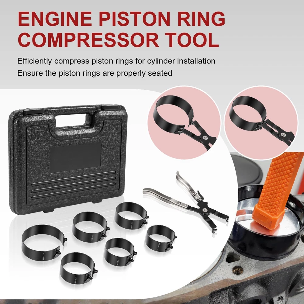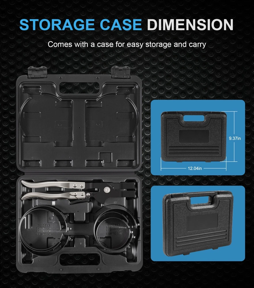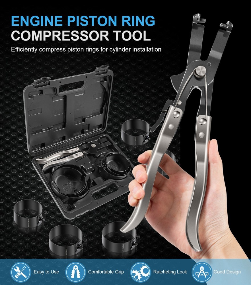 This piston ring compressor set is a game-changer for engine work! The heavy-duty pliers make installation smooth, and the labeled rings fit a wide range of engines—perfect for cars and trucks. The sturdy case keeps everything organized, and the ratchet action provides great leverage. No more struggling with rings—this set makes the job quick and easy. Highly recommended for DIYers and pros alike!