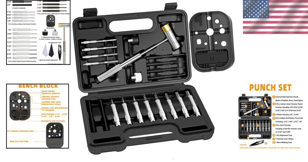 Professional Quality 12-Piece Punch Set with Detachable Hammer for Maintenance ‹ › ‹ › ‹ › ‹ › ‹ › ‹ › ‹ › ‹ › ‹ › Professional Quality 12-Piece Punch Set with Detachable Hammer Elevate your maintenance skills with this exquisite punch set, crafted for both professionals and enthusiasts alike. Perfectly designed for jewelers, watchmakers, carpenters, and anyone in need of precision tools, this set embodies quality, durability, and functionality. Key Features: Stable in Use: Made from high-grade 40# chrome vanadium steel, this punch set undergoes special heat treatment to ensure exceptional performance and longevity. All-IN-1 Set: Comprehensive collection of punches includes sizes 1/8", 9/64", 5/32", 3/16", 7/32", 1/4", 9/32", 5/16", plus 3/8" and 15/64" plastic pin punches, metal tweezers, and a hammer with 4 detachable heads. Bench Block: Featuring a specially finished surface to protect your materials, our bench block includes numerous grooves and channels for diverse maintenance tasks, enhancing your work experience. Detachable Hammer: Ergonomically designed with a non-slip grip, our chrome-plated steel hammer comes with four interchangeable heads for tailored usage: brass, chrome, nylon, and rubber. 3D Assurance: Crafted with precision and thoroughly tested, each punch and bench block has undergone rigorous quality checks and 3D simulations to guarantee outstanding durability and performance. Why Choose Our Punch Set? Investing in this Professional Quality 12-Piece Punch Set means embracing superior craftsmanship and versatility. Whether you are a novice or an experienced tradesperson, this all-inclusive set will meet all your tooling needs. Maintain and repair with confidence knowing that every tool is designed to provide precision and reliability. Perfectly organized in a sleek storage box, portability and accessibility is at your fingertips, making it easy to carry your tools wherever your creativity takes you. Experience the perfect blend of quality and functionality today—transform your approach to maintenance with our expertly designed punch set! Shipping Free & Fast Shipping - We offer free shipping to most of the USA with a normal delivery time of 3-7 days. However, due to the current situation, additional delivery time (up to 3 weeks) may be required for some items. Alternative Carriers - We may use alternative carriers (e.g. USPS, FedEx, UPS, etc.) to ensure your package arrives safely and on time. Due to the use of multiple carriers, we are unable to provide a tracking number automatically. Handling Time - Orders are processed and shipped within 1-2 business days of receiving cleared payment. Shipping Restrictions - Shipping to Alaska, Hawaii, Puerto Rico, Guam, and other US territories may incur shipping charges or delivery restrictions. Please contact us before ordering, or your order can be refunded/cancelled. State Restrictions - There may be restrictions based on your state of purchase. For example, certain items may not be shipped to California due to state regulations. Contact for Tracking Updates - If you require tracking updates or have any concerns about the delivery of your order, please feel free to contact us, and we will be happy to assist you. Return 30-Day Hassle-Free Returns - We want you to be completely satisfied with your purchase. If you are not, you can return the item within 30 days of receiving it for a full refund or exchange. Easy Return Process - To start a return, simply contact us and we will provide you with a prepaid return shipping label and detailed instructions. Restocking Fee - There are no restocking fees for returns. However, the buyer is responsible for return shipping costs if the return is not due to a seller's error. Refund Processing Time - Refunds will be processed within 5 business days of receiving the returned item in its condition. Payment We accept all major credit cards, PayPal, and Apple Pay for your convenience. Your payment information is secure and encrypted to ensure a safe and seamless transaction. Please complete your payment within 3 days of purchase to avoid any delays in shipping. Feedback Your feedback is extremely important to us. We strive to provide the best products and customer service possible. If you are satisfied with your purchase, please take a moment to leave us a positive review. If you have any concerns or issues with your order, please contact us before leaving negative feedback. We are committed to resolving any problems and ensuring your satisfaction. Contact Us If you have any questions or concerns, please feel free to out to our customer support team. You can contact us through the eBay messaging system. We are available Monday to Friday, 9:00 am to 5:00 pm EST, and we will do our best to respond to your inquiry within 24 hours. Buy it now and enjoy a pleasant shopping experience! Item Diameter: 14.8 Item Weight: 2.9 pounds Unit Quantity: 1 Material: Carbon Steel,Chrome Vanadium Steel,Metal,Plastic,40# Chrome Vanadium Steel Type: Punch Set Number of Pieces: 12 Color: Multicolor Unit Type: lb
