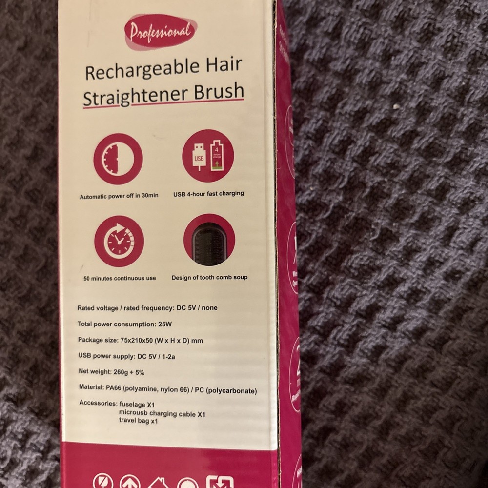 The Professional Rechargeable Hair Straightener Brush is a mini cordless styling tool designed for both men and women. With a sleek black design and ceramic heating plates, this straightening brush offers three temperature settings to suit all hair types. Powered by a 35W battery, this versatile hair styling tool provides professional results with the convenience of being rechargeable, making it a must-have for anyone looking to achieve sleek and salon-quality hair at home.