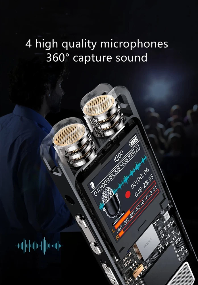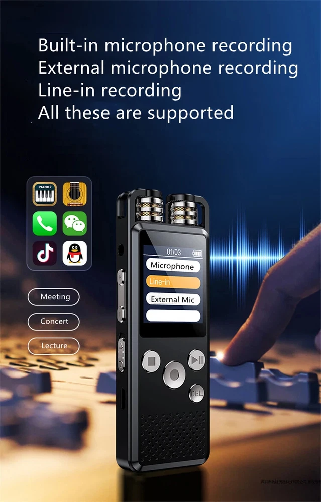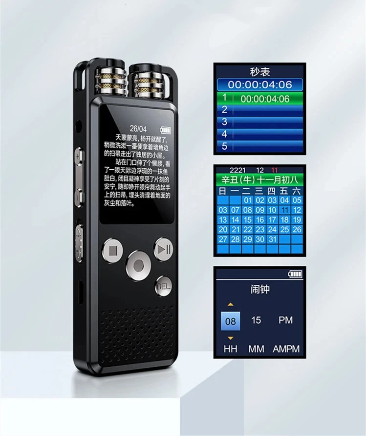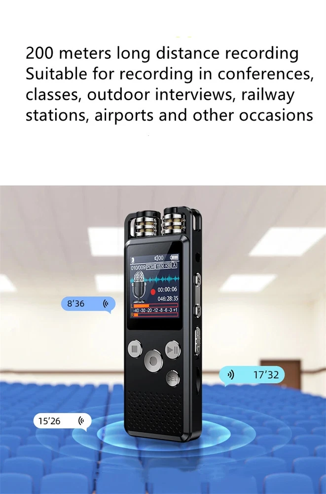 KP666 digital voice recorder voice-activated Dictaphone High - Definition noise reduction recording MP3 music player Features: Built-in 4 microphones 360°capture sound. 1536KBPS High - Definition noise reduction PCM recording. Support smartphone, PC, Electric Piano line-in recording . Supports the dual channels stereo MP3 music play with equalizer, interesting and practicable. Voice-activated , Timing recording, Bookmarks, variable speed playback, repeat between any A-B point, Automatic segmentation saving. Voice-to-text . 24 hours continues recording. E-books, alarm clocks, stopwatches, calendar extras, 18 languages. This is the most cost-effective high-quality voice recorder. It can meet all your recording needs. It supports built-in microphone recording, external microphone recording, and Line-in recording. The speech-to-text function with an accuracy rate of more than 98% makes your interviews, meeting records, and class record easy from now on. It has 4 built-in high-quality omnidirectional microphones that capture the details of every sound in 360°. Clearly restore live sound. Large-scale conferences, halls, outdoor interviews, railway stations, airports, 200 meters long-distance recording. Acoustic DSP dynamic noise reduction, AGC, one-key noise reduction switch, pick up clear original sound in different environments. From 32Kbps-1536Kbps, a variety of bit rates sets are optional. two-channel stereo recording, the recording is delicate and real, with clear layers and no distortion. This device support voice-activated recording, automatically start recording when there is sound in the surrounding environment, and goes to sleep when there is no sound. This machine has built-in 8GB, 16GB memory, supports the memory card expansion to 128GB. The memory card in the picture is for reference only. Press the record button on any interface to start recording, and the user can arbitrarily set the duration of segmented storage within 30-240 minutes. This machine has built-in high-power stereo speakers, 8 sound effects modes, supports equalizer, and works well for playing recordings or music. In addition, it also supports TXT e-book reading, music alarm clock, stopwatch, calendar, and other additional functions. Make your life easier from now on. Specification: Dimensions:100*37*13mm Weight: 79g Color: Black Material: Metal Memory: Built-in 8GB, 16GB,32G Recording format: WAV/MP3 Bitrate: 32Kbps- 1536Kbps optional NSR:≥70db Frequency:20Hz-20KHz Microphone: 4 large-scale high sensitivity microphones Working time: Continue Recording around 14 hours, Playback with speaker for around 15 hours. Music format: MP3,WAV,WMA,APE,FLAC Support Equalizer: off / rock / funk / Hippop / jazz / classical / electronic music / custom for optional. Recording mode: Voice-activated / manual control/Line-in recording/Timed recording Voice-activated Recording: Yes Earphone:3.5mm stereo earphone Built-in battery: built-in lithium-polymer battery Listening to songs with headphones can last for 28 hours. Connect: Micro USB2.0/OTG Working Temperature: -5~45℃ Package Includes 1 x Digital Voice Recorder MP3 1 x USB Cable 1 x Earphone
