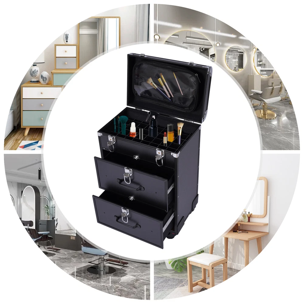 💖 WELCOME 💖 Rolling Aluminum Makeup Train Case Salon Cosmetic Trolley Travel Organizer Box Description This is a movable multi-layered makeup case designed for professional beauty artists to make up anytime and anywhere. This rolling makeup case is constructed of high-quality aluminum alloy that is sturdy and durable. It has extra large capacity compartments and multi-layer drawers. This case is ideal for all people who love beauty or nail art. Specification Number of Layers: 3 Color: Black Material: Aluminum Alloy Frame and Plastic Fireproof Board Panel Shape: Rectangular Processing Method: Frosted Rolling Wheel Style: Universal Wheel Carrying Parts: Retractable Handle Gross Weight: 9kg/ 19.8lbs Net Weight: 7.5kg/16.5lbs Package Size: 57*42*32cm/22.4*16.5*12.6inch Product Size: 36*23*58cm/14.2*9.1*22.8in Maximum Load: 50kg/110.3lbs Key Features High-quality Materials: The frame of the makeup case is wrapped with high-quality aluminum alloy, which will not easily rust and fade. And the thicker, all-aluminum drawbar makes the case more stable, refusing to shake. Large Capacity: This makeup case has 3 layers, the top layer can store nail polish or lipstick; the bottom two drawers can store full-size cosmetics and beauty appliances, such as perms, manicure machines and light therapy supplies. This multifunctional product can meet your storage needs. Excellent Weight-bearing Capacity: The rectangular construction and aluminum alloy frame give the case a superb load-bearing capacity (up to 110.3 lbs). You can safely put all your hair and beauty tools on it. Sorted Storage: Beauty products with different functions and sizes are stored in the corresponding drawer and compartment, making the tools ranged orderly, so it is convenient for you to quickly find the tools you want. Easy to Move and Carry: The universal wheels are easy to move and very convenient, especially for nail salons and beauty salons that have a lot of tools and need to move frequently. And it comes with a telescopic pull bar (maximum length is 32.7inchs) and a top handle, which is easy to carry on trips and business trips. Stylish Appearance: This rolling make-up case gives a stylish and exquisite look with its simple construction and stylish black. Such a retro make-up case will decorate your dressing room well and make a good impression when you are working outside. Secure & Reliable: The metal locks of the case protect the contents securely and the lockable design ensures security and privacy. Worry-free Service: We have been working hard to provide better service and quality for our customers, which is our goal. If there is any quality problem with our products. Please contact us in time. Details Transparent Storage Bag: The transparent storage bag on the inside of the lid allows for wet and dry storage, for example, you can store wet beauty eggs and powder puffs to avoid cross-contamination. Rounded Edges: The top of the cosmetic case has been designed with rounded corners rather than sharp edges to avoid scuffing. Reinforced Lock: Reinforced lock not only makes it convenient for you to open and close, but also does not affect the appearance, and solves the embarrassment of bursting when going out. Application This rolling make-up case is suitable for professional make-up artists, hairdressers, nail technicians, and beauticians in beauty centers, salons, private homes, parties, and other occasions. Package Included 1 x Makeup Case 4 x Universal Wheels 2 x Keys Payment Delivery details Terms of sales About us Contact us Payment We accept ebay payment 。 Fees such as import duties, taxes are not included in the item price or shipping costs. These charges are the buyer's responsibility. Delivery details Shipping: 2-9 working days to: USA Terms of sales We maintain high standards of excellence and strive for hundred percent customer satisfaction. Feedback is very important to us. We hope that you contact us immediately before you give neutral or negative feedback, so that we can address your concerns. It is impossible to address issues if we do not know about them! About us Your satis faction is our ultimate goal. We work hard to earn your trust and future business. Our certified technicians have tested each item before shipping. The unit comes with 1 year limited warranty on all manufacturing defects. a) If you receive a defective item, you may return it or ask for a discount. Please contact us within 14 days after you receive the package. b) What you returned must be intact and in its original packaging as re? u. Customer is responsible for shipping costs of the returned item. c) We will cover the cost of shipping back t with the shipping rate indicated in the registration page. We will send you a new unit or refund the full payment you paid. Thank you. Contact us Business Hour Business Hour: Monday To Friday: 8:30 AM to 5:00 PM (Beijing China time) Due to time zones, our reply to your questions may not be immediately. But within above working time, we will reply your email within 24 hours. If it's non-workdays, please kindly be patient and wait till Monday. Please contact us with ebay message. Please feel free to contact us if you have any questions. Monday To Friday: 8:30 AM to 5:00 PM (Beijing China time) Due to time zones, our reply to your questions may not be immediately. But within above working time, we will reply your email within 24 hours. If it's non-workdays, please kindly be patient and wait till Monday. Please contact us with ebay message. Please feel free to contact us if you have any questions.