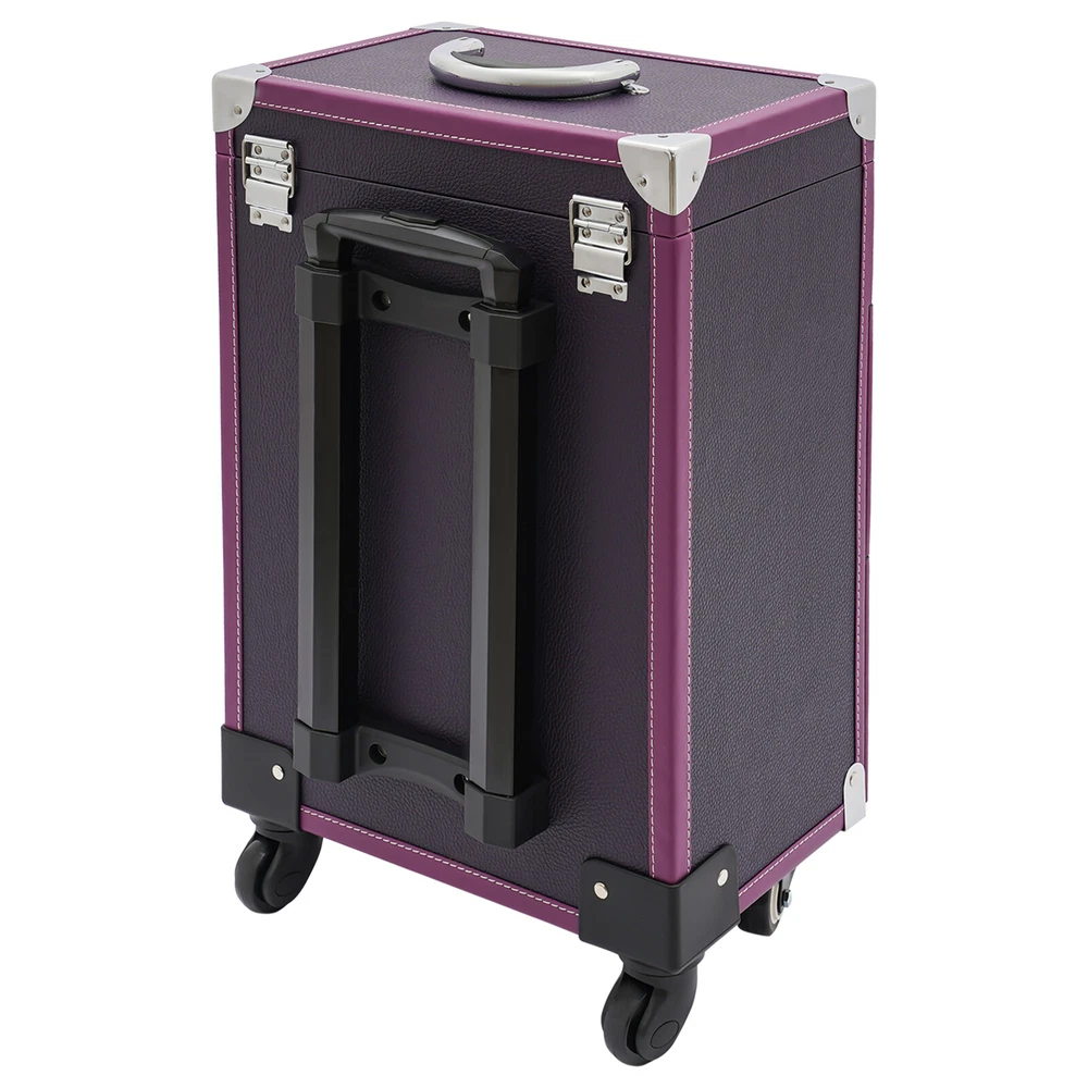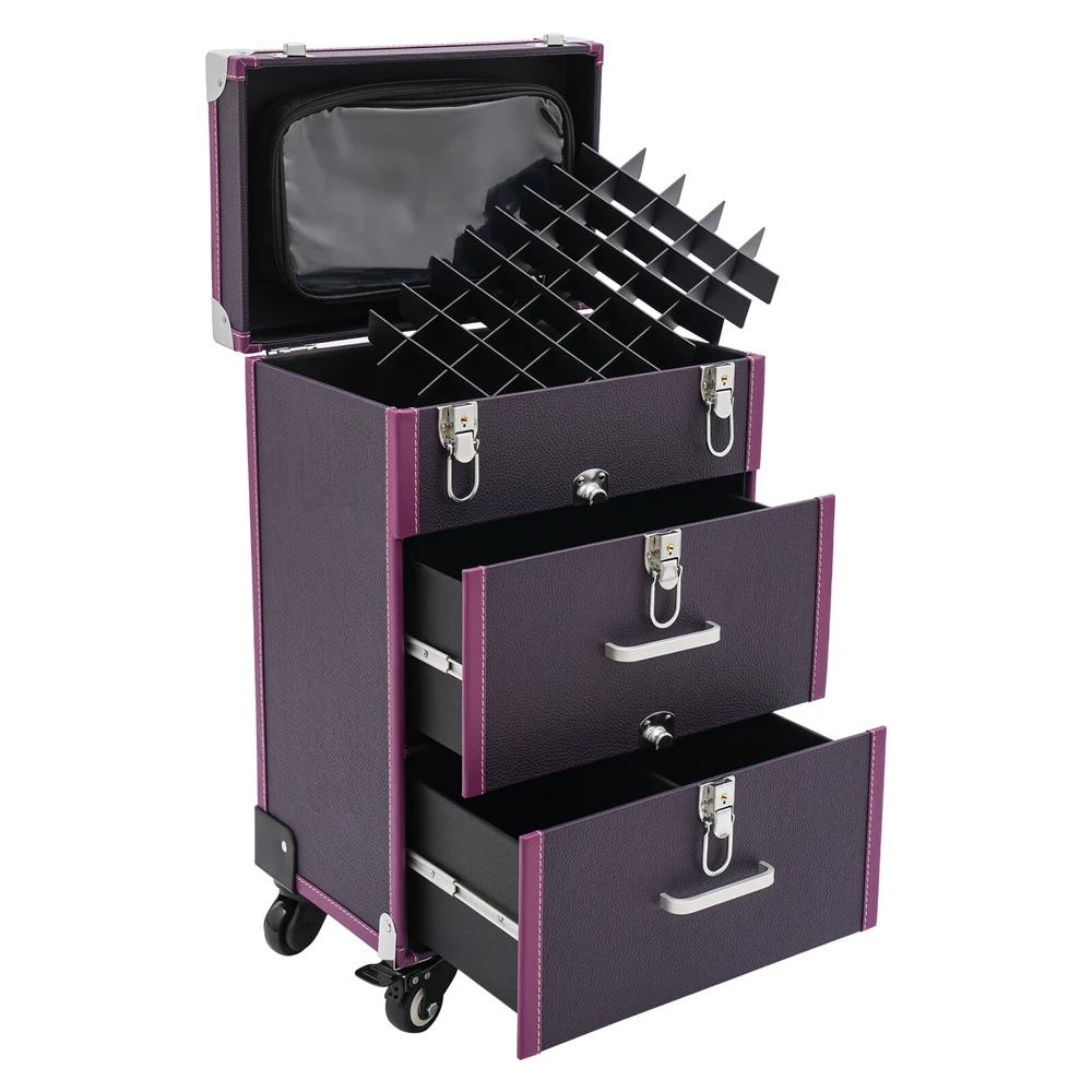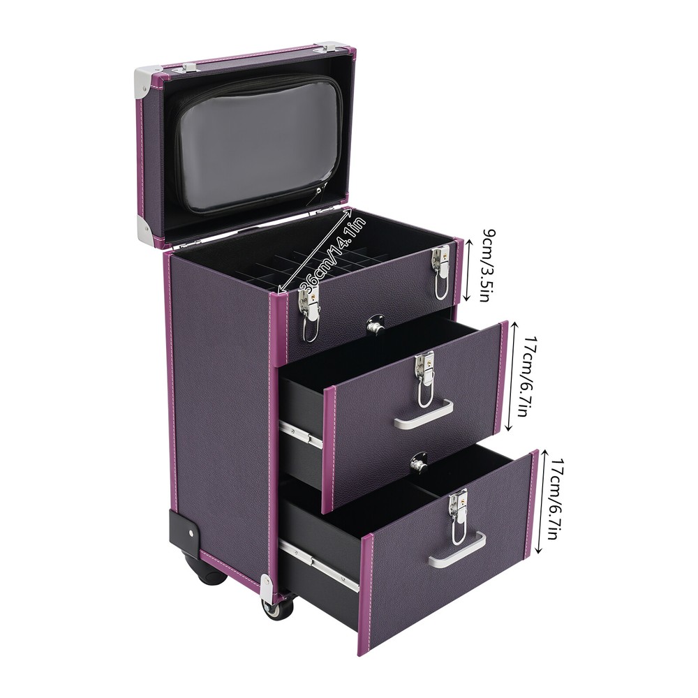 Description A good makeup case is essential for makeup artists. The rolling makeup case is made of high-quality materials, sturdy and durable. The large capacity design allows you to partition and store different cosmetics, hair tools, and more. With the minimalist style, universal wheels, retractable pull rod, and comfortable handles, it makes your make-up work more convenient! Key Features Premium Materials: This product is made of high-quality PVC and aluminum alloy, which is corrosion-resistant, wear-resistant, and not easy to fade, ensuring a long service life. Large Capacity: The two drawers at the bottom allow you to store curling irons, hair dryers and other large items, The large compartment with 45 slots makes it easy to store nail polishes and lipsticks, it is also removable Professional Makeup Train Case Rolling Cosmetic Travel Organizer Suitcase Description A good makeup case is essential for makeup artists. The rolling makeup case is made of high-quality materials, sturdy and durable. The large capacity design allows you to partition and store different cosmetics, hair tools, and more. With the minimalist style, universal wheels, retractable pull rod, and comfortable handles, it makes your make-up work more convenient! Key Features Premium Materials: This product is made of high-quality PVC and aluminum alloy, which is corrosion-resistant, wear-resistant, and not easy to fade, ensuring a long service life. Large Capacity : The two drawers at the bottom allow you to store curling irons, hair dryers and other large items, The large compartment with 45 slots makes it easy to store nail polishes and lipsticks, it is also removable for easy cleaning. The clear bag makes it easy to store make-up brushes, foundations, eyeshadow palettes and other small items(all not included) for your convenience. Thanks to the hook and loop fastener design, you can easily detach the clear makeup bag to use as a separate small bag, which is very portable. Outstanding Load Capacity: The rectangular structure and high-quality materials give the case an excellent weight capacity (up to 110.23 lbs around). You can put all your hair and beauty tools in it with confidence. Protect Your Privacy: Locking latches securely protects valuables inside the case and maximizes your privacy. Flexible Movement: The easy-to-move silent universal wheels(with two brakes), telescopic pull rod, and case body handle make it easy to move the case up and down stairs, in and out of the car, and in the lift. Simple and Generous: The pleasing purple and silver color, three-dimensional structure, and smooth lines give the product a modern feel. Such a beautiful makeup case can nicely decorate your dressing room and make a good impression when you are out at work. Exquisite Gift : The exquisite design and large capacity make this product a great gift to your mother, girlfriend, sisters, wife, and loved ones engaged in the makeup industry. Easy Maintenance : A simple construction and smooth surface make this product easy to clean, you just need a towel and water to easily remove dust and residue. Details Wide Opening : With a wide opening (beveled edge length: 14.1in), it is easy for you to store and retrieve certain items without messing up other items in the drawer. 2 Keys : The configuration of two keys prevents the worry of losing or forgetting one key. It also enables you to open the case easily. Drawer Handle: It allows you to pull out drawers smoothly. Wrapped Corners: They can better protect the product from wear and collision, thus extending its service life. Application It is recommended for make-up artists from beginners to professionals such as freelance make-up artists, wedding make-up artists, celebrity make-up artists, and make-up interns. It can also be used for traveling or kept at home for makeup enthusiasts, hair barbers/stylists, nail technicians, estheticians, embroiderers, and crafters. Specifications Material: PVC, Aluminium Alloy, HDF, Rubber, Metal Color: Purple, Silver Style: Modern Shape: Rectangular Assembly Required: No Mounting Type: Floor Standing Wheel Type: Universal Wheel(2 with Brakes) Carrying Method: Hand-held, Hand-pulled Load Bearing Capacity: About 50kg/110.23lbs Applicable Nail Polish Bottle Height: 12cm/4.7in Length of Open Bevelled Edges: 36cm/14.1in Drawer Height: 17cm/6.7in, 17cm/6.7in, 9cm/3.5in Telescopic Rod Extension Height from Case: 45cm/17.7in Product Size: 36*23*57cm/14.1*9*22.4in Package Size: 64*42*33cm/25.2*16.54*12.99in Gross Weight: 8.3kg/18.3lbs Net Weight: 7kg/15.43lbs Package Included 1*Rolling Makeup Case 2*Keys Notes Please note that cosmetics are not included. Please use this product within its carrying capacity. Please be sure to lift the case by the top carry handle when going up the stairs. The service wear of the case is a normal phenomenon. In the process of daily use, please try to avoid excessive impact and drop to extend the lifespan of the product. Please clear the wheels in time to maintain smooth movement. Please use soft tools and water to clean. Please keep away from corrosive liquids. Please avoid long-term exposure to the sun. To avoid the case from tipping, please ensure the front wheels are facing forward and locked into place when stationed and in use. It's normal for the tie rod to wobble a little bit as it needs clearance to move back and forth better. If it is too tight, it will harm the tie rod instead. Please make sure you don't mind before purchasing. Please allow the slight color difference caused by the shooting light and 1-3cm error due to manual measurement and make sure you do not mind before ordering. Payment Delivery details Terms of sales About us Contact us Payment We accept ebay payment 。 Fees such as import duties, taxes are not included in the item price or shipping costs. These charges are the buyer's responsibility. Delivery details Shipping: 2-9 working days to: USA Terms of sales We maintain high standards of excellence and 