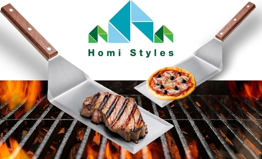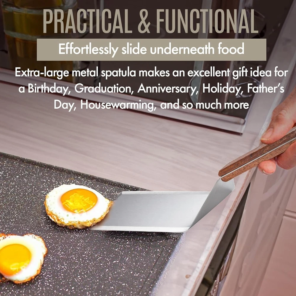 Professional Stainless Steel Grill Spatula with Wood Handle for Skillets, Thick Stainless Steel Blade Griddles & Pancake Flipper for Burgers, Omelet, and Versatile for Culinary Task, 8 x 4 inches ✅ SUPERIOR QUALITY: Stainless steel spatulas are sturdy and great for tasks that require strength, such as flipping pancakes or burgers on a grill. However, they are not flexible like silicone or rubber spatulas. Our wide meat spatula features an 8 x 4-inch flipper to offer ample space for holding more food at once, making it an excellent choice for professional and home use. ✅HEAVY-DUTY STAINLESS STEEL & WOODEN: This wide spatula is stainless steel and features an ergonomically designed wooden handle. The smooth silicone surface and flexible edges of our spatulas make them perfect for scraping, mixing, and spreading. Whether you're flipping pancakes, scrambling eggs, or sautéing veggies, these spatulas will glide effortlessly over any surface without scratching your cookware. ✅BEVELLED-EDGE AND SAFE TO USE DESIGN: This stainless-steel wide spatula with a wooden handle comfortably fits your hand for balance control. The sharp, beveled edge of this grilling spatula helps stir food more efficiently without bending or breaking. This innovative feature allows for precise scraping and effortless flipping, ensuring you get every last bit of food from your cookware without scratching or damaging its surface. ✅DURABLE AND MULTIFUNCTIONAL: Our spatula turner is a versatile kitchen companion. Perfect for grilling, BBQ, and as a griddle accessory for cast iron or flat-top cooking. The beveled edges of our oversized spatula seamlessly slide for quick and easy flipping of a burger, cutting pizza, or serving meat and cakes. Whether you're a grilling novice or a seasoned professional, this spatula is the ideal griddle grilling accessory for backyard BBQs and more. ✅PRACTICAL & IDEAL GIFT OPTION: Whether you're shopping for a culinary enthusiast or upgrading your own kitchen tool. 's metal spatula makes an excellent gift idea for a Birthday, Graduation, Anniversary, Holiday, Father’s Day, Housewarming, and so much more. This wide spatula for grills is dishwasher-safe and features hooks for hanging, storing, and drying. offset flat diner griddle rib grilling