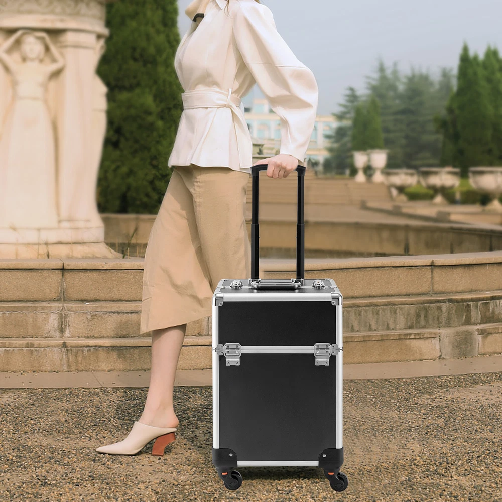 Specification Material: Aluminum Alloy, ABS Color: Black Shape: Rectangular Processing Method: Frosted Rolling Wheel Style: Universal Wheel Carrying Parts: Retractable Handle Model: HXS-05 Opening Method: Latch Number of Trays: 4 Maximum Load:100kg/220.46 lbs Shaking Degree: ±1cm/±0.39in Total Length of Trolley Bar: 80cm/31.5in Universal Wheel Height: 8cm/3.1in The Height of the Latch to the Bottom of the Case: 33 cm/13in Box Cover Height: 12cm/4.7in Base Layer Size: 32*22*31cm/12.6*8.66*12.2in Tray Size: 21.5*14.5*3.5cm/8.5*5.7*1.4in Gross Weight: 4.6kg/ 10.14 lbs Net Weight: 4.3kg/ 9.48 lbs Product Size: 34*24*45cm/ 13.4*9.4*17.7 in Package Size: 38*28.5*51cm/ 14.96*11.22*20.08in Package Included 1 * Rolling Makeup Train Case 2 * Keys Professional Travel Makeup Case Beauty Train Case Rolling Cosmetic Organizer New Description This is a removable multi-layer makeup case designed for professional beauticians to apply makeup anytime and anywhere. This rolling makeup train case is made of high-quality aluminum alloy and ABS for sturdiness and durability. It has an extra-large capacity base and 4 tiers of trays. The fashionable shape is safe and elegant, simple and fashionable. The humanized layout inside the case can reasonably manage the items for you and bring you a comfortable makeup experience. Key Features High-quality Material: This product is made of high-quality aluminum alloy and ABS fireproof board. It has the characteristics of corrosion resistance, wear resistance, and is not easy to fade. Classified Storage: This product has four sliding trays and a large bottom layer. Different functions and sizes of beauty products can be stored in the corresponding trays and compartments, making the storage of tools orderly and convenient for you to find the tools you want quickly. Safe and Stable: The case has a built-in alloy lock cylinder that securely protects the contents of the case and ensures privacy. The entire box is reinforced with aluminum alloy, which is more solid and durable. Large Capacity: This makeup case has four sliding trays measuring 8.46*5.71*1.38 inches that can hold 3.94in height nail polish bottles and a large bottom measuring 12.6*8.66*12.2 inches that can store cosmetics and beauty appliances, such as perms, manicure machines, and light therapy supplies. This versatile product will meet your storage needs. Excellent Weight Capacity: The rectangular structure and aluminum alloy frame give the case a superb weight capacity (up to 220.46 lbs.). You can safely put all your hair and beauty tools in it. Easy to Move and Carry: The universal wheels are easy to move and very convenient, especially for manicurists and cosmetologists who have more tools and need to go out often. And it comes with a telescoping trolley bar (maximum height of 31.5 inches) and a top handle, making it easy to carry when traveling and on business. Stylish Appearance: This rolling makeup train case gives a stylish and elegant look with its simple structure and pure colors. Such a vintage makeup case can nicely decorate your dressing room and make a good impression when you are out at work. Installation-free: This product has a one-piece structure, and you can use it directly without additional installation of it after receiving it. Details Three-position Trolley Bar: The thickened aluminum alloy trolley bar has a three positions design, which can be used by people of different heights. It has also undergone a 4,000 times fatigue test, which can control the shaking degree within ±0.39 inches. Removable Foam Compartment: The left tray uses a square 12-compartment foam compartment; the right tray uses a round 15-compartment foam compartment. It can put your cosmetics or nail polish in a more orderly way. And the foam can also protect the cosmetics well from wear and tear. Silent Universal Wheel: This product uses high-quality rubber removable silent universal wheels, which are strong and resistant to wear and tear. Detachable wheels can be easily removed or replaced if needed. Damping Handle: It is made of load force TEP and nylon, which is slow rebounded, durable, and not easy to break. And it also adopts the ergonomic width design, which can effectively relieve the pressure on your fingers. Application This rolling make-up case is suitable for professional make-up artists, hairdressers, nail technicians, and beauticians. Notes Please allow the slight color difference caused by the shooting light and the 1-3 cm error due to manual measurement, and make sure you do not mind before ordering. Payment Delivery details Terms of sales About us Contact us Payment We accept ebay payment 。 Fees such as import duties, taxes are not included in the item price or shipping costs. These charges are the buyer's responsibility. Delivery details Shipping: 2-9 working days to: USA Terms of sales We maintain high standards of excellence and strive for hundred percent customer satisfaction. Feedback is very important to us. We hope that you contact us immediately before you give neutral or negative feedback, so that we can address your concerns. It is impossible to address issues if we do not know about them! About us Your satis faction is our ultimate goal. We work hard to earn your trust and future business. Our certified technicians have tested each item before shipping. The unit comes with 1 year limited warranty on all manufacturing defects. a) If you receive a defective item, you may return it or ask for a discount. Please contact us within 14 days after you receive the package. b) What you returned must be intact and in its original packaging as re? u. Customer is responsible for shipping costs of the returned item. c) We will cover the cost of shipping back t with the shipping rate indicated in the registration page. We will send you a new unit or refund the full payment you paid. Thank you. Contact us Business Hour Business Hour: Monday To Friday: 8:30 AM to 5:00 PM (Beijing China time) Due to time zone