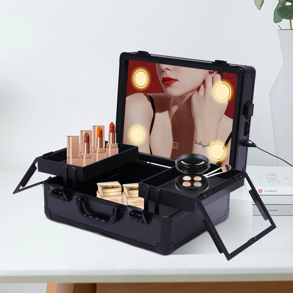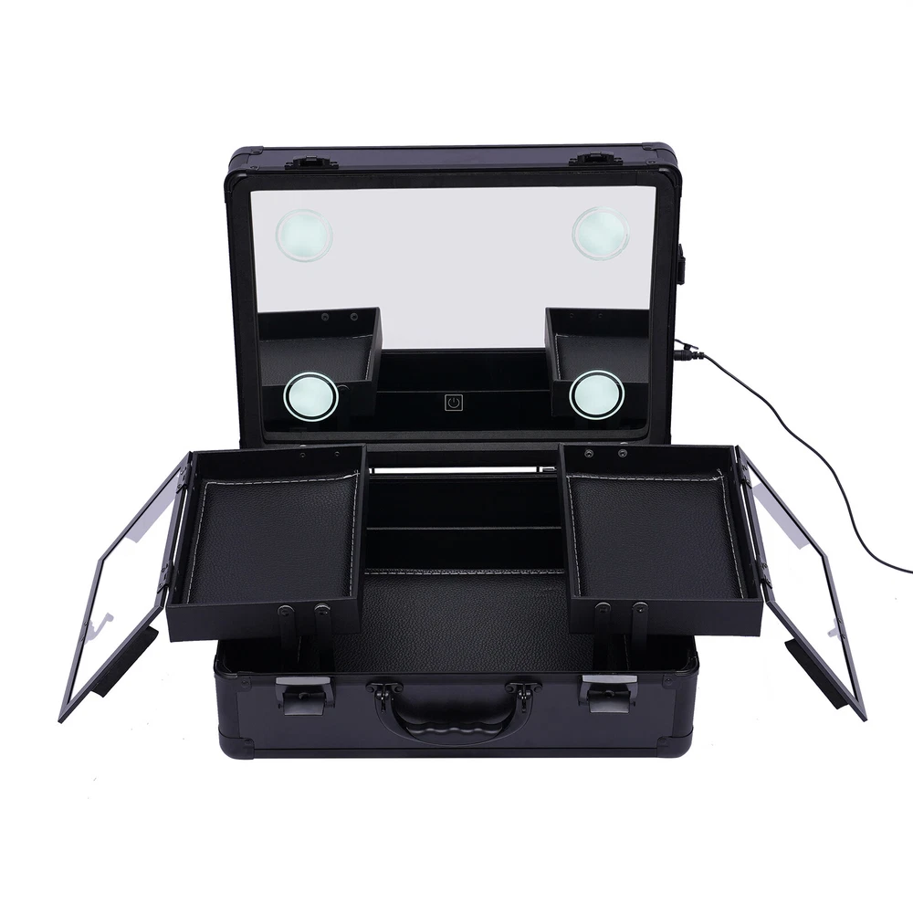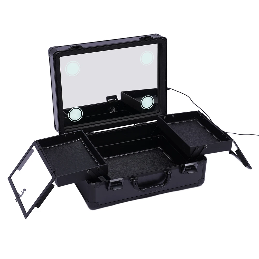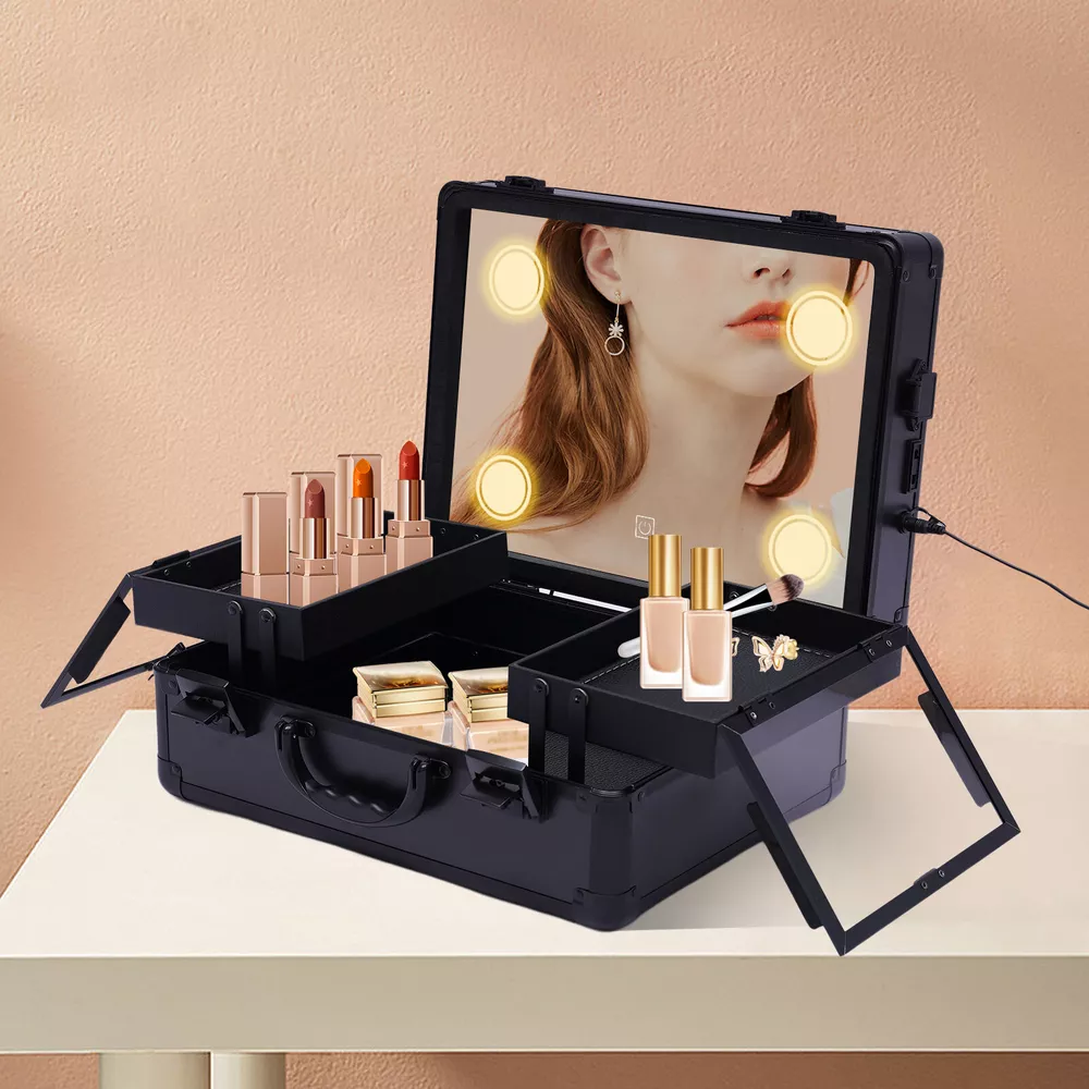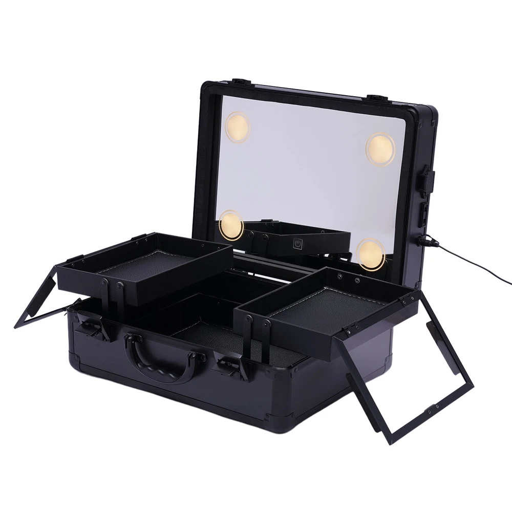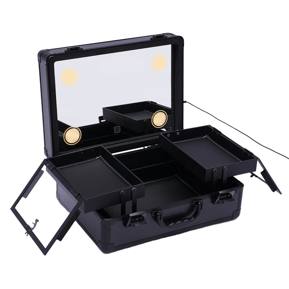 Professional Travel Makeup Train Case Portable Cosmetic Organizer Bag+LED Light Portable Train Makeup Case with 3 Level LED Light Mirror Multifunction w/ Lock Key Features Large Capacity Zoned Storage : It has two layers. The upper layer consists of 2 separate trays of 5.9*8.7*1.6inch for your usual lipsticks, brushes, blushes, etc. The lower layer is a 14.6*11*3.7in a one-piece tray that provides more space for your nail polish, essential oils, foundation, etc, so you can say goodbye to a cluttered desktop. Elegant Look : It is made in black style with all the components matching that color and keeping in line with the specially made handles for an impressive look. Makeup Assistant: It comes with 4 LED lights designed in the corners of the lid and a top mirror. The LED lights can adjust the light color between cold white, warm white and natural light, and the brightness of the makeup lights can be adjusted by touching the screen, allowing you to apply makeup anytime and anywhere. Security Protection : It comes with 2 locks to protect privacy and security during travel. Therefore, it is also suitable for holding watches, bracelets and some other valuables. Considerate Design :This make-up case comes with a 12V rechargeable jack, an external power supply jack, and a power jack. And the power cord can be used for an external curling iron, mobile phone, and hairdryer power when it is powered up to meet your needs while working. High Quality : It is made of high-quality ABS material, which is sturdy and durable, and the metal reinforced corners have good wear resistance . It can be used for many years. Easy to Clean : ABS stain-proof plastic is easy to clean. If the tray gets dirty with cosmetics, just wipe it with a damp cloth and it will be as good as new. Humanized Design : In addition to the makeup fire compartment itself which is closed, the two separate trays on the upper level also have their separate lids, which can effectively prevent dust and stains on your cosmetics. Ideal Gift : This elegant makeup train case is what every girl needs, so it is a great gift for girls. Portable : It is designed as a mini suitcase with dimensions of 5.9*8.7*1.6in and weighs only 6.61lbs. The curved grip makes it easy to hold and carry on your journey. Details Enhanced Corners : Durable aluminum material for long-term use can hold all your daily cosmetics and tools and keep their shape. Glass Lids : The two separate trays on the upper level feature clear glass lids, making it easy for you to be able to find your cosmetics at a glance. 5.91ft Power Cord : It comes with a 5.91ft power cord, allowing you to have plenty of length at your disposal. Therefore, it is more convenient for you to use it. Application This product is suitable for storing cosmetics and skin care products, as well as jewelry, such as necklaces and earrings. Besides, it also can be used in dark places for makeup. Specification Main Material: ABS Color: Black Plug Type: US Light Source: LED Light Color: Cold White, Warm White and Natural Light Voltage: 110-240v, 50-60Hz Power Cord Length: 1.8m/5.91ft Package Size: 40*21*35cm/15.75*8.27*13.78in Top Cover Mirror Size: 37*28*6.5cm/14.6*11*2.6in Bottom Tray Size: 37*28*9.5cm/14.6*11*3.7in Overall Case Size: 37*28*16cm/14.6*11*6.3in Center Tray Size: 15*22*4cm/5.9*8.7*1.6in Gross Weight: 4kg/8.82lbs Net Weight: 3kg/6.61lbs Package Included 1*Makeup Train Case 1* Power Cord Notes Please allow the slight color difference caused by the shooting light and 1-3cm error due to manual measurement, and make sure you do not mind before you order. Dear friend, Welcome to my store . Wish you have a nice day and happy shopping. If you have any questions or more information about promotion, please leave me a message and we will reply to you as soon as possible. Thanks for your patience. Payment Delivery details Terms of sales About us Contact us Payment We accept ebay payment 。 Fees such as import duties, taxes are not included in the item price or shipping costs. These charges are the buyer's responsibility. Delivery details Shipping: 2-9 working days to: USA Terms of sales We maintain high standards of excellence and strive for hundred percent customer satisfaction. Feedback is very important to us. We hope that you contact us immediately before you give neutral or negative feedback, so that we can address your concerns. It is impossible to address issues if we do not know about them! About us Your satis faction is our ultimate goal. We work hard to earn your trust and future business. Our certified technicians have tested each item before shipping. The unit comes with 1 year limited warranty on all manufacturing defects. a) If you receive a defective item, you may return it or ask for a discount. Please contact us within 14 days after you receive the package. b) What you returned must be intact and in its original packaging as re? u. Customer is responsible for shipping costs of the returned item. c) We will cover the cost of shipping back t with the shipping rate indicated in the registration page. We will send you a new unit or refund the full payment you paid. Thank you. Contact us Business Hour Business Hour: Monday To Friday: 8:30 AM to 5:00 PM (Beijing China time) Due to time zones, our reply to your questions may not be immediately. But within above working time, we will reply your email within 24 hours. If it's non-workdays, please kindly be patient and wait till Monday. Please contact us with ebay message. Please feel free to contact us if you have any questions. Monday To Friday: 8:30 AM to 5:00 PM (Beijing China time) Due to time zones, our reply to your questions may not be immediately. But within above working time, we will reply your email within 24 hours. If it's non-workdays, please kindly be patient and wait till Monday. Please contact us with ebay message. Please feel free to contact us if you have any questions. Warranty 10 Years Manufacturer Warranty 10 Years Herstellergaranti