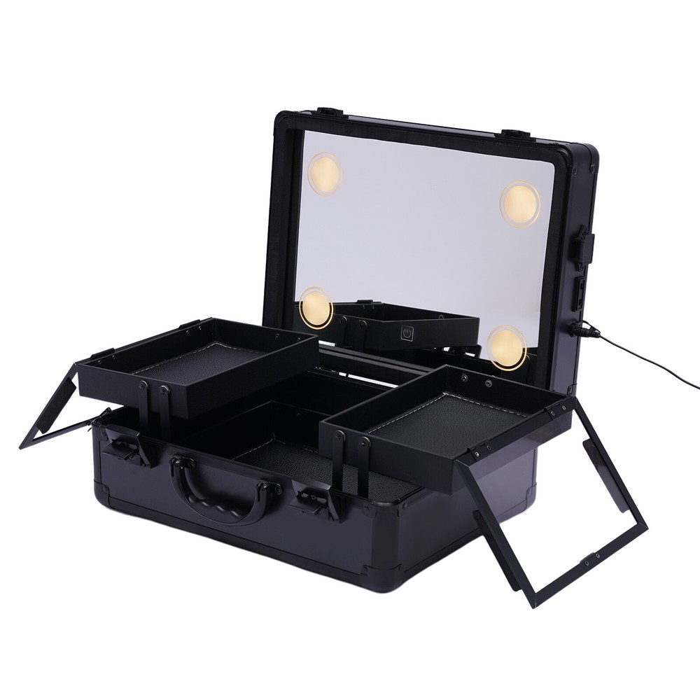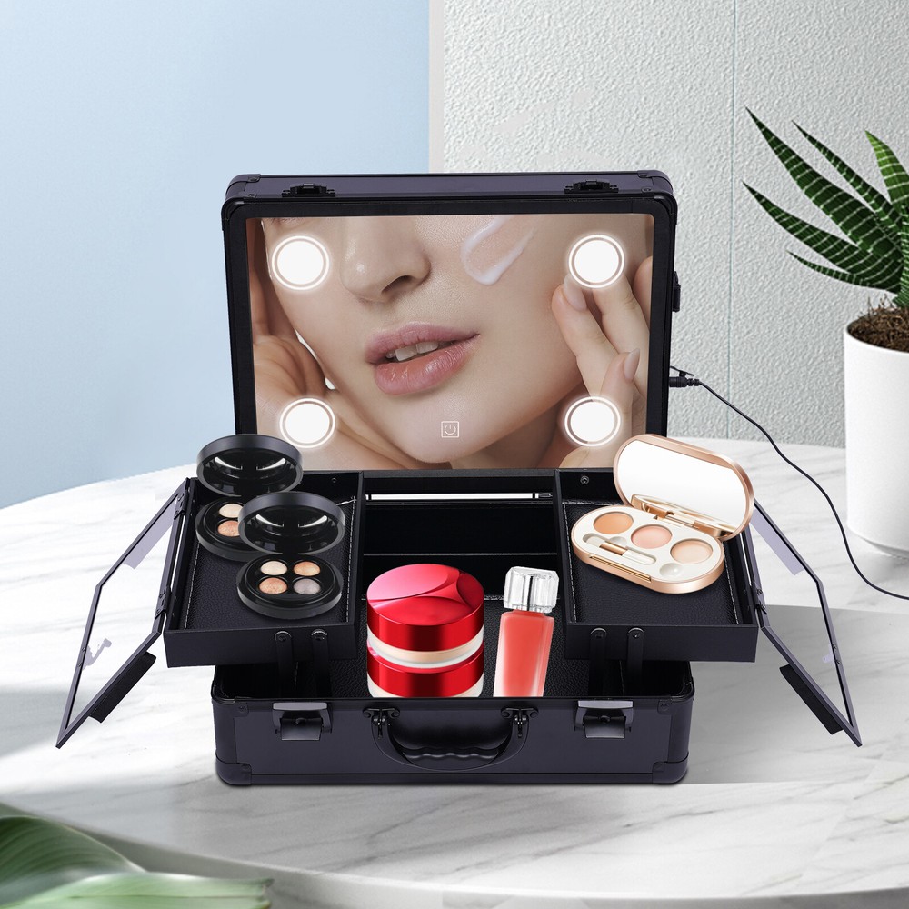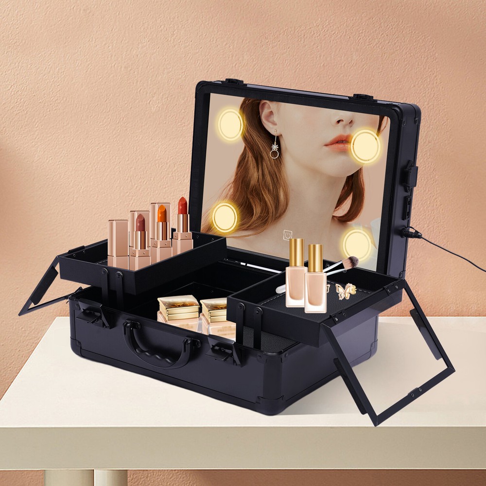 Professional Travel Makeup Train Case Portable Cosmetic Organizer Bag+LED Light Portable Train Makeup Case with 3 Level LED Light Mirror Multifunction w/ Lock Key Features Large Capacity Zoned Storage : It has two layers. The upper layer consists of 2 separate trays of 5.9*8.7*1.6inch for your usual lipsticks, brushes, blushes, etc. The lower layer is a 14.6*11*3.7in a one-piece tray that provides more space for your nail polish, essential oils, foundation, etc, so you can say goodbye to a cluttered desktop. Elegant Look : It is made in black style with all the components matching that color and keeping in line with the specially made handles for an impressive look. Makeup Assistant: It comes with 4 LED lights designed in the corners of the lid and a top mirror. The LED lights can adjust the light color between cold white, warm white and natural light, and the brightness of the makeup lights can be adjusted by touching the screen, allowing you to apply makeup anytime and anywhere. Security Protection : It comes with 2 locks to protect privacy and security during travel. Therefore, it is also suitable for holding watches, bracelets and some other valuables. Considerate Design :This make-up case comes with a 12V rechargeable jack, an external power supply jack, and a power jack. And the power cord can be used for an external curling iron, mobile phone, and hairdryer power when it is powered up to meet your needs while working. High Quality : It is made of high-quality ABS material, which is sturdy and durable, and the metal reinforced corners have good wear resistance . It can be used for many years. Easy to Clean : ABS stain-proof plastic is easy to clean. If the tray gets dirty with cosmetics, just wipe it with a damp cloth and it will be as good as new. Humanized Design : In addition to the makeup fire compartment itself which is closed, the two separate trays on the upper level also have their separate lids, which can effectively prevent dust and stains on your cosmetics. Ideal Gift : This elegant makeup train case is what every girl needs, so it is a great gift for girls. Portable : It is designed as a mini suitcase with dimensions of 5.9*8.7*1.6in and weighs only 6.61lbs. The curved grip makes it easy to hold and carry on your journey. Details Enhanced Corners : Durable aluminum material for long-term use can hold all your daily cosmetics and tools and keep their shape. Glass Lids : The two separate trays on the upper level feature clear glass lids, making it easy for you to be able to find your cosmetics at a glance. 5.91ft Power Cord : It comes with a 5.91ft power cord, allowing you to have plenty of length at your disposal. Therefore, it is more convenient for you to use it. Application This product is suitable for storing cosmetics and skin care products, as well as jewelry, such as necklaces and earrings. Besides, it also can be used in dark places for makeup. Specification Main Material: ABS Color: Black Plug Type: US Light Source: LED Light Color: Cold White, Warm White and Natural Light Voltage: 110-240v, 50-60Hz Power Cord Length: 1.8m/5.91ft Package Size: 40*21*35cm/15.75*8.27*13.78in Top Cover Mirror Size: 37*28*6.5cm/14.6*11*2.6in Bottom Tray Size: 37*28*9.5cm/14.6*11*3.7in Overall Case Size: 37*28*16cm/14.6*11*6.3in Center Tray Size: 15*22*4cm/5.9*8.7*1.6in Gross Weight: 4kg/8.82lbs Net Weight: 3kg/6.61lbs Package Included 1*Makeup Train Case 1* Power Cord Notes Please allow the slight color difference caused by the shooting light and 1-3cm error due to manual measurement, and make sure you do not mind before you order. Payment Delivery details Terms of sales About us Contact us Payment We accept ebay payment 。 Fees such as import duties, taxes are not included in the item price or shipping costs. These charges are the buyer's responsibility. Delivery details Shipping: 2-9 working days to: USA Terms of sales We maintain high standards of excellence and strive for hundred percent customer satisfaction. Feedback is very important to us. We hope that you contact us immediately before you give neutral or negative feedback, so that we can address your concerns. It is impossible to address issues if we do not know about them! About us Your satis faction is our ultimate goal. We work hard to earn your trust and future business. Our certified technicians have tested each item before shipping. The unit comes with 1 year limited warranty on all manufacturing defects. a) If you receive a defective item, you may return it or ask for a discount. Please contact us within 14 days after you receive the package. b) What you returned must be intact and in its original packaging as re? u. Customer is responsible for shipping costs of the returned item. c) We will cover the cost of shipping back t with the shipping rate indicated in the registration page. We will send you a new unit or refund the full payment you paid. Thank you. Contact us Business Hour Business Hour: Monday To Friday: 8:30 AM to 5:00 PM (Beijing China time) Due to time zones, our reply to your questions may not be immediately. But within above working time, we will reply your email within 24 hours. If it's non-workdays, please kindly be patient and wait till Monday. Please contact us with ebay message. Please feel free to contact us if you have any questions. Monday To Friday: 8:30 AM to 5:00 PM (Beijing China time) Due to time zones, our reply to your questions may not be immediately. But within above working time, we will reply your email within 24 hours. If it's non-workdays, please kindly be patient and wait till Monday. Please contact us with ebay message. Please feel free to contact us if you have any questions.