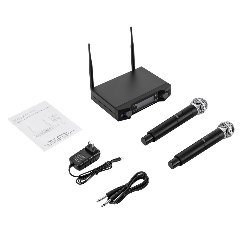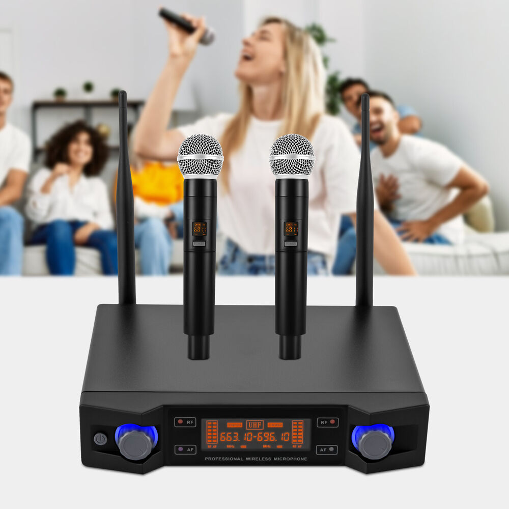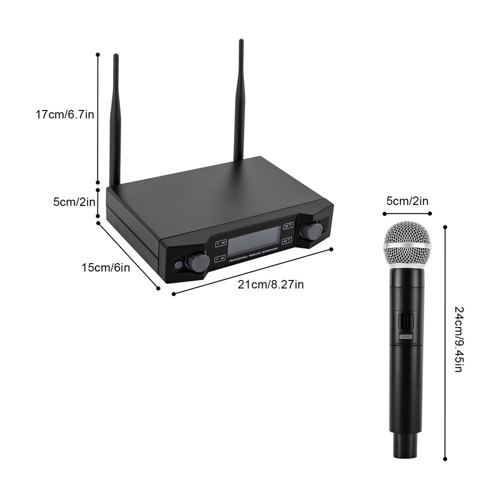 Package Included 2* Microphones 1* Receiver 1* Audio Cable 1* Power Adapter 1* English Instruction Manual Professional Dual Wireless Microphone System for SHURE SM58 Cordless Mic Set UHF Description The dual-Channel UHF wireless microphone system for singing is less susceptible to interference than the VHF microphone. It includes one receiver with 2 high-gain antennas and 2 handheld dynamic microphones. The system has a range of approximately 164ft. Lightweight, versatile, and capable of reproducing a wide range of sound clearly and distortion-free , this system is ideal for basic public addresses as well as musical performances. Key Features Clear and Pristine Sound Quality: The high-sensitivity dynamic microphone core of each wireless microphone is specially engineered to limit interference, picking up sound smoothly and transmitting sound hassle-free . It delivers clear, robust, pure, full, optimal true sound to be ideal for Karaoke, Home KTV, Big parties, DJ, Wedding, and Class use. Independent Control: The professional receiver allows independent control of the volume of both microphones, allowing for precise vocal balance for your convenience. Good Portability: The whole wireless microphone system is compact and lightweight(2.2lbs), so you can easily carry it around. Enhanced Signal Stability: With two 6.7in in length antennas, it has strong penetration to provide optimum resistance against RF interference and drop-out with the reception distance of up to 164ft, so you don't have to worry about signal disconnection during use. Sturdy and Durable: The mic with iron grille is particularly resistant to shocks, impacts, and corrosion as it is heat-treated. The plastic receiver is heat resistant and has a long service life. 360° Pick-up Microphone: It enables a large microphone pickup range and high sound quality while effectively reducing signal interference in different directions, ensuring clear sound and reduced whistling in the final output . Just Plug and Play: Turn on the receiver and wireless mics, they will match automatically, and just plug the receiver into a freestanding amp/speaker(not included) and karaoke is ready to go. Good Continuity: Smart power management allows the microphone to be used with less power consumption. And it can be used continuously for about 5 hours, allowing you to enjoy the joy of music for a long time. Soft Handfeel: The microphone is lightweight, ergonomic and comfortable to touch, so you can hold it for a long time without fatigue, providing you with maximum comfort. Details Display Screen: The microphone is equipped with a backlit LED display to show the microphone status in high definition. You can see its status and operating frequency at a glance. Anti-slip Pipe Body: The microphone's tube body uses a non-slip design to increase the friction between the microphone and the palm of your hand, so it is not easy to fall off and slip during use. Application It is ideal for Karaoke, Home KTV, Big party, DJ, Wedding, Class use. You can use it to sing at home or outdoors, boldly express your ideas in classes and lectures. If you are a live web star, DJ, singing performer, teacher, etc, it is simply tailored for you! Specifications Model: VH58 Usage: DJ, Karaoke, Live Streaming, Lectures Special Feature: Wireless , Lightweight Microphone Form Factor: Microphone System Color: Black Plug: US Standard Material: Iron and Plastic Surface Treatment: Heat Treatment Comprehensive Performance: Carrier Frequency: UHF-640-690MHz Frequency Stabilization: Less than±30ppm Dynamic Range: More Than 90DB Total Harmonic Distortion: Less Than 0.5% Frequency Response: 40hz-15KHz±3dB Audio Output Level: Separate Type: 0~±400mV ; Mix Type: 0~±200mV AC-DC Adapter: Model: VA3-500 Input: AC 110V-240V 50/60Hz Output: DC 12V 500mA Fixed Receiver: Power Supplu: DC9-15V200MA Consume Power: 3WATER Signal/Noise Ratio: >90DB Image&Sprious Rejection: >80DB Border Upon Channel: >80DB Receiving sensitivity: 10DBUV(SINAD=30DB) De-Emphasis: 50uS Handing Microphone: Transmitter Power: 8.5 MW Modulation Type: FM, F3F Max Deviation:±25KHz Spurious Emission: >40DB Operating Time: 5 Hours Gross Weight: 1.35kg/2.97lbs Net Weight: 1kg/2.2lbs Receiver Size: 21*15*5cm/8.27*6*2in Receiver Antenna Length: 17cm/6.7in Microphone Length: 24cm/9.45in Package Size: 30*22*11cm/11.8*8.6*4.3in Package Included 2* Microphones 1* Receiver 1* Audio Cable 1* Power Adapter 1* English Instruction Manual Notes If you need to connect the wireless microphone to other devices, please note that a converter is required in case of mismatched plugs. The use of a converter will not affect the sound quality. (Not included in the package) Please avoid putting the main machine at a blind angle when it is used. This is for keeping signal receiving in good condition. Please don't throw fall, toss cast the handling microphone when it is used, in case of damage it seriously. Please keep the machine from direct sunshine or rain, and put it in a place as far as possible from the magnetic field. Please don't open it yourself, because there is high voltage in it. Please allow the slight color difference caused by the shooting light and 1-3cm error due to manual measurement, and make sure you do not mind before you order. "Quality of life, starting from here!" ——In this store, we have selected a series of high-quality products for you, Make your shopping experience more enjoyable. Come and buy now, enjoy a worry free life! Payment Delivery details Terms of sales About us Contact us Payment We accept ebay payment 。 Fees such as import duties, taxes are not included in the item price or shipping costs. These charges are the buyer's responsibility. Delivery details Shipping: 2-9 working days to: USA Terms of sales We maintain high standards of excellence and strive for hundred percent customer satisfaction. Feedback is very important to us. We hope that you contact us immediately before you give neutral or negative feedback