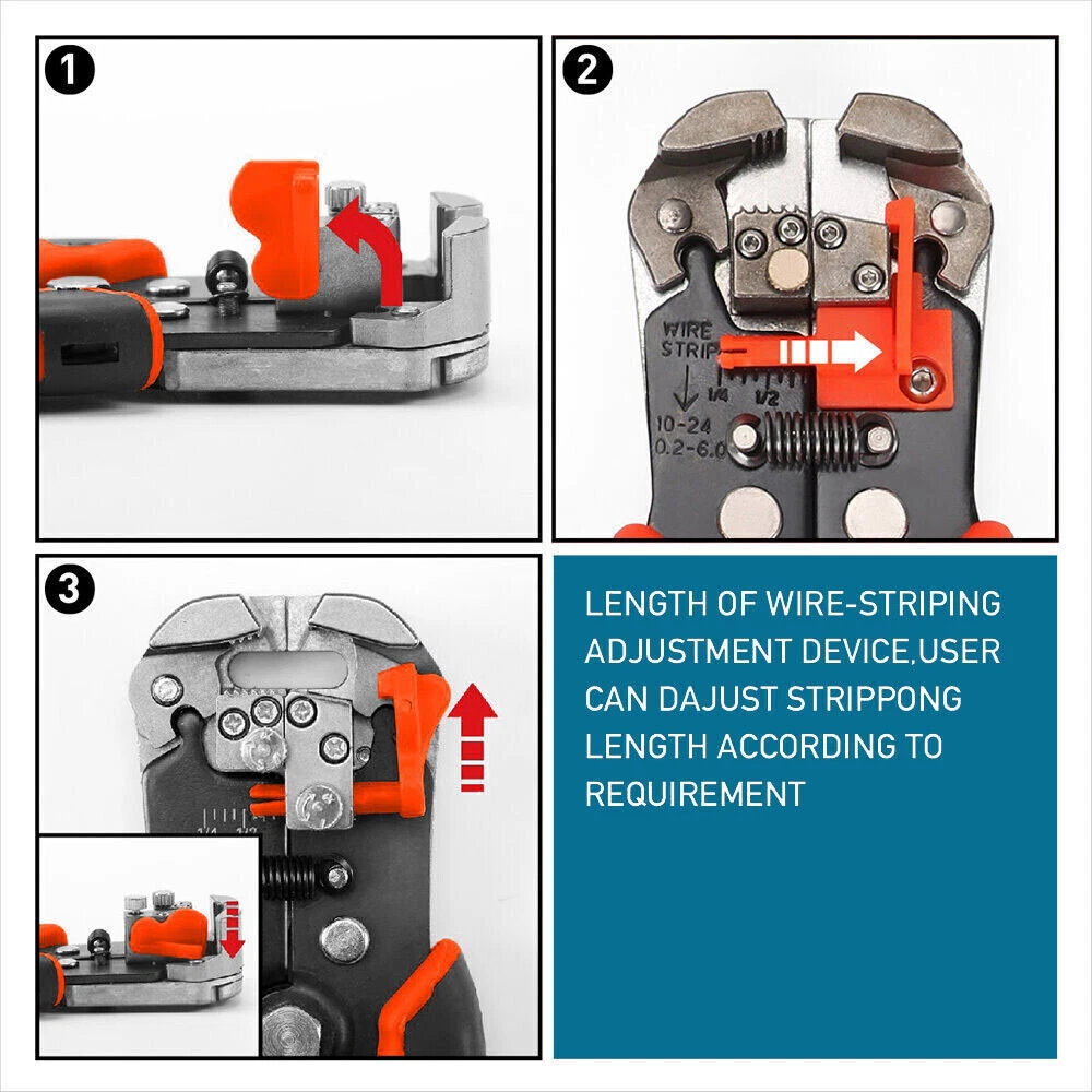 Automatic Wire Cutter Stripper Plier Electrical Cable Crimper Terminal Tool Feature: The wire stripper features convenience, efficiency and harmlessness to the cable cores. Just hold the handle and manipulate it once to successfully peel down the wire sheath. The alloy steel jaws: hardness(HRC36-42) suitable for the wire from 10 to 24 AWG(0.2-6.0mm). The cutter: hardness(HRC48-52), can cut off copper or aluminum wire. Can crimp insulted terminals from 10 to 22 AWG(0.5-6.0mm). Can Crimp non-insulted terminals from 4 to 22 AWG(0.5-6.0mm). With adjustment screw, you can adjust the strength of stripping Specifications: Material: Metal Color: Orange Item Size: 21 * 10.5 * 1.5cm / 8.27 * 4.13 * 0.59in Item Weight: 317g / 11.19oz Package Size: 28 * 12.5 * 1.5cm / 11.02 * 4.92 * 0.59in Package Weight: 363g / 12.81oz Package: 1 X Wire Strippe
