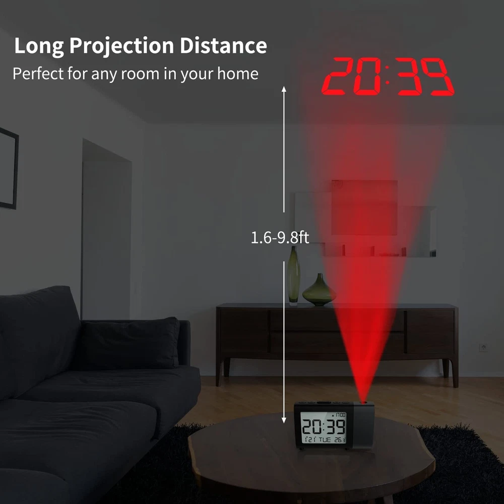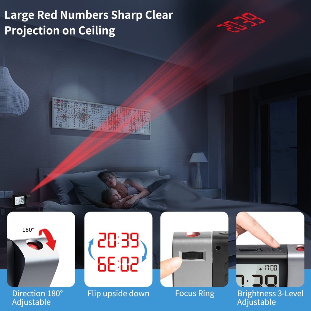 Projection Alarm Clock with Temperature, Calendar, Snooze, Adjustable Backlight, USB and Battery Operated Alarm Clock for Bedroom Ceiling Wall, Power Adapter and USB Cable Included, projector light and focus adjustable. Plug and play. Put aaa battery to backup the alarm clock in case of the power outage. Ultra-Clear Projection - This bedside projection clock projects clear red digits on the ceiling and is easy to read in the middle of the night without having to lean forward to look at the clock. With its 180° swivel projector and full adjustable focus ring, the projection distance range is 1.64-11.4ft (0.5-3 meters), perfect for any of your room Multi Display Clock - 3.9 inch LCD Screen displays Clock Time, Alarm Time, Calendar Date, the Day of the week, and Temperature. 12H/24H Time Format Selectable. 4-level brightness adjustable backlight for easy time reading at night Time Projection Adjustable - Projection brightness 4 levels; the numbers can be flipped upside down to read time upright regardless of pointing directions; focus ring to adjust the numbers clear and sharp to see at a distance USB and Battery Powered - To keep the projections and backlights work, 5V 1A power adapter and micro usb cable are required and included. Simply plug and play. The basic alarm clock function can be also powered by 3 of AAA batteries (not included). When inserted with batteries, it still trigger the alarm during power outages, and you do not need to reset time. Never worry about missing any important meetings Weekend Mode - When you schedule the alarm and turn the Weekend mode on, the alarm will only sound from Monday to Friday, and won't sound on Saturdays and Sundays. Save you the hassle of turning on/off the alarm before or after weekends 9 Minutes Snooze - For those who needs an extra 9 minutes to start a fresh day, simply press the "Snooze" button at the top of the clock 【Warm Tips】Before use, please insert 3 AAA batteries as backup to avoid resetting the clock in case of power failure. 1) When powered by battery, the ceiling projection and backlight will go off in 5 seconds to save power. If want them always on, please keep it plugged. 2) If them not always on even plug in, please check whether the USB cable are not in good or not plugged in tightly 【Projection Tips】1) Why the projection is upside down? - Press and hold the projection button for 3 seconds to flip the projected image over. 2) Why is the projection blurry? - Scroll the focus wheel on the back of the clock to adjust the sharpness of the projected image