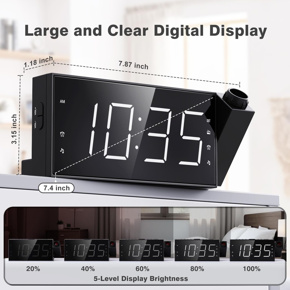 Project time on wall or ceiling With 350-degree swivel,this clock projects the time right onto your wall or ceiling for easy,stress free viewing - all you have to do is open your eyes.Turn on or off as needed. The best thing is that you can project the time really easy.Just repeatedly press โProjectionโbutton and it will appear vividly on your wall. Not Too Faint,Not Too Bright--Just Right Optional 5 brightness settings ensure you can easily read the display during the day or night, without being distracted while trying to fall asleep. Auto/Manual Scan FM Radio Built-in FM tuner lets you choose from a wide variety of radio, talk, and music programming. allow you to Preset 20 radio stations you can turn on your favorite radio programs next time without extra manual selection. Charge While You Listen--or While You Sleep Your iPad, iPhone and your smartphone will charge while docked to help you avoid a drained battery,whether you're listening or not.Wake up with a smile and your mobile devices always fully charged! Important: Q:What should I do if this projection numbers on the ceiling is fuzzy? A:Please rotate the focus ring for proper angle to adjust it from fuzzy image to be clear as you desire. Q:Why projection time is reversed? A:please press the PROJECTION button once again to flip the projection Q:How to turn off the alarm? when alarm sounds: Press once ALARM OFF button to turn off alarm today To cancel alarm, hold press ALARM OFF button until the alarm icon disappear from the display ๐๐๐ ๐๐น๐ผ๐ฐ๐ธ ๐ฅ๐ฎ๐ฑ๐ถ๐ผ ๐๐ถ๐๐ต ๐ฎ๐ฌ ๐ฃ๐ฟ๐ฒ๐๐ฒ๐ ๐ฆ๐๐ฎ๐๐ถ๐ผ๐ป๐ ๐ฎ๐ป๐ฑ ๐๐ฑ๐ท๐๐๐๐ฎ๐ฏ๐น๐ฒ ๐๐ผ๐น๐๐บ๐ฒ--Enjoy a digital FM radio on this clock radio with 20 preset stations (87.5โ108 MHz). Whether you love music, talk shows, or need traffic updates, this radio alarm clock has you covered. Convenient side volume buttons make it easy to adjust the sound to your ideal level. ๐ ๐๐น๐ฒ๐ฎ๐ฟ ๐ง๐ถ๐บ๐ฒ ๐ฃ๐ฟ๐ผ๐ท๐ฒ๐ฐ๐๐ถ๐ผ๐ป--The 180ยฐ adjustable projector on this projection alarm clock allows you to project the time onto your wall or ceiling, so you can see it clearly even while lying in bed. You can rotate the projection, flip the orientation, and adjust the focus for a crisp and easy - to - read display. ๐ ๐๐ฎ๐ฟ๐ด๐ฒ, ๐๐ฎ๐๐ - ๐๐ผ - ๐ฅ๐ฒ๐ฎ๐ฑ ๐๐๐ ๐๐ถ๐๐ฝ๐น๐ฎ๐ ๐๐ถ๐๐ต ๐๐ฑ๐ท๐๐๐๐ฎ๐ฏ๐น๐ฒ ๐๐ฟ๐ถ๐ด๐ต๐๐ป๐ฒ๐๐--The 7 - inch ultra - large LED screen of this projection alarm clock makes it possible for you to see the time from a distance, without needing glasses or contacts. Plus, choose from 5 dimming levels to adjust the brightness for day or night use, creating a peaceful sleep environment. ๐ ๐๐๐ฎ๐น ๐๐น๐ฎ๐ฟ๐บ๐ ๐๐ถ๐๐ต ๐๐ถ๐ณ๐ณ๐ฒ๐ฟ๐ฒ๐ป๐ ๐ฆ๐ผ๐๐ป๐ฑ--Set two alarms on this radio alarm clock โ wake up to your choice of a buzzer or radio. With adjustable alarm volume levels (from level 1 to 5), including a super - loud 106dB setting for heavy sleepers, you won't miss your wake - up time again. Plus, the sleep timer option lets you set your radio on this clock radio to turn off automatically after 10 to 90 minutes. ๐ ๐ฃ๐ผ๐๐ฒ๐ฟ ๐๐ฎ๐ฐ๐ธ๐๐ฝ & ๐จ๐ฆ๐ ๐๐ต๐ฎ๐ฟ๐ด๐ถ๐ป๐ด--This projection alarm clock plugs into sockets for consistent power. Battery backup keeps your time, alarm, and radio settings saved during power outages. Additionally, the built - in USB charging port lets you charge your phone overnight โ wake up with your device powered. ๐ ๐ฃ๐ฒ๐ฎ๐ฐ๐ฒ ๐ผ๐ณ ๐ ๐ถ๐ป๐ฑ ๐๐๐ฎ๐ฟ๐ฎ๐ป๐๐ฒ๐ฒ๐ฑ โ one-year warranty, 30-day free return, and 24-hour customer support. Sleep better knowing weโre always here for you.