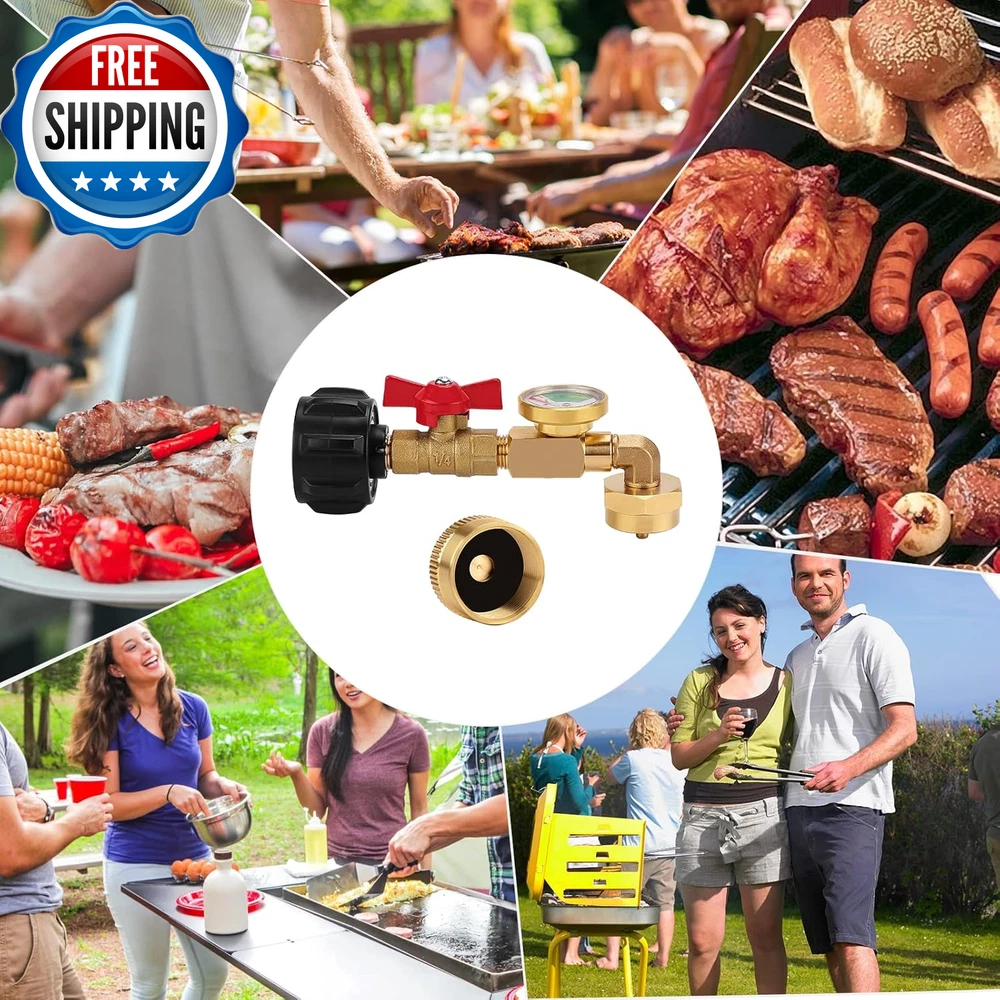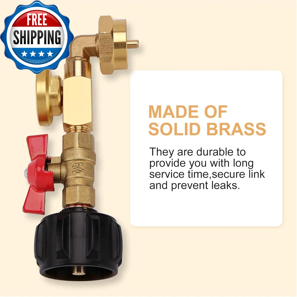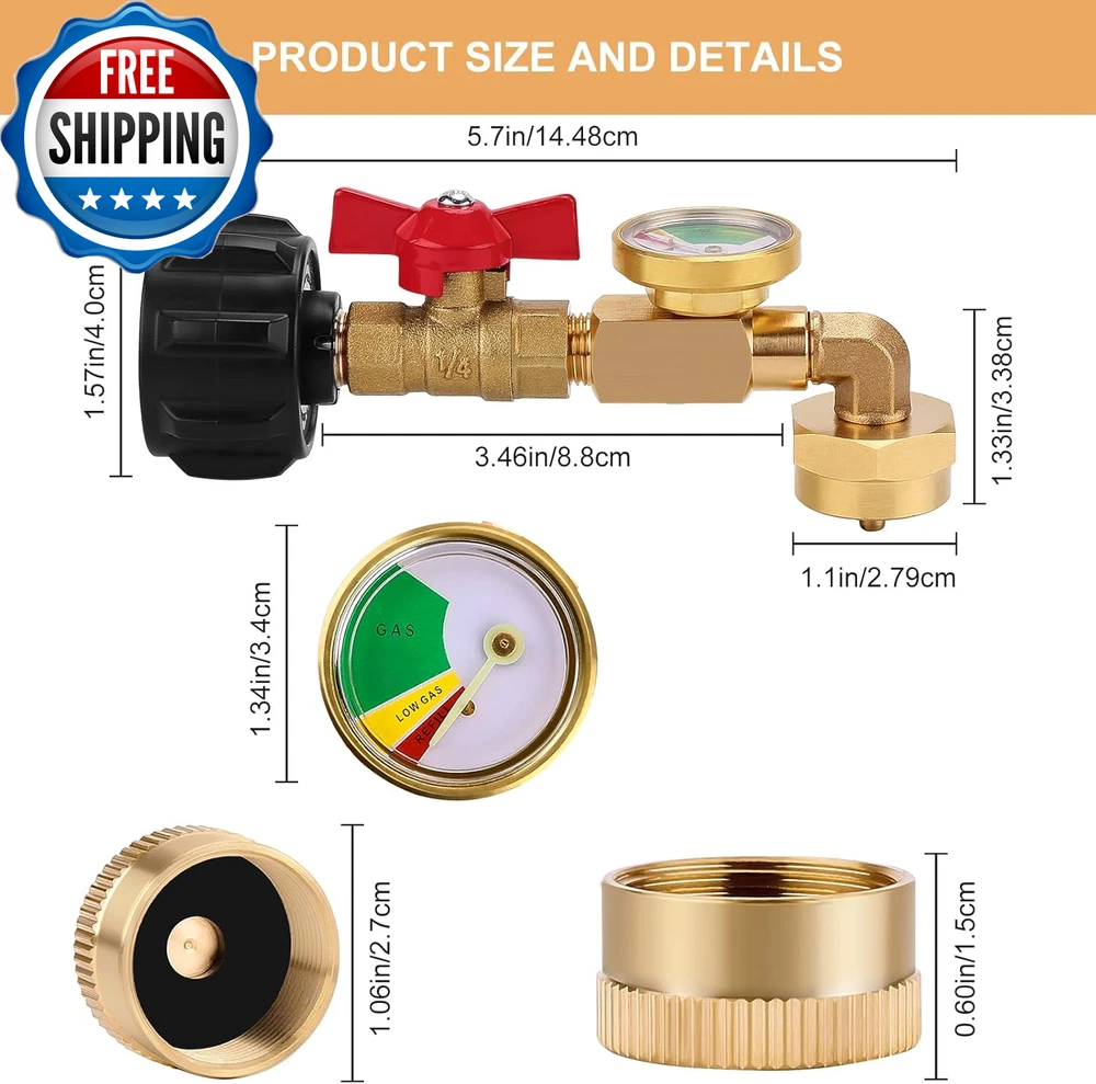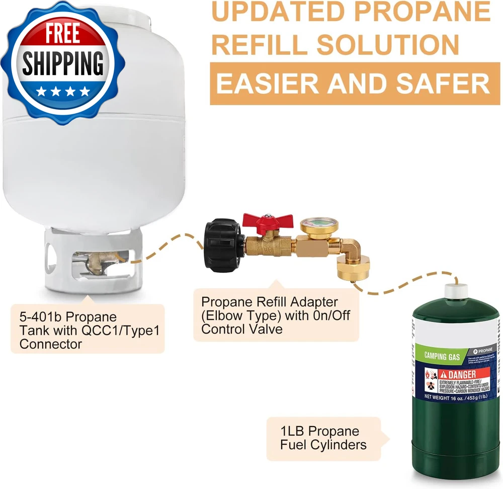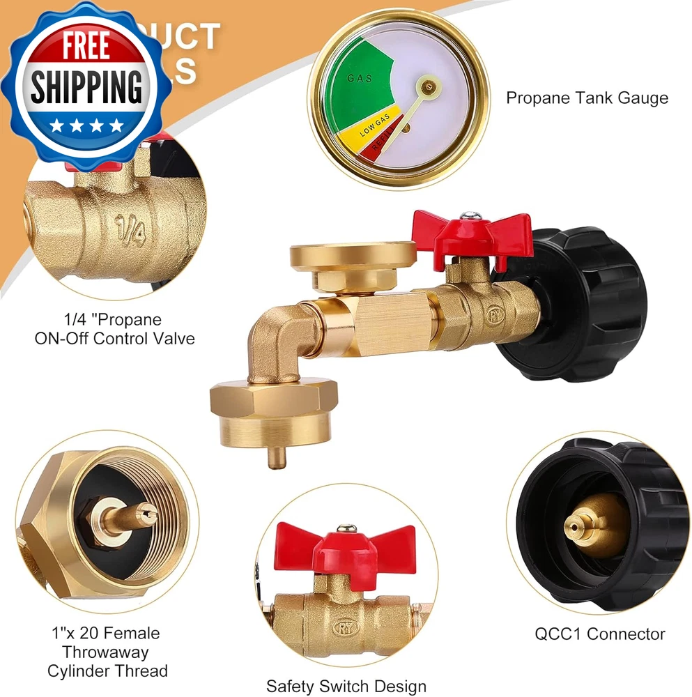 Propane Adapter 1Lb to 20Lb, QCC1 Propane Refill Elbow Adapter with Gauge and On-Off Control Valve for 1LB Propane Tank to Be Refilled Gas from 5~40 LB Propane Tank 90 Degrees Design: WADEO propane elbow refill adapter with ON/OFF control valve is easy to install and no tools required, and it with hand-wheel grip for tightening, you can easily connect your large cylinder to 1LB propane tank. Additional 1 LB Propane Bottle Cap: The 1 LB propane bottle cap is useful for your camping stoves, home applications, barbecue, propane heater or others equipments that use 1 lb propane tank. You don't need to spend extra money to buy the cap. How to Refill the Gas: Refill the 1LB camping bottle with propane gas by using a 90-degree propane filling adapter, you should turn the large propane tank upside down and place it securely in the corner of the dining table so the liquid can flow out. Upgraded With Gauge For Accurate Reading: Specially designed with a gauge at the side connect with 1lb propane tank, our propane refill adapter allows you to read and monitor the gas volume in your 1lb propane cylinder more accurately. Luminous pointer and gas level indicator make it easy to read even in the dark. Attention: Because the gas is highly flammable, you Must refill your 1 lb cylinder tank out of the door and stay away flames and sparks for safety. Product Description Function: Inflate 1 lb cylinders with large cylinder to achieve the effect of reusing disposable gas bottle. Built-in Safety Function: The built-in safety function can ensure that you will never fill the 1lb gas bottle. How to Inflate the Propane Gas: 1. Put the empty 1 lb cylinders in a freezer for several hours. 2. Put your 5-40lb propane tank upside down and attach the QCC1 connection to your propane tank. Close the 1/4'' on-off control valve. 3. Install the 1" x 20 Female throwaway cylinder thread on the 1lb tank cylinder. 4. Open the 5-40 propane tank cylinder valve and then tun on 1/4" on-off control valve. 5. When the flow of propane gas stops, please shut off the 1/4" on-off control valve and remove the 1 lb cylinder. Attention: Because the gas is highly flammable, you must refill your 1lb cylinder tank out of the door and stay away from flames and sparks. Item Weight 10.9 ounces Package Dimensions 6.18 x 2.44 x 2.2 inches Shipping Fast shipping is very important for us. Our standard US shipping service is FREE. Your order will be shipped within 2-3 business days upon full payment received. Your order will be delivered within 2-3 business days after the handling time. We only ship to the confirmed PayPal address. We reserve the right to cancel any order for any reason at any time. We are not responsible for undeliverable addresses. Returns and payment We offer a 30 days return policy from checkout winning date. We allow only PayPal as payment method FeedBack Your feedback very important to us, after you get your package and you are satisfied with our service please leave us positive feedback If you have any problem with your order / any questions please before leave any type of feedback Please visit our eBay store to check out other items for sale! Thank you for shopping at our store.