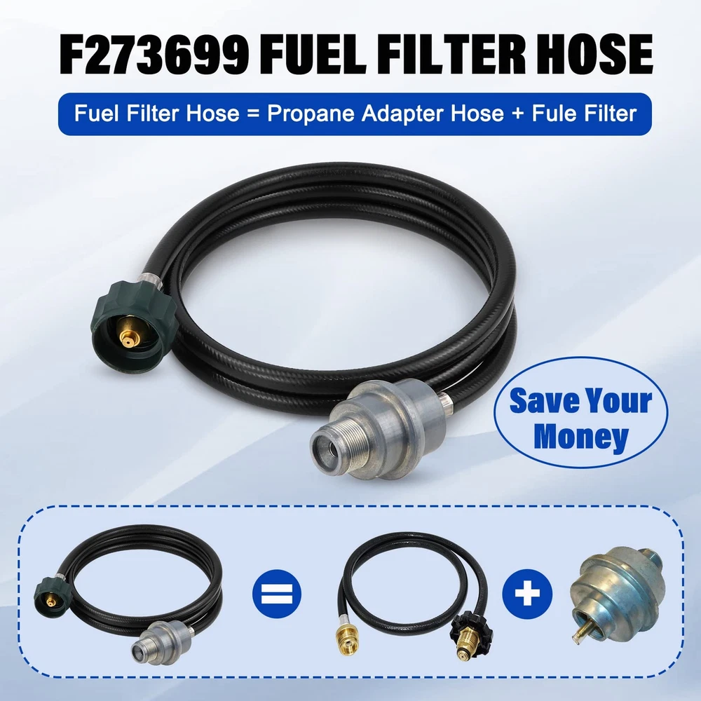 More Convenient: The Universal Fuel Filter with Hose is for the Portable, Big, and Tough Buddy Heaters in use with a bulk propane cylinder. No need for additional propane adapter hose. Convenient and save your money. For Use With: Fuel Filter F273699 Filtering Propane Servicing a Source, For Mr heater Buddy and Big Buddy 6351206, 6351207, 6351200, F273701, F273702, F232000, F274800, F23203 6FT Propane Adapter Hose:The hose with a QCC1/Type1 adapter, can connect directly to 20-45 lb propane tanks and ensure air tightness. and ensure air tightness. Allows you to use portable heaters more conveniently, quickly and safely. Professional Quality: Our products use high-quality raw materials. the filter is made of high quality steel. The tube adopts a three-layer structure, the outer layer is rubber, the galvanized steel support, and the inner layer is PVC. The joint is made of Solid brass. The product has passed the CSA professional certification, which is safe and durable. 1 Year Warranty: We provide 100% Satisfaction Guarantee. If you have any problem after receiving this item, please don't hesitate to contact us, we resolve all issues in 24 hours.