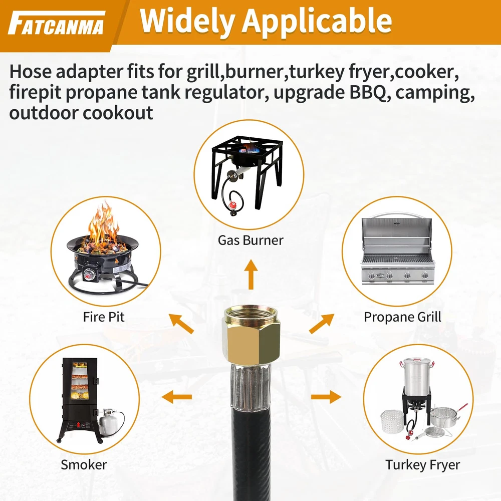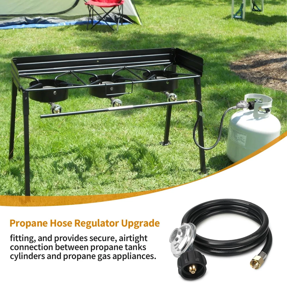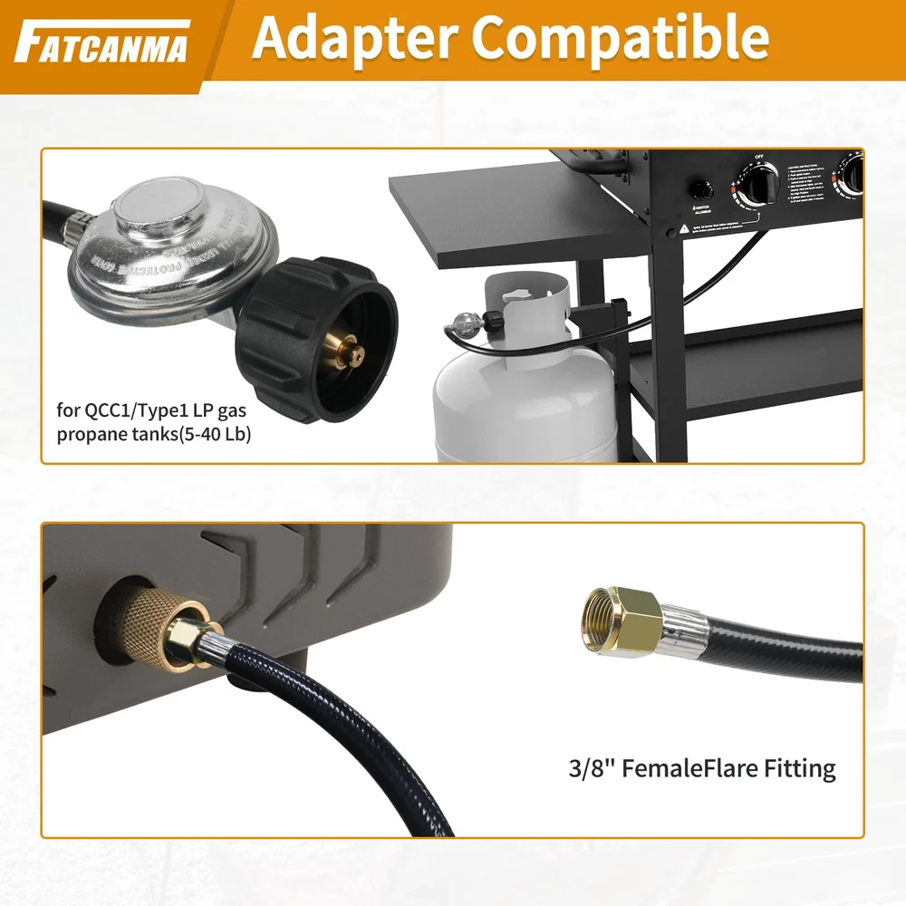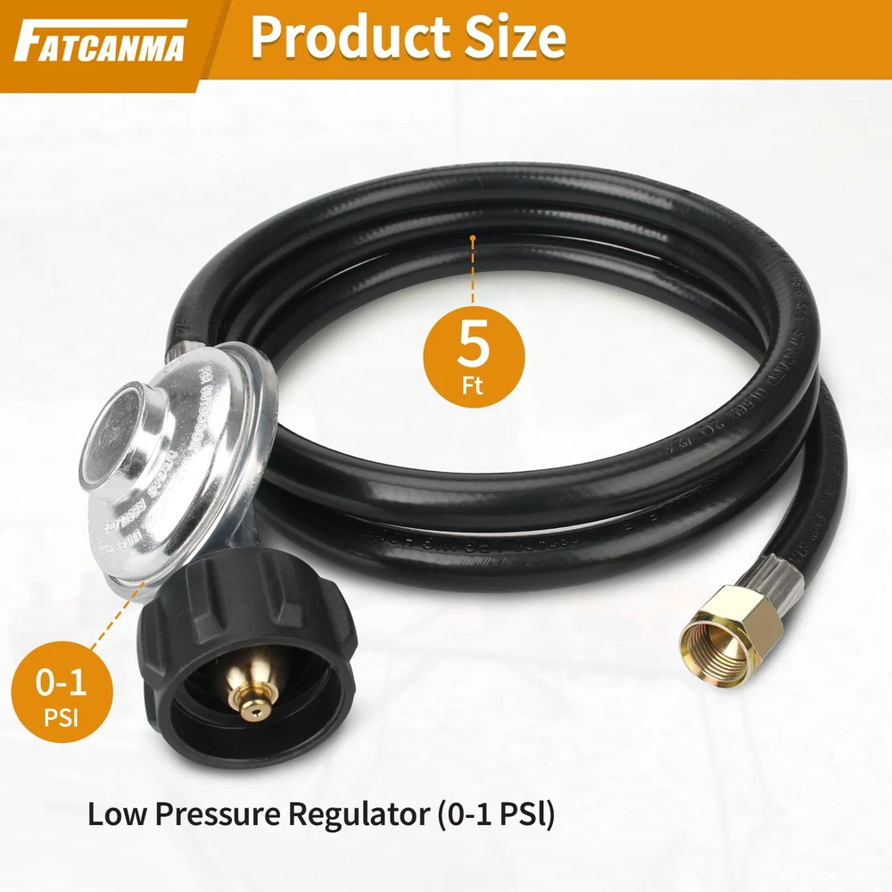 Propane Hose Apply: Gas grill regulator and hose Compatible with most heater, fire pit, lp generator, lantern, two burner camping stove, side burner, Fits for Weber, Char-broil, Nexgrill, Monument, Dyna-Glo, Brinkmann grill and other outdoor propane grills with 3/8" male flare fittings Gas Grill Hose: fits all appliances with a Type 1 (QCC-1) connector. 3/8" female flare, nut thread 5/8"-18UNF, 5/16" diameter propane adapter hose Quality Propane Hose Regulator: The QCC1 low pressure regulator and hose is made of high-quality brass and rubber tubing connection, which ensures a stable connection and a leak-free experience, and has the characteristics of long service life Easy to Use: Propane adapter hose are ready to use right out of the box. Use a tool to attach the regulator to a propane tank, cylinder, or propane gas appliance for a secure connection Note: Please confirm the model and size before purchasing.If you have any questions about this Propane Hose and Regulator, whether it is pre-sales or after-sales, please feel free to contact us through Amazon support for greater assistance
