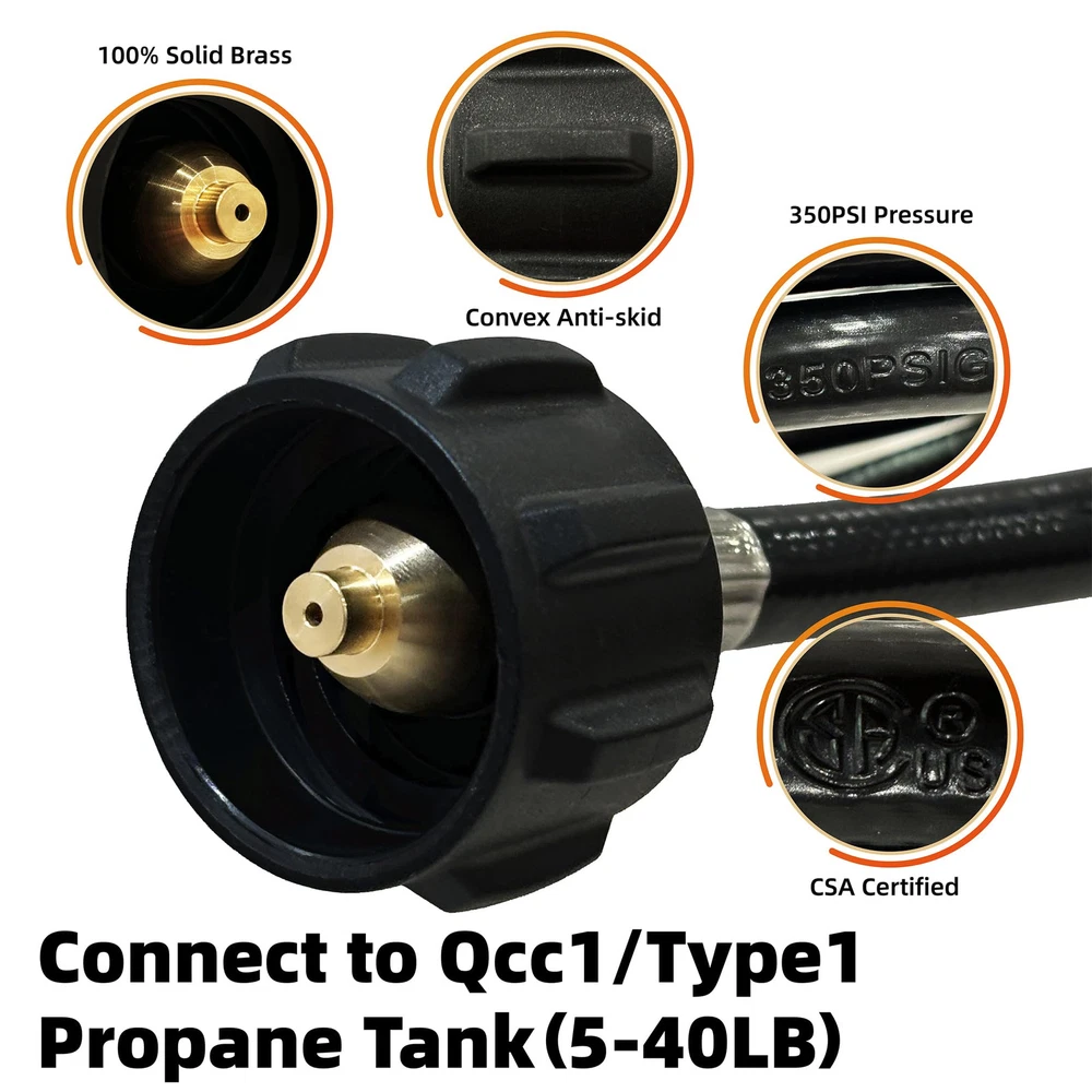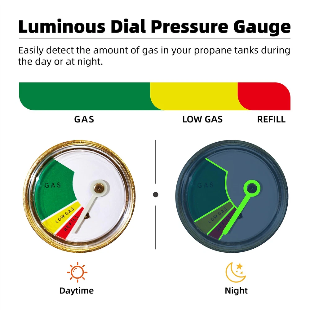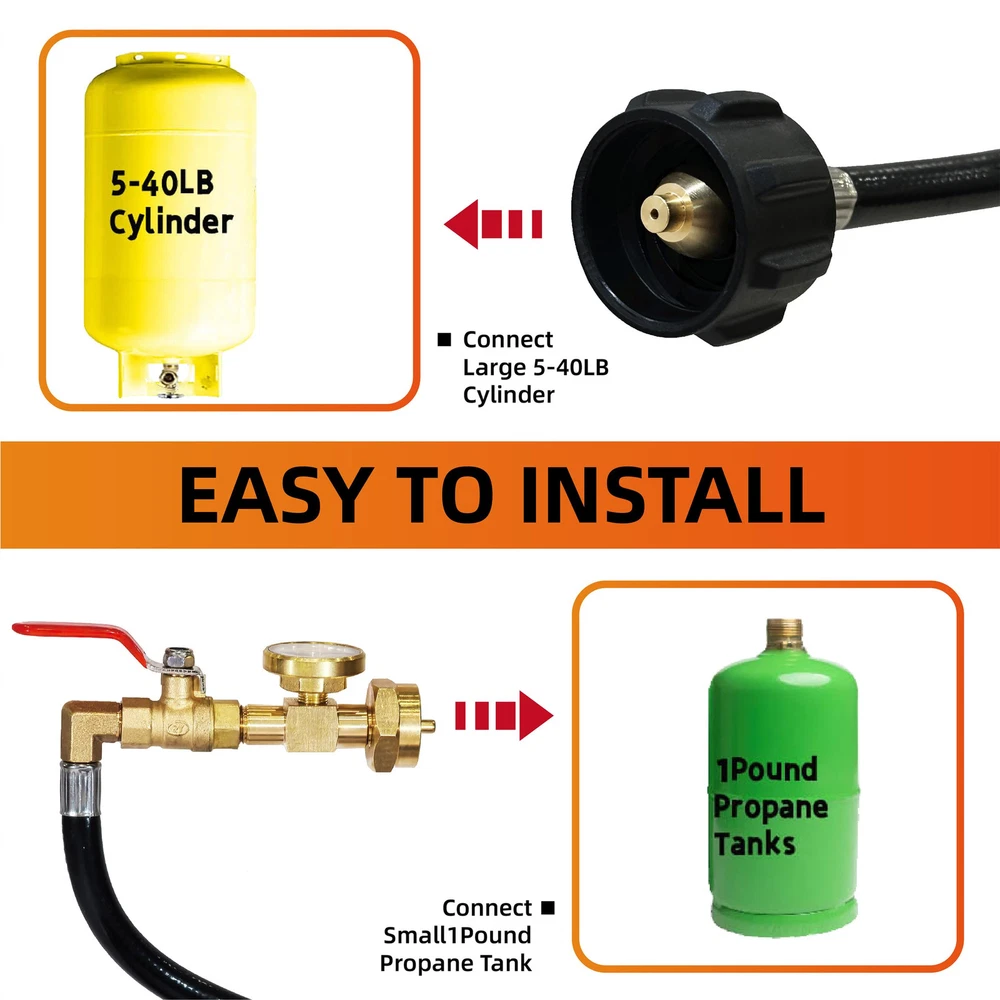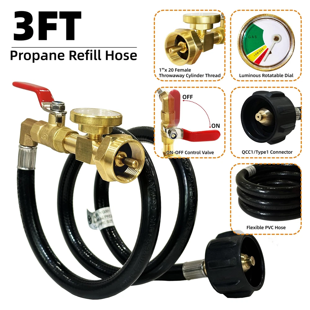 Upgraded Pressure Gauge with Glowing Needle:This propane refill adapter hose comes with a glowing rotating needle, allowing you to easily monitor the gas level in your refillable 1lb propane tanks, day or night. No need to shake the tank to check the gas level—perfect for nighttime use. It adds an extra layer of safety to your outdoor cooking or heating activities. High-Quality, Durable Materials:Made from 100% solid brass and durable, heat-resistant PVC, this propane refill hose is CSA certified. The PVC material makes the propane refill hose very flexible, allowing it to bend and maneuver easily for hassle-free use in any setup.Whether you're using it with a 1 lb refillable propane cylinder or connecting to larger propane tanks, this propane refill adapter hose offers a secure, leak-free connection, ensuring safety and reliability for years of use. Easy to Install and Use:Installing the propane refill hose is simple. Connect the adapter with tank gauge to your 1lb propane tank, attach the QCC1 connector to the larger tank, and use the control valve to manage refilling. This ensures accuracy and prevents leaks.NOTE: Invert the large tank, tighten connections, and close valves before use. Check for leaks and ensure proper ventilation. Avoid enclosed spaces and open flames. Monitor pressure regularly for safety. Wide Compatibility:Propane refill adapter hose lets you easily refill a 1lb propane tank directly from a 5-40lb propane tank. With broad compatibility, it's perfect for various outdoor activities like camping, picnicking, or cooking in the backyard. Precise Control and Safe Refueling:Propane filler adapter hose features an on-off control valve, giving you full control over the refilling process. You can stop or adjust the flow of propane at any time,ensuring added safety!