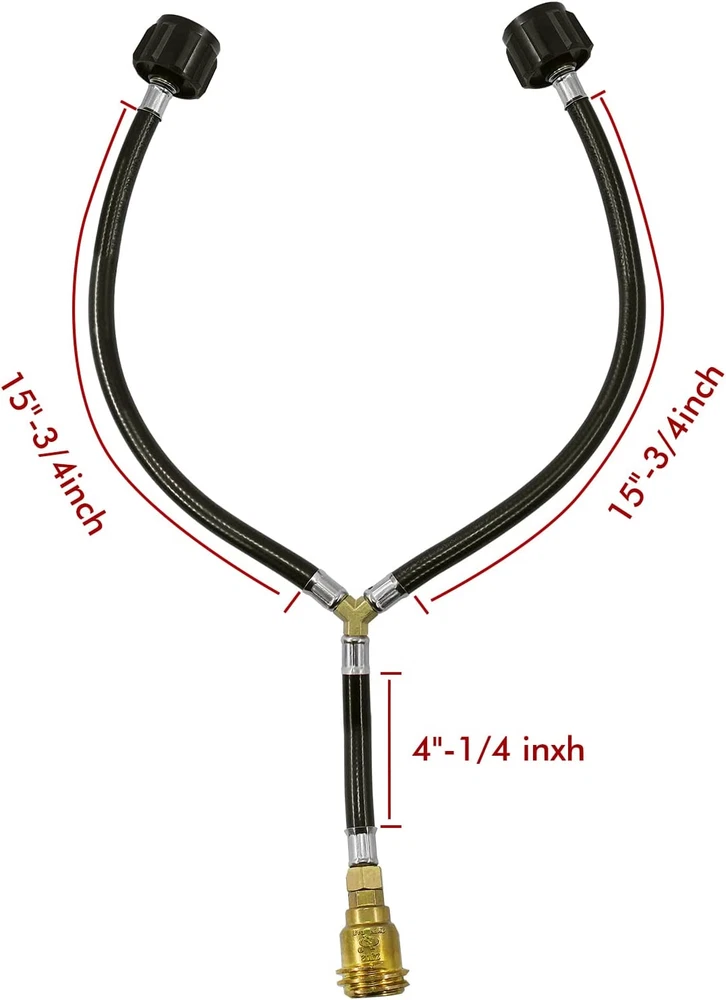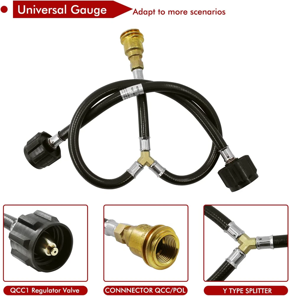 Universal Standard Specifications : Inlet is ACME nut 2 way QCC1/Type1 Tank propane gas fittings, Outlet is QCC1 Nut propane gas fitting adapter. Converter connected to 2 Lp propane gas tank hook up at the same time Features and Benefits: Y- Splitter propane hose converter adapter has CSA certified ,The lengths of the hoses on both sides of the splitter are 15.75 inch (400 mm ) respectively; The outlet branch pipe long 4.5 inch (100 mm); the maximum working pressure is 350 PSI; and it is suitable for 5 lb - 40 lb tanks. One device can connect two propane tanks at the same time. Outstanding Design : the outlet branch fitting is end outer QCC1/Typ1 male thread with inner POL female therad fitting adapter; which can be used to connect POL valve and QCC1 connector propane hose regulator Premium Quality: the dual propane tank connection kit is made of high-quality rubber, and 2 way splitter adapters are made of solid brass,built-in over-current and over-heat protection design; easy installation ,noot tools you can connect two propane tank equipment at the same time ; which can extend the use time. Don't worry that the propane will be used up quickly during use, and the operation is simple and convenient Wide range of applications: suitable for propane system RV trailers, fishing gear, turkey fryers, barbecues, lanterns, heaters, camping stoves, portable barbecues, desktop barbecues, camping stove,outdoor propane burner gas cooker, forge burner, heating needs or outdoor barbecues, etc