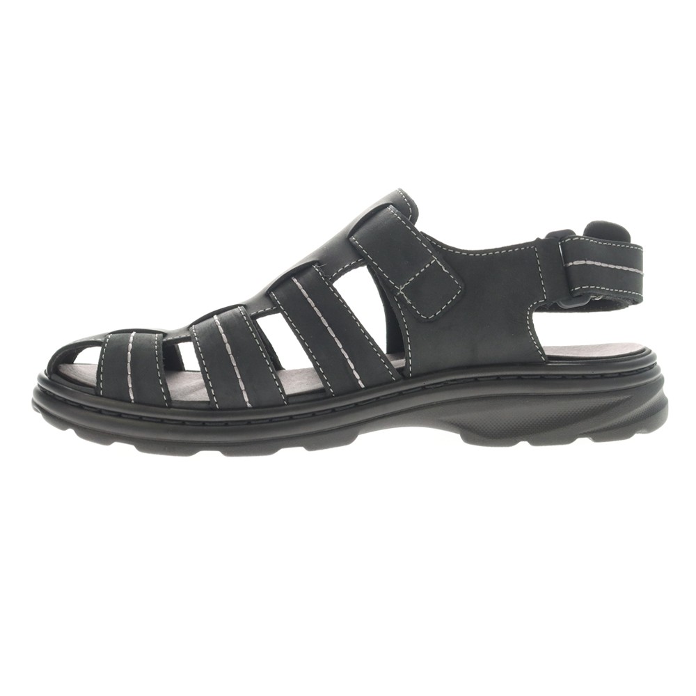 Hunter Fisherman Sandals Product Details Leather upper Orthotic Friendly removable insole Hook and loop closure Comfort technology Spot clean Color: Black This classic fisherman sandal brings together a full coverage comfort without sacrificing style. The Hunter is a full leather upper with a soft, comfortable neoprene lining to prevent rubbing. Fully adjustable hook and loop top straps for the perfect fit all day and a removable footbed so you can add your own orthotics. Additional Details Manufacturer Color: Black Color: Black Occasion: Casual Gender: Mens Age: Adult Brand: Propet