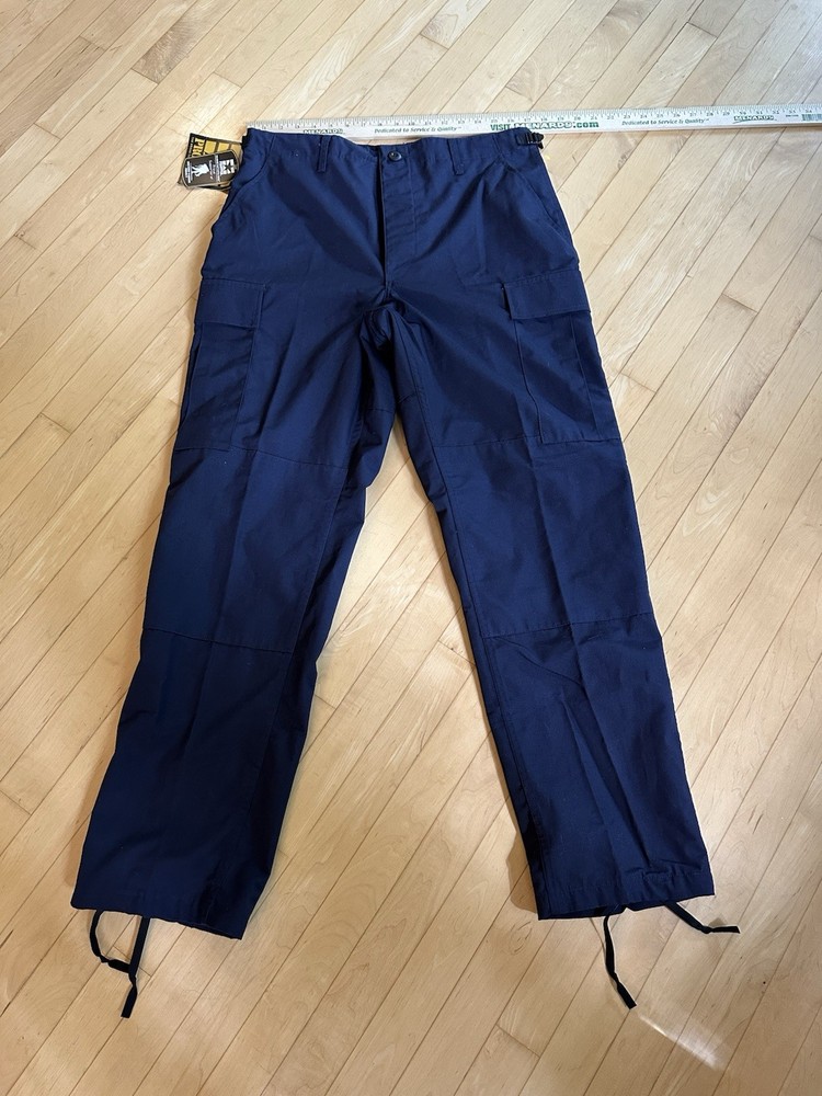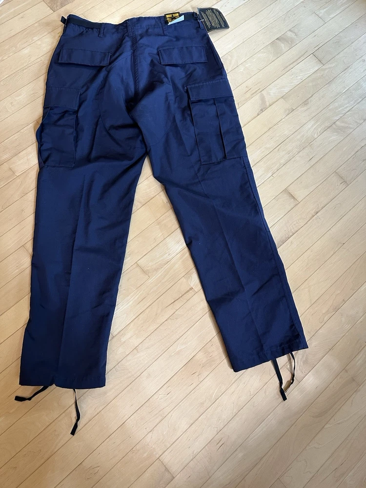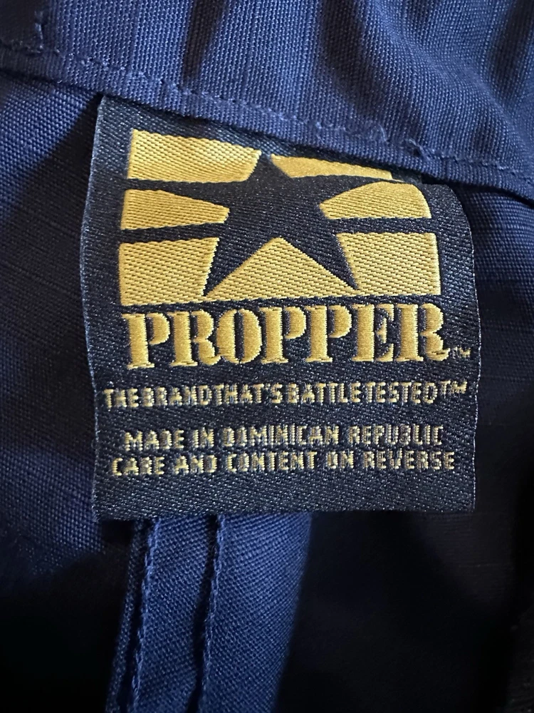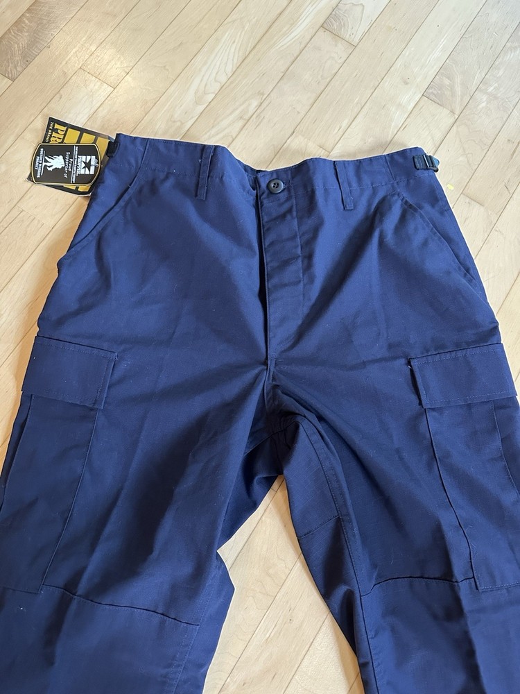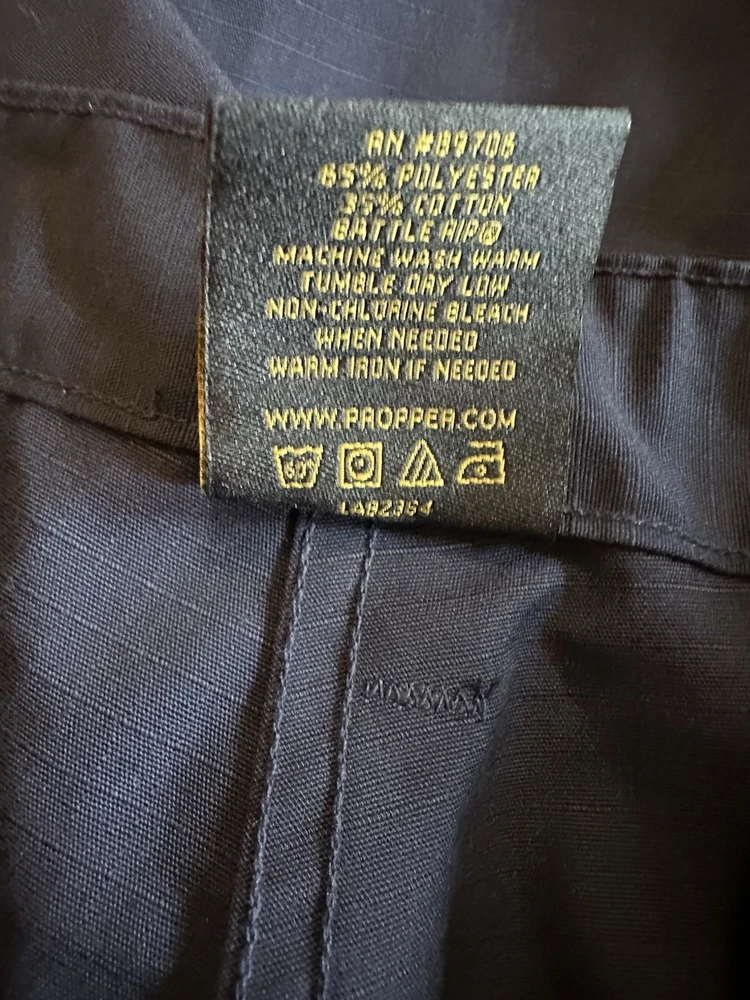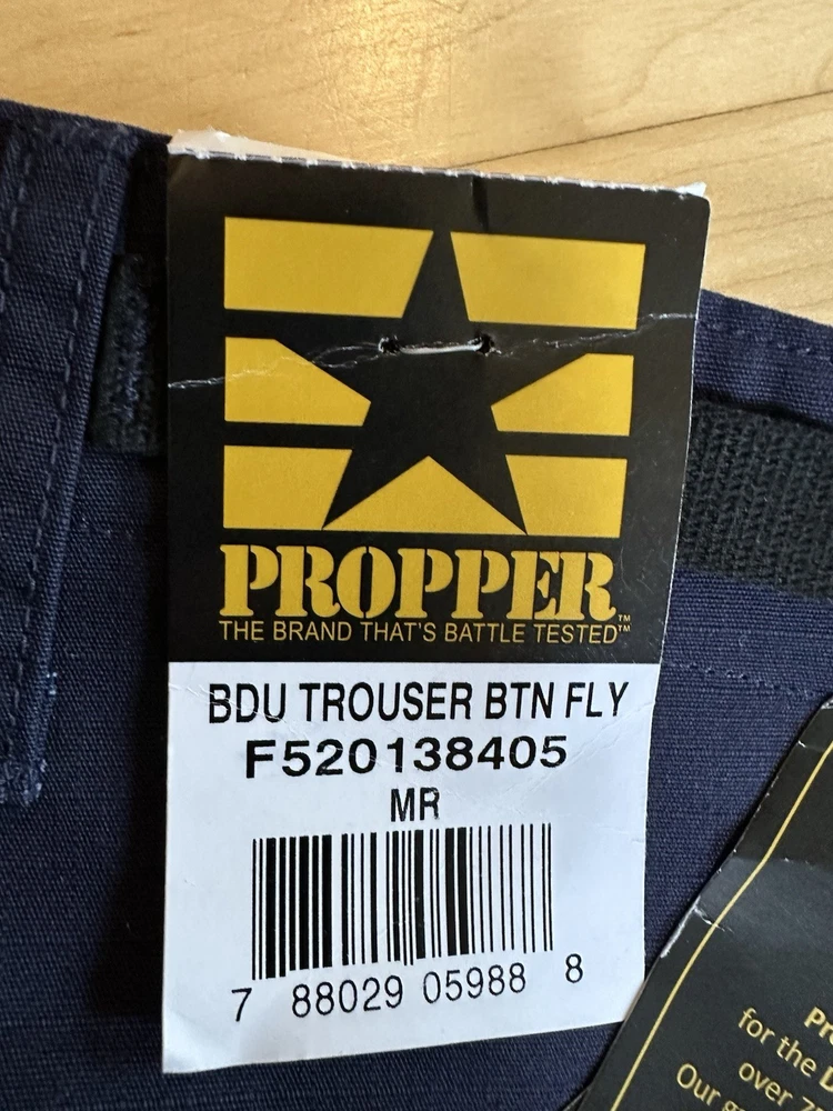 The Propper F520138405 is a dark navy blue BDU Trouser with a button fly and camouflage pattern. Made from a blend of polyester, cotton, and cotton blend materials, this medium regular fit pants feature a straight leg style and cargo pockets. Perfect for casual or business occasions, these machine washable pants are designed by the brand PROPPER and have a waist size of 32 inches. The versatile color and fabric make them suitable for all seasons. 2002