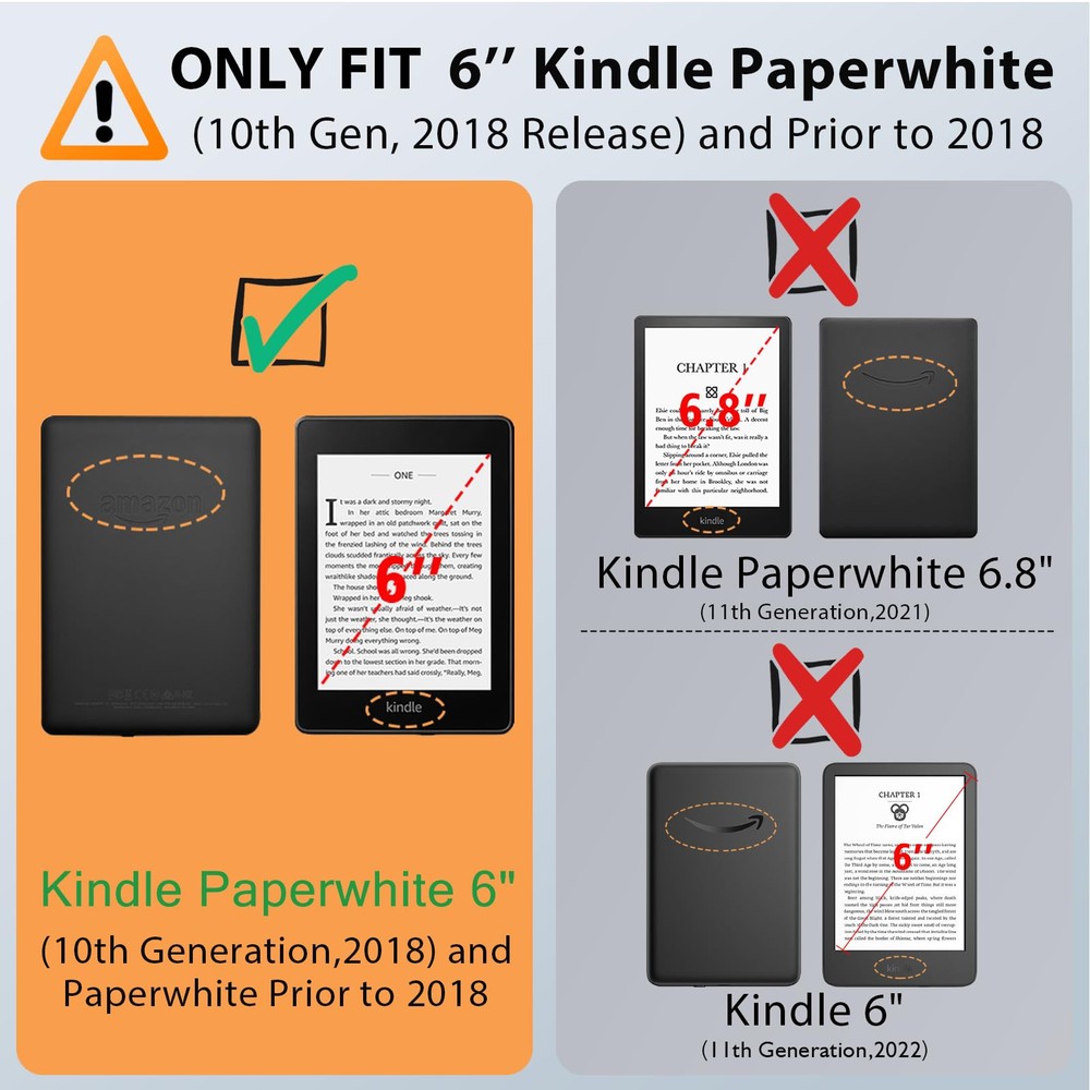 [Compatible]: Designed exclusively for 6" Kindle Paperwhite (Fits All-New 10th Generation 2018 / All Paperwhite Generations Prior to 2018). Please check the 2nd picture. [Hands-free]: With foldable stand design so you can set in on the table and read without having to hold it, the cover folds back and secures to back of case. Hand strap allows to read with one hand easier and more comfortable. [Multifunctional]: ensures cover is securely closed, secures your device without straps covering the front, protects kindle paperwhite when not using it; Build-in card slot is convenient to store your cards; Easy access to charge and turn on/off. [Auto-wake/sleep]: This case for kindle paperwhite 10th generation can auto wake or put your device to sleep by opening or closing the cover, saving power for longer reading time. [Protective]: Slim lightweight with premium quality PU leather. The no-scratch microfiber interior adds comfort and an additional layer of protection. Prevent from finger prints, dirt, and scratches.