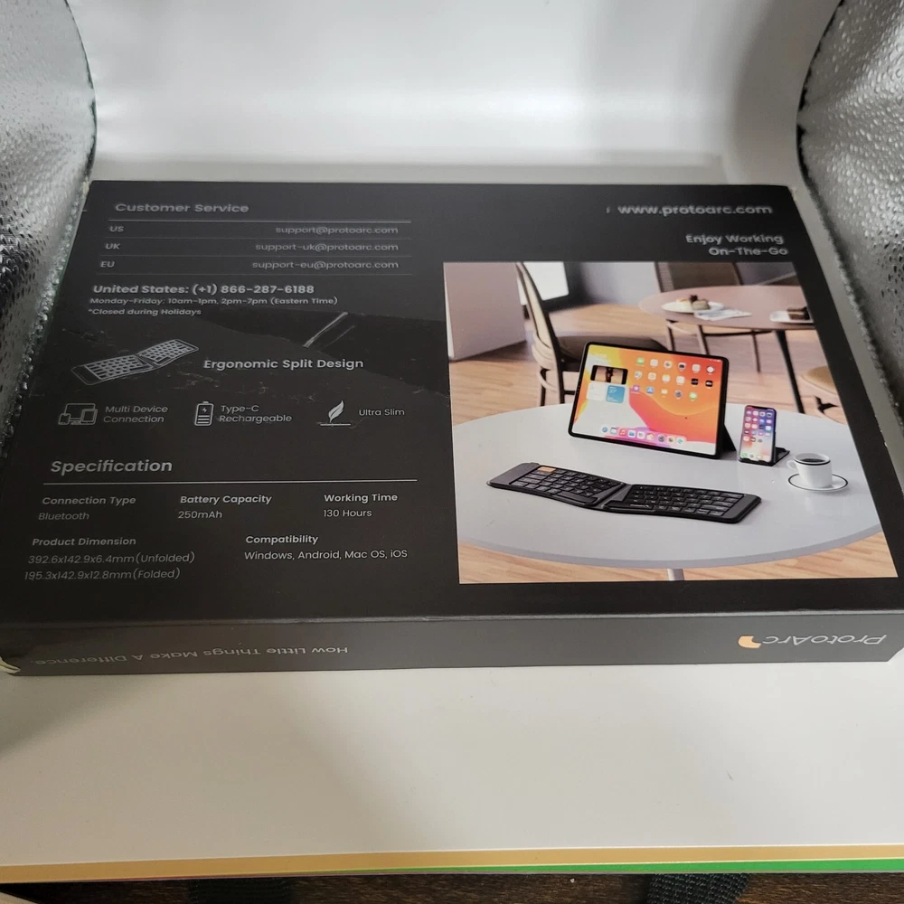 UPC:Does not applygtin13:Does not applyType:ErgonomicConnectivity:BluetoothBrand:ProtoArcModel:XK03Features:FoldableColor:BlackKeyboard Language:EnglishWeight:1.12 PoundsPackage Dimensions LxWxH:9.88x6.77x1.42 InchesState limitations:Cannot ship to California
