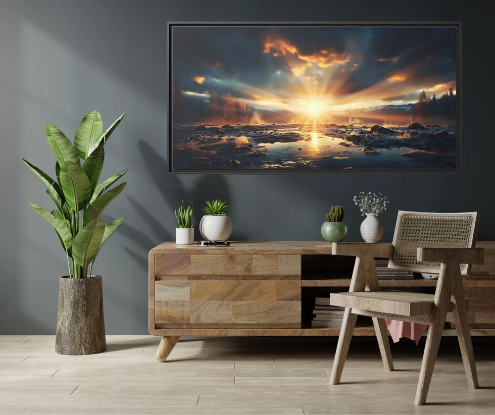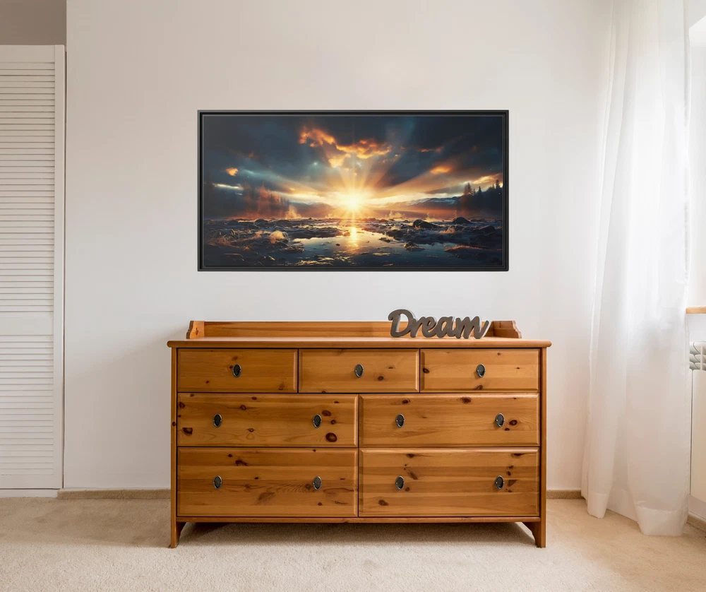"Falling Light, Rising Beauty" – Epic Sunset Landscape Illustration Product Description: Immerse yourself in the breathtaking splendor of " Falling Light, Rising Beauty " , a licensed reproduction of an AI-generated epic sunset landscape by Hypnotik Creations. This panoramic masterpiece captures the golden hues of twilight as they cascade across a tranquil, wide-angle view, blending rich and vivid colors with dramatic light and shadow. The scene radiates beauty and serenity, making it a perfect focal point for your home or office. Expertly printed in HDR on museum-quality cotton-polyester composite gallery-wrapped canvas , this artwork features a special proprietary matte finish coating that enhances detail and guarantees long-lasting vibrancy. Using state-of-the-art printing technology and UL-certified Greenguard Gold inks , the image delivers stunning, eco-friendly clarity while being non-toxic, non-hazardous, and non-flammable. Choose between two elegant display options: with or without the 1.25" solid pine wood frame in black . The handcrafted frame, sustainably sourced and FSC-certified, adds a sleek floating effect, elevating the canvas to gallery-quality perfection. Both options are ready to hang out of the box , with sawtooth hardware pre-attached and rubber dots ensuring the canvas stays securely in place. Whether displayed in a living room, bedroom, or office, " Falling Light, Rising Beauty " is an awe-inspiring piece that brings the magic of nature into any space. Available framed or unframed, this eco-conscious artwork is a timeless investment in style and tranquility. Key Features: Title: " Falling Light, Rising Beauty " by Hypnotik Creations Design: Panoramic sunset landscape featuring epic colors and a dramatic wide-angle view. Material: Museum-quality cotton-polyester composite gallery-wrapped canvas with a proprietary matte finish for vibrant, long-lasting color. Printing: HDR printing with UL-certified Greenguard Gold latex inks ensures eco-friendly, non-toxic, and high-quality imagery. Frame Options: Framed: 1.25" solid black pine wood frame with a floating effect, FSC-certified and sustainably sourced. Unframed: Same premium materials without the frame. Eco-Friendly: Made with sustainable materials and safe, environmentally responsible inks. Ready to Hang: Pre-attached sawtooth hardware and rubber dots for secure installation. Size Variations: Slight deviations of +/- 1/8" (3.2mm) due to production processes. Care Instructions: Wipe gently with a clean, damp cloth to remove dust or smudges. Size Options: 32x16, 48x24, 60x30. Transform your space with the timeless beauty of " Falling Light, Rising Beauty " , a stunning sunset panorama that exudes warmth, elegance, and a sense of wonder. 4o * Shipping to Alaska, Hawaii, and unincorporated territories of the United States can take additional 7 ? 12 business days, weather permitting.