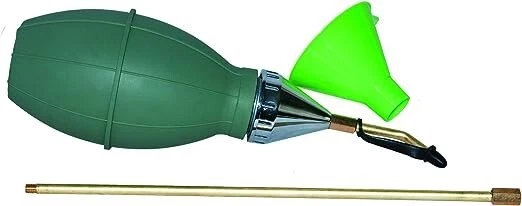 Puffy D Insecticidal Duster (512) comes with a 12” applicator, a plastic funnel for filling, and a short bent tip that allows you to dust easily in cracks and crevices. This duster may be used to apply both dusts and granular and will hold up to 14 oz of dust. Thick, pliable rubber body with metal top and brass tip holds up to 14 oz. of insecticide dust Heavy duty and manufactured for years of repeated use Includes optional 12-inch brass extension and curved tip for hard-to-reach areas Rupper tip for protection around electricity Screw top lid and funnel for easy filling and end cap to prevent powder leakage