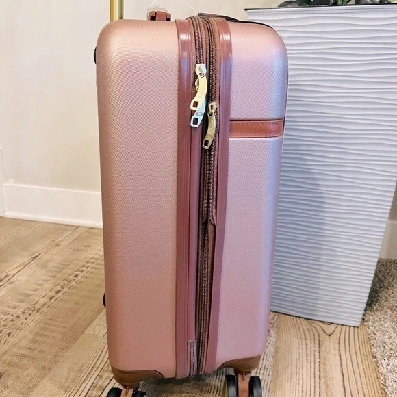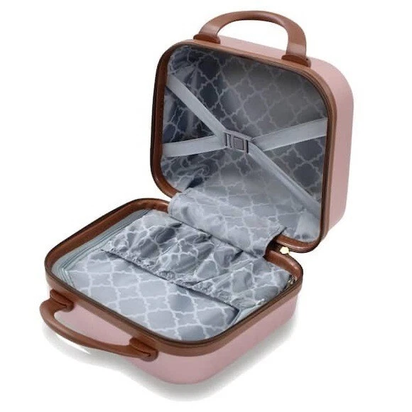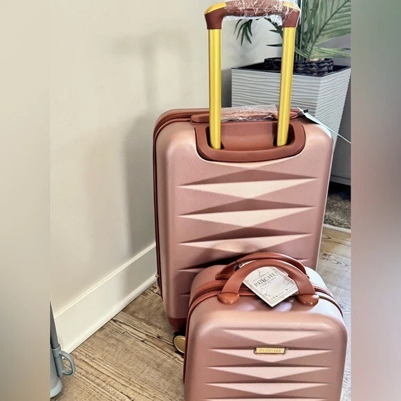 Puiche Jewel 2-Piece Rose Gold Carry-On Weekender Expandable Spinner Luggage Set, suitcase Elevate your travel experience with the Jewel collection by Puiche - a stunning two-piece set featuring a chic vanity case and a spacious carry-on. The carry-on offers smart organization with a roomy compartment, zippered separator, mesh organizer, and elastic clothing straps. Glide effortlessly with four 360° double spinners and an adjustable telescopic handle. Stay prepared with the vanity case's ample space and inner elastic straps, perfect for toiletries and cosmetics during air travel. Chic design: the scratch-resistant hardshell boasts an eye-catching pattern, complemented by accents for a contemporary yet classic look Smart organization: the carry-on opens to reveal a spacious compartment with a zippered separator (up to 20% more), mesh organizer, and elastic clothing straps to keep your belongings neat and organized Effortless mobility: enjoy seamless travel with four 360° double spinners and an adjustable telescopic handle on the carry-on Accessory bliss: the vanity case provides secure storage for toiletries and cosmetics with 2-pouches and buckled elastic straps Dimensions (Weight): 20 x 13.5 x 9 in. (5.9 lb.) +2 in. for external / 11 x 12 x 7 in. (1.9 lb.) +2 in. for external