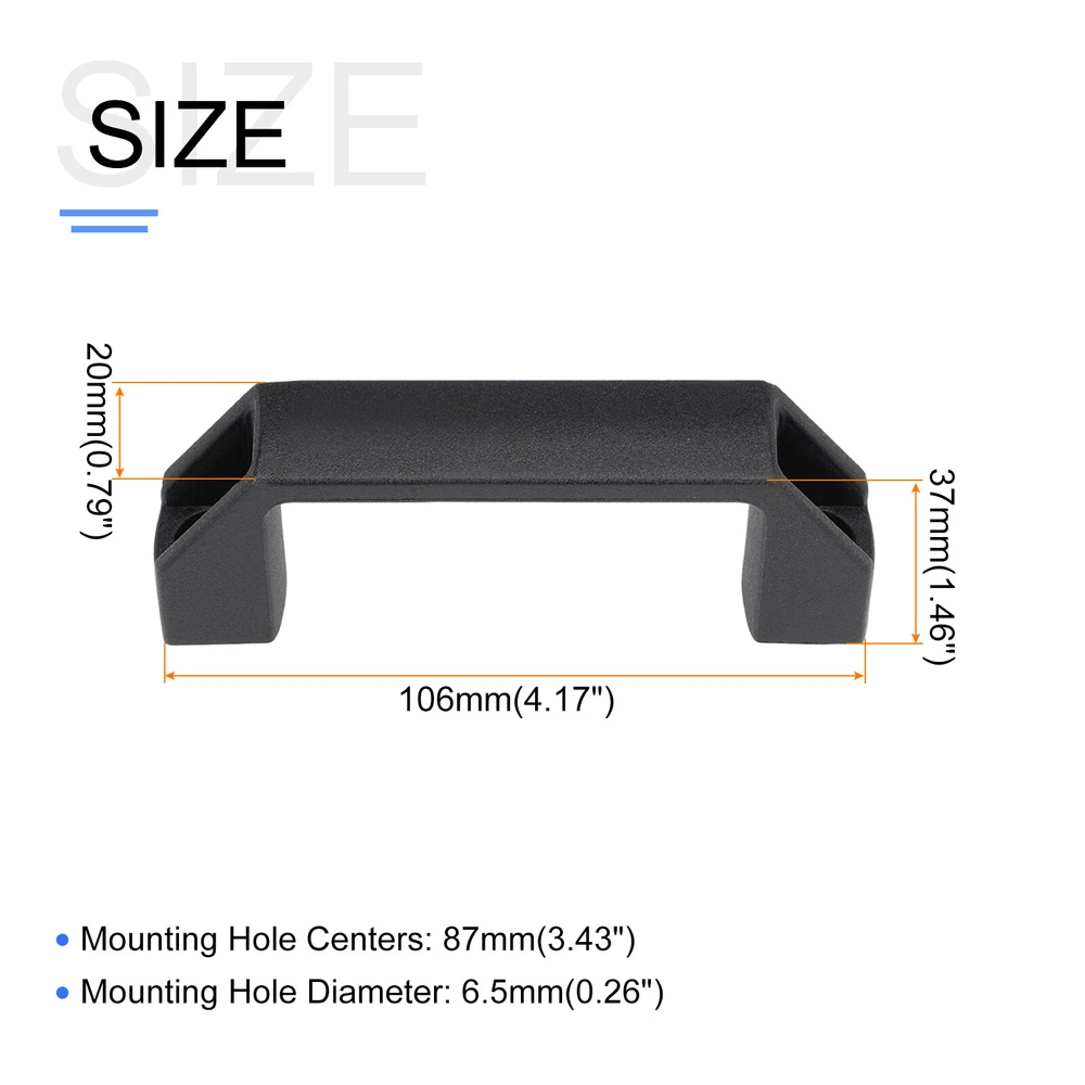 Document APPLY TO - Can be used in home door, window, cabinets, tables, drawers, cupboard, cases, closet, machine, equipment etc.SPECIFICATION:Material: PlasticMounting Hole Centers: 87mm/3.43"Mounting Hole Diameter: 6.5mm/0.26"Total Size: 106mm(L)x20mm(W)x37mm(H)/4.17"x0.79"x1.46"QUANTITY INCLUDED - 4pcs x Pull HandleADVANTAGE - Made of good strength plastic material, the pull handle is durable, corrosion-resistant, non-fading, not easy to deform and can be used for a long time.Note: Please confirm the thickness of the board before purchasing it. The mounting screws are not included. Pull Handle(106mmx20mm)4Pcs,for Home Cabinet Cupboard Door Drawer Handle, Black APPLY TO - Can be used in home door, window, cabinets, tables, drawers, cupboard, cases, closet, machine, equipment etc. SPECIFICATION: Material: Plastic Mounting Hole Centers: 87mm/3.43" Mounting Hole Diameter: 6.5mm/0.26" Total Size: 106mm(L)x20mm(W)x37mm(H)/4.17"x0.79"x1.46" QUANTITY INCLUDED - 4pcs x Pull Handle ADVANTAGE - Made of good strength plastic material, the pull handle is durable, corrosion-resistant, non-fading, not easy to deform and can be used for a long time. Note: Please confirm the thickness of the board before purchasing it. The mounting screws are not included. Hot Item Payment 1.We accept eBay payment . 2.Payment must be received within 7 business days of auction closing. Shipping 1.We ship to your eBay or Paypal address. Please make sure your eBay and Paypal address is correct before you pay. 2.Items will be shipped within 1-3 business day when we received payment. 3.Delivery time depends on destination and other factors. Description Policy Pull Handle(106mmx20mm)4Pcs,for Home Cabinet Cupboard Door Drawer Handle, Black APPLY TO - Can be used in home door, window, cabinets, tables, drawers, cupboard, cases, closet, machine, equipment etc. SPECIFICATION: Material: Plastic Mounting Hole Centers: 87mm/3.43" Mounting Hole Diameter: 6.5mm/0.26" Total Size: 106mm(L)x20mm(W)x37mm(H)/4.17"x0.79"x1.46" QUANTITY INCLUDED - 4pcs x Pull Handle ADVANTAGE - Made of good strength plastic material, the pull handle is durable, corrosion-resistant, non-fading, not easy to deform and can be used for a long time. Note: Please confirm the thickness of the board before purchasing it. The mounting screws are not included. Hot Item Payment 1.We accept eBay payment . 2.Payment must be received within 7 business days of auction closing. Shipping 1.We ship to your eBay or Paypal address. Please make sure your eBay and Paypal address is correct before you pay. 2.Items will be shipped within 1-3 business day when we received payment. 3.Delivery time depends on destination and other factors.