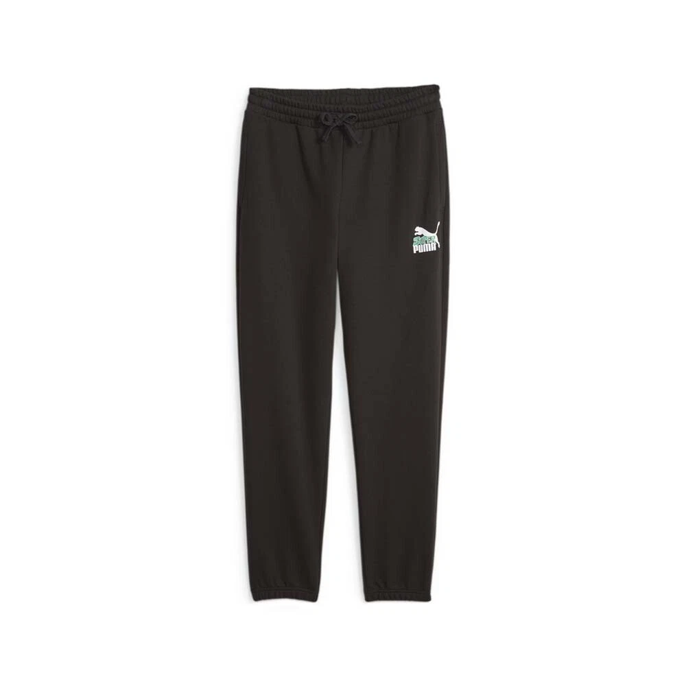 Classics Super Sweatpants Product Details Regular Fit Elastic waistband with external drawcord for customized comfort 2 front pockets 1 Back pocket Graphic print on the front and back Depicting PUMA's iconic feline superhero from '70s comic book series, these sweatpants feature standout graphics on the front hip and back pocket. Wear them alone or pair them with the matching hoodie to channel Super PUMA head-to-toe. Additional Details Color: Black Occasion: Casual Gender: Mens Age: Adult Brand: Puma