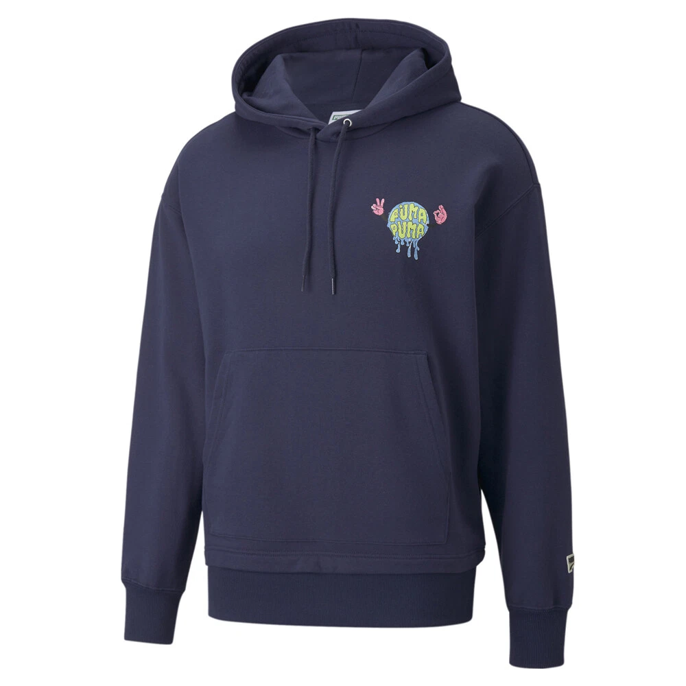 Downtown Graphic French Terry Pullover Hoodie Product Details A relaxed fit for a laid-back look from head to toe Functional kangaroo pocket with space for small items Ribbed cuffs and hem for a masculine silhouette 70% cotton , 30% cotton Recycled Easy to style and easier to wear: this Downtown Hoodie is an eclectic take on a comfort classic, with an eye-catching print graphic panel that adds a touch of unpredictability to any outfit. A kangaroo pocket, hood with adjustable drawstring, and ribbed cuffs and hem complete the look. Additional Details Color: Blue Occasion: Casual Gender: Mens Age: Adult Brand: Puma