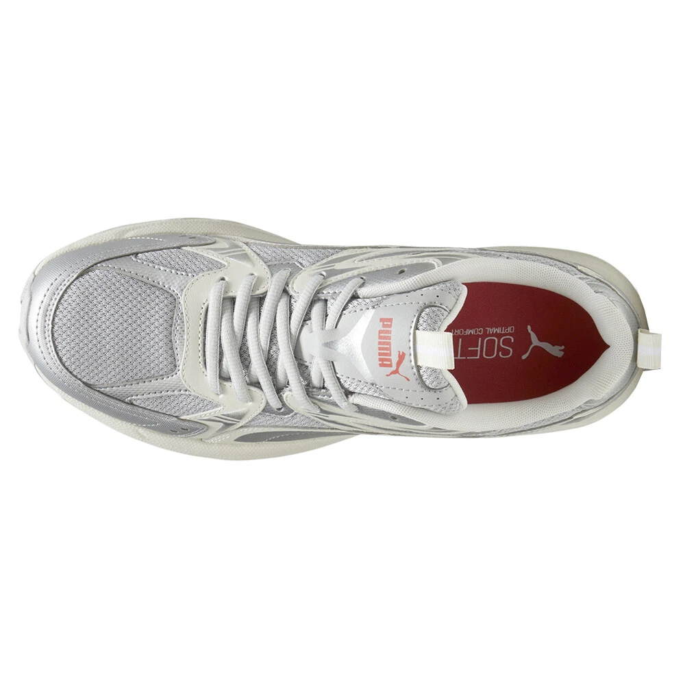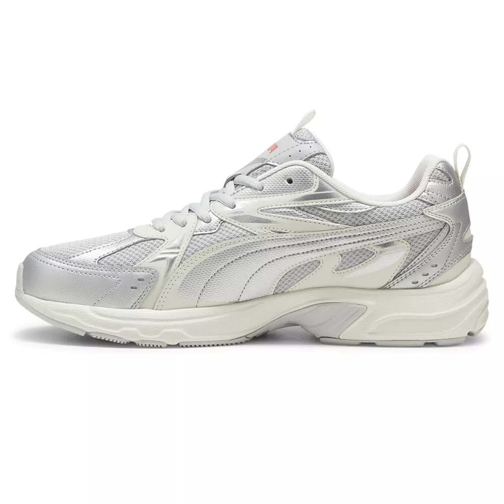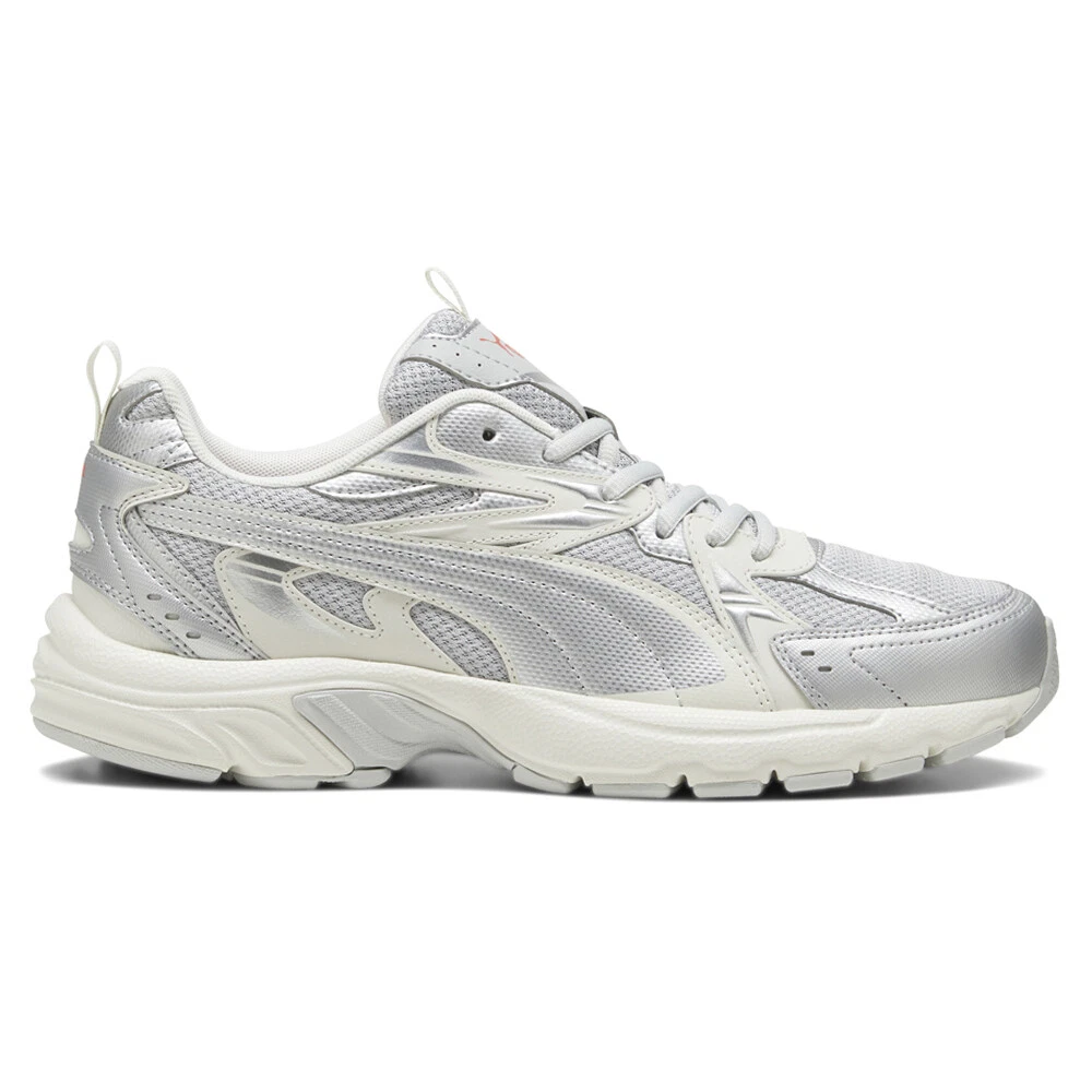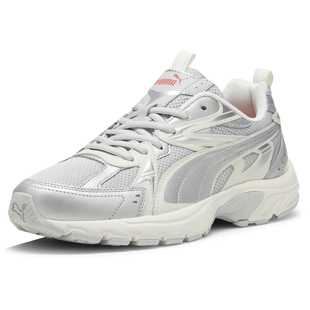 Milenio Tech Lace Up Sneakers Product Details Sportstyle fashion sneakers inspired by 2000s running designs Lightweight and breathable upper constructed of airy mesh and synthetic overlays Bright metallic accents on the upper adds captivating style you can't miss Rubber outsole for durable traction across surfaces IMEVA midsole for enhanced shock absorption and lightweight support Energize your look by bringing back the best of Y2K-era style with the Men's Puma Milenio Tech Casual Shoes. Combining airy mesh with metallic accents that were a mainstay on technical running sneakers at the turn of the millennium, the Milenio Tech highlights archival silhouettes and elevated materials to get your everyday attire up to speed. Additional Details Color: Grey Occasion: Casual Gender: Mens Age: Adult Brand: Puma