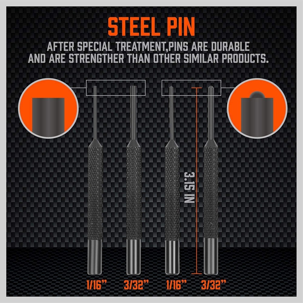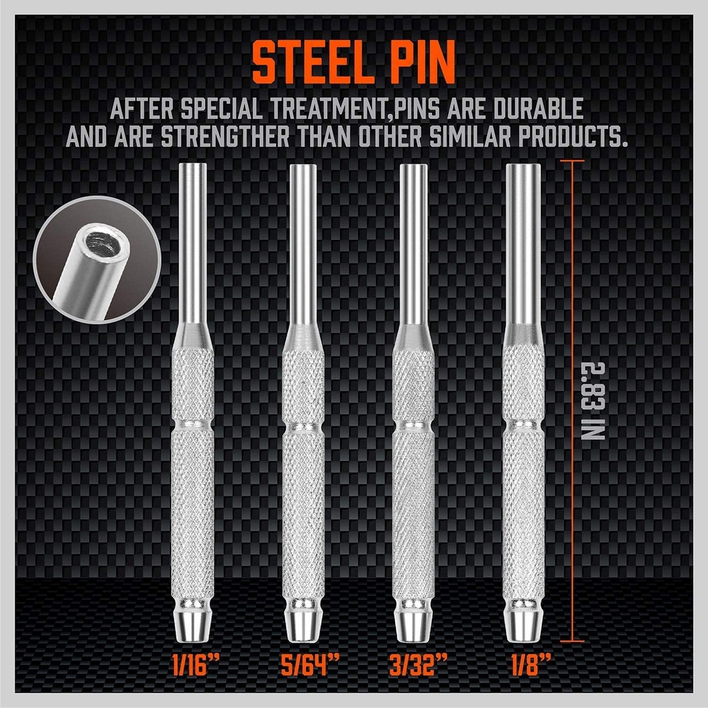 22 Piece Double Face Hammer and Punch Set includes a chrome-plated steel hammer with nylon and brass heads. The set provides 4 interchangeable hammer heads (rubber, brass, steel, and nylon) for versatility. It also features 8 steel punches in various sizes, made from durable, high-quality steel. 2 roll pin installation punches and 2 plastic punches offer precise handling. The bench block protects against scratches and includes anti-slip pads for stability during use. Ideal for precise, damage-free work. 【Double Face Hammer】Chrome plated steel hammer has nylon and brass heads to ensure strong, but non-marring contact while in use. We provide you with 4 interchangeable hammers (rubber, brass, steel and nylon). You can choose the right hammers according to your needs. 【Brass】8Pcs roll pin punch including 1/8", 9/64", 5/32", 3/16", 7/32", 1/4", 9/32" and 5/16" ,Made of brass punch set for use with surfaces that may be damaged by steel punches. 【Hollow End】4 Pcs hollow end starter punch set including 1/16”, 5/64”, 3/32”, 1/8”. 【Quality Steel】4 Pcs steel punch including: 2 each of 1/16" and 3/32", after special treatment,pins are durable. 【Special Plastics】2 Pcs sturdy plastic punch including 15/64", 3/8",used special treatment of plastic, has higher hanroness ang higher density