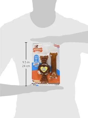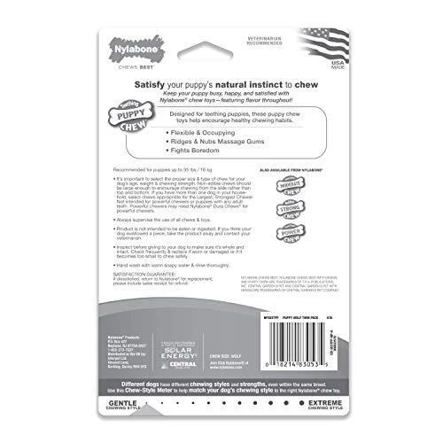 Puppy Chew Toy Twin Pack - Puppy Chew Toys for Teething - Puppy Supplies - Chicken Flavor, Medium/Wolf (2 Count) Flexible chew toy and nylon bone help with puppy teething while cleaning teeth and freshening breath Chew toys keep puppies busy and help prevent destructive chewing Proudly made in the USA Mini chew toys intended for puppies up to 15 pounds Contain delicious flavor medley and chicken flavor dogs love Every chew toy’s unique shape, individual texture, and gotta-have-it flavor is created with purpose and love to give your dog what they need, when they need it! Chicken flavor dogs love Chew toy dimensions: Out of package measures 5.5" long x 1.75 " wide x 1" high Treat your new family member to this perfect combination of puppy toys! This value pack includes two long lasting chew toys designed to encourage positive chewing habits. The first puppy toy is made of softer, flexible material made just for teething puppies! The second is a durable nylon bone for your puppy to chew when he has all of his adult teeth. Both toys help promote clean teeth and discourage destructive chewing. These chew toys are the perfect pastime for your teething puppy! Color may vary. What your dog chews matters! With destructive behavior among the leading reasons dogs are returned to shelters, we know healthy habits can make a life-changing difference. For 70 years, our family-founded brand continues to safely satisfy dogs’ chewing instincts and help them stay in loving forever homes! Shipping We offer FREE shipping on all orders! We ship within Three business days of payment, usually sooner. We use a selection of shipping services such as UPS, FedEx, USPS etc. We only ship to the lower 48 states, no APO/FPO addresses or PO Boxes allowed. Local pickups and combined shipping options are not provided at this time. Return You can return a product for up to 30 days from the date you purchased it. Any product you return must be in the same condition you received it and in the original packaging. Please keep the receipt. Payment We accept payment by any of the following methods: PayPal Please pay as soon as possible after winning an auction, as that will allow us to post your item to you sooner! Feedback Customer satisfaction is very important to us. If you have any problem with your order, please contact us and we will do our best to make you satisfied. Contact Us If you have any queries, please contact us via ebay. We usually respond within 24 hours on weekdays. Please visit our eBay store to check out other items for sale! Thank you for shopping at our store.