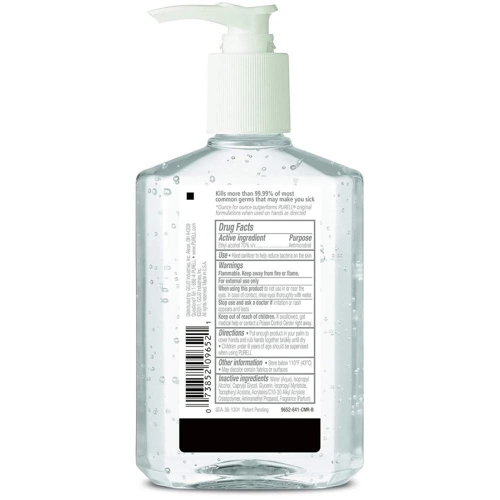 Product Description Purell Advanced Hand Sanitizer Refreshing Gel, Moisturizers & Vitamin E, With Pump Dispenser, 8 Fluid Ounce (Pack Of 6) Purell Advanced Hand Sanitizer Refreshing Gel. Purell hand sanitizer is the No. 1 brand most used by hospitals, and it is preferred by healthcare workers. It is proven to kill 99.99 percent of most common germs, without damaging skin. With a blend of four moisturizers, Purell hand sanitizer is perfect for frequent use. The mild formulation is free of parabens, phthalates, preservatives, and harsh ingredients, so it does not dry out or irritate skin. Hands feel soft, even after many uses. Purell hand sanitizer is free of triclosan and will not create supergerms, as the alcohol formulation kills germs fast and evaporates quickly, so germs don’t become resistant. 2X Sanitizing Strength. One squirt of PURELL Advanced Hand Sanitizer equals two squirts of other national brands. Outperforms other sanitizers ounce-for-ounce Show you care about well-being with PURELL Advanced Hand Sanitizer Refreshing Gel, which eliminates 99.99 percent of germs on hands Features a refreshing clean scent and evaporates quickly for easy, convenient sanitizing when soap and water are not available Mild formula and a blend of four moisturizers means hands feel soft even with repeated use; it‰۪s free of triclosan, parabens, phthalates, and preservatives so it doesn't dry out or irritate skin Perfect for frequent use. Mild formulation with 4 moisturizers is free of triclosan, parabens, phthalates, and preservatives so it does not dry out or irritate skin. Help your family and those you care for kill germs on their hands with PURELL Advanced Hand Sanitizer Refreshing Gel. Using PURELL hand sanitizer is a convenient and gentle way to kill germs Perfect for frequent use. Mild formula is free of parabens, phthalates, preservatives and harsh ingredients; so it does not dry out or irritate skin. Hands feel soft, even after many uses Ingredients Active Ingredients: Ethyl Alcohol (70%) v/v. Purpose: Antimicrobial. Inactive Ingredients: Water (Aqua), Isopropyl Alcohol, Caprylyl Glycol, Glycerin, Isopropyl Myristate, Tocopheryl Acetate, Acrylates/C10-30 Alkyl Acrylate Crosspolymer, Aminomethyl Propanol, Fragrance (Parfum). Active Ingredients Ethyl Alcohol Inactive Ingredients Water (Aqua); Isopropyl Alcohol; Caprylyl Glycol; Glycerin; Isopropyl Myristate; Tocopheryl Acetate; Acrylates/C10-30 Alkyl Acrylate Crosspolymer; Aminomethyl Propanol; Fragrance