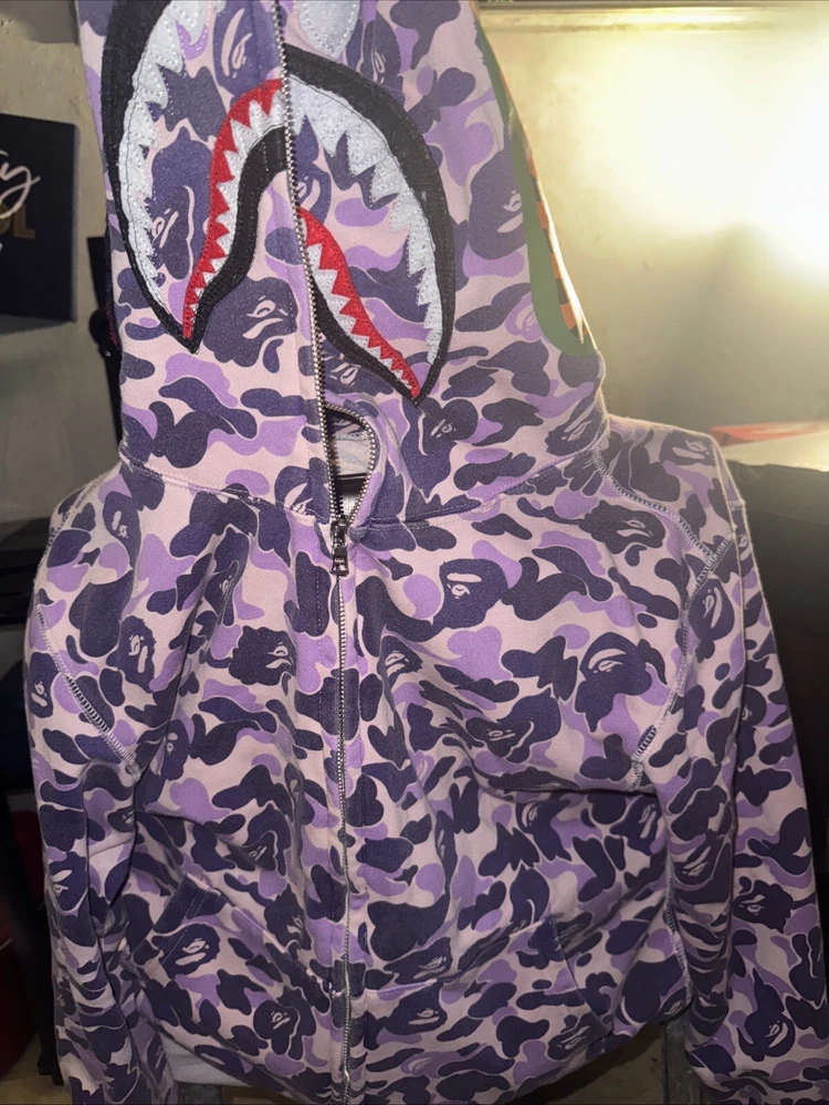 Great condition barley worn, This stylish Lilac Bape hoodie is a must-have for any fashion-forward man. The striking purple color is sure to turn heads and make a statement. Made from high-quality materials, this hoodie is designed to provide comfort and durability, making it perfect for everyday wear. Ideal for men who appreciate activewear, this hoodie is suitable for a range of occasions. Whether you're hitting the gym or simply running errands, this versatile hoodie is the perfect addition to your wardrobe. With its eye-catching design and high-quality construction, it's sure to become a favorite.