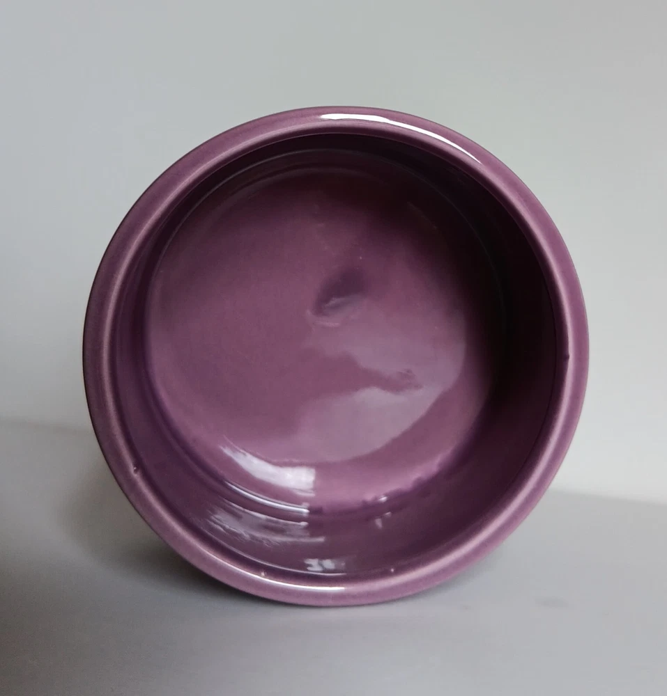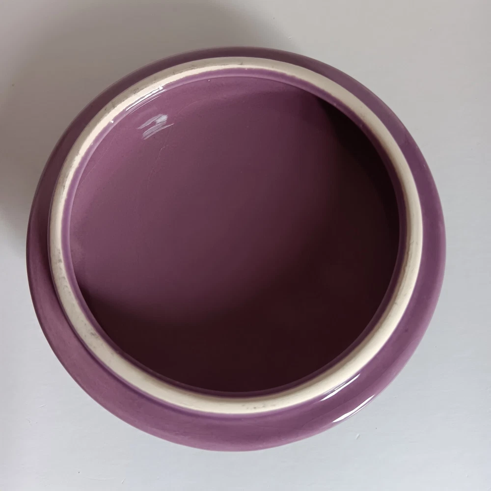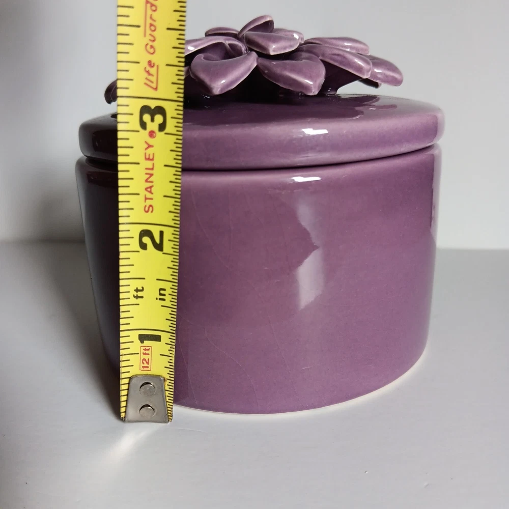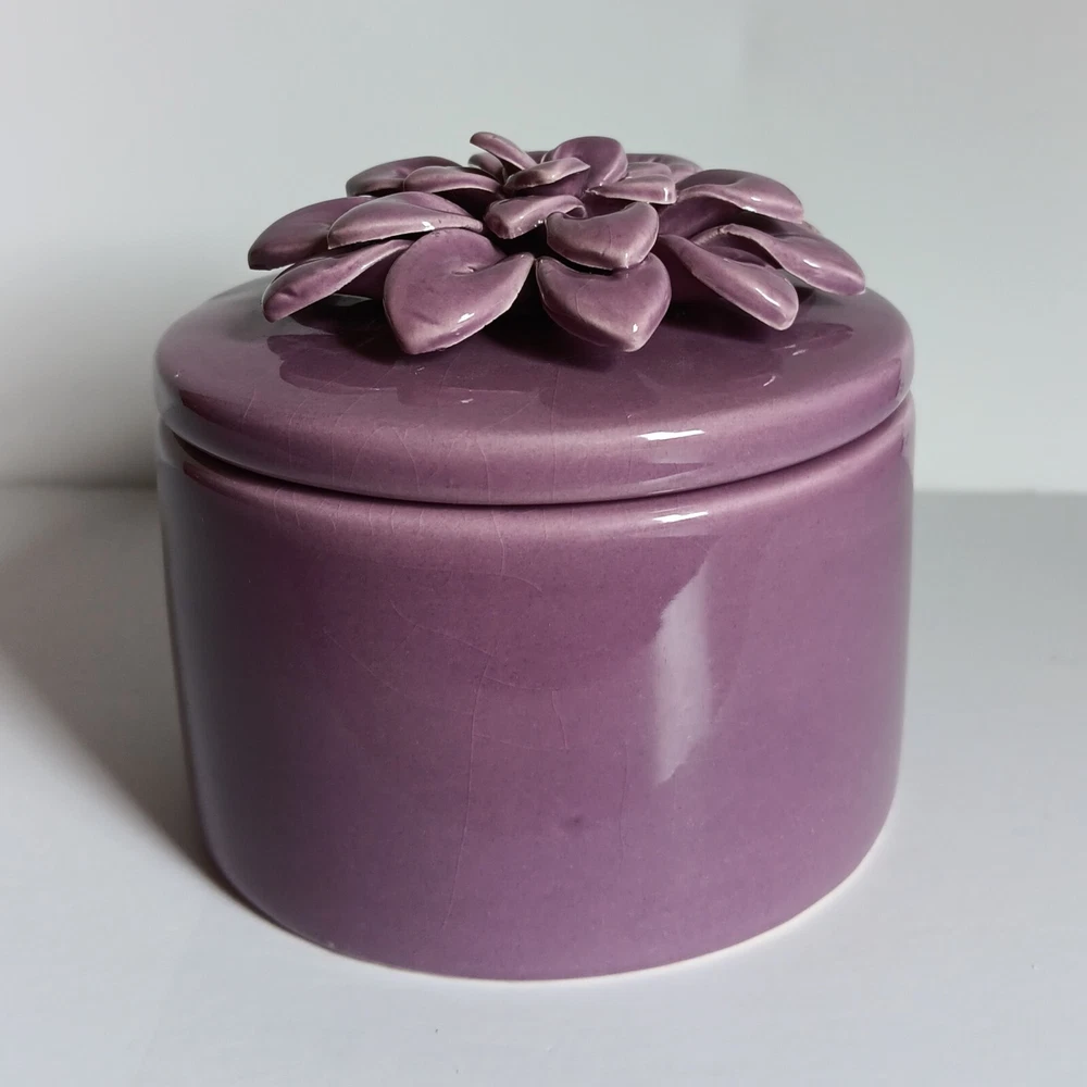 Lovely ceramic jar with lid. It is 4 inches wide and approximately 4 inches tall. The lid has a flower on it and the whole jar is a pretty mauve color. Would be perfect for holding bracelets. Has some crazing on the glaze. I didn't even notice it until I took the pictures for the listing, so I would say it is not obvious.