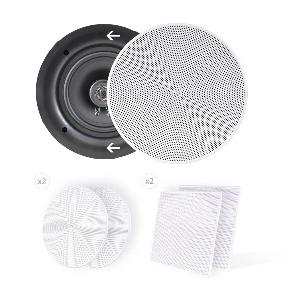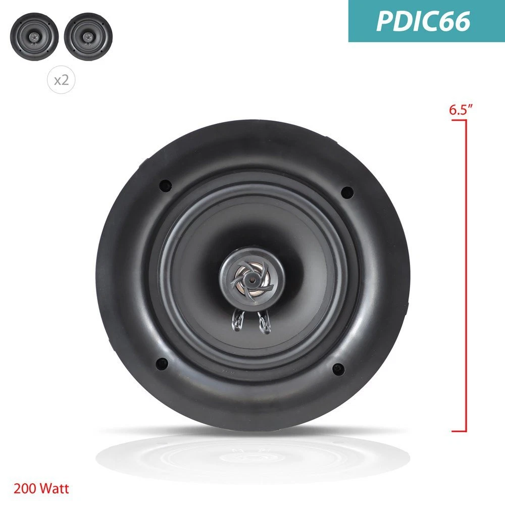 Pyle 6.5” 2-Way Midbass Speakers - Pair of In-Wall/In-Ceiling Woofer Speaker System 1/2'' High Compliance Polymer Tweeter Flush Mount Design w/ 60Hz - 20kHz Frequency Response 200 Watts Peak - PDIC66 60Hz - 20kHz FREQUENCY RESPONSE: Pyle, 6.5” speaker system has a 1/2'' high compliance polymer tweeter and frequency response. This flush mount speaker is pack with exceptional 8 ohm impedance rating and impressive 200 watts power handling capability 2-WAY MOUNT SPEAKER: The pair of 6.5” stereo sound speaker has two way of installation. It is made of polypropylene cone with rubber edge and built-in electronic crossover network perfect for custom installations and applications FLUSH MOUNT DESIGN: A pair of flush mount design midbass speaker for simple and easy in-wall / in-ceiling installation. The product includes cutout dimension at 7.9” in diameter x 3.1” in depth and changeable round and square stain resistant grills 200 WATTS PEAK: Pyle in-wall speaker system were carefully combined to reproduce sound clearly with outstanding responsiveness. It can achieve wide-ranged sound performance speakers secure as well as extending the life of the product 9.5" x 3.4" CUTOUT DIMENSION: It has an elegant white look perfect for home or indoor ceiling cabinet enclosure wall. It is secure with a bracket that supports 6.74 lbs. speaker in overall dimension at 9.5" diameter x 3.4"depth