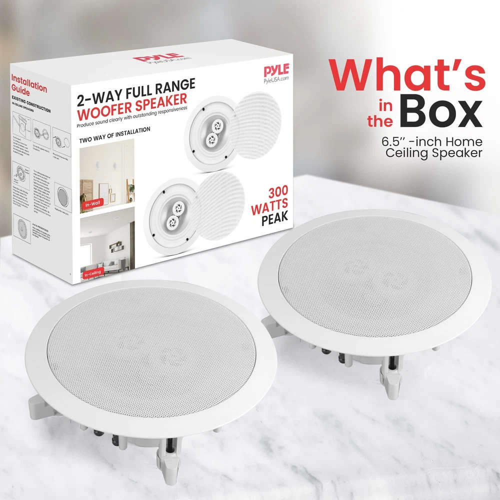 Pyle 6.5 Inch 300W Dual Channel 8 Ohm Home Audio In Ceiling Marine Grade Waterproof Speaker with 60Hz to 22kHz Frequency Response, Single, 1 Pack WEATHER RESISTANT SPEAKERS: Pyle 6.5” ceiling wall mount speaker is a dual channel speaker that features weather resistant for high moisture areas. The product is marine grade construction perfect for indoor and outdoor installation 60Hz - 22kHz FREQUENCY RESPONSE: Pyle ceiling speaker system is equipped with (2) 1/2” polycarbonate tweeters and frequency response. This product is pack with exceptional 8 ohm impedance rating and impressive 300 watts power handling capability FLUSH MOUNT DESIGN: A single flush mount design stereo speaker for simple and easy in-wall / in-ceiling installation. The product features convenient push-type speaker terminals allow for quick and hassle-free speaker wire connection 300 WATTS PEAK: Pyle in-wall speaker system were carefully combined to reproduce sound clearly with outstanding responsiveness. The heavy-duty voice coil can achieve wide-ranged sound performance speakers and extending the life of the product EASY INSTALLATION: The product includes cut-out template for easy installation. The cut-out template measure 7 2/3” in diameter and 2 3/4” in mounting depth. The product also includes the mounting hardware for precise application or installation