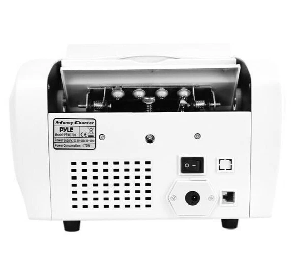 MPN:PRMC700Power:85/250V, ACWeight:11.45 lbsCountry/Region of Manufacture:ChinaModel:PRMC700gtin13:N/AType:Bill CounterPower Consumption:70 WattMaterial:MetalBrand:PyleUPC:N/APower Type:BatteryConnectivity:WirelessBill Counting Speed:1100+ Pieces Per MinuteDimensions (L x W x H):11.8'' x 10.2'' x 6.5''Hopper Bank Note MAX Capacity:+/- 320