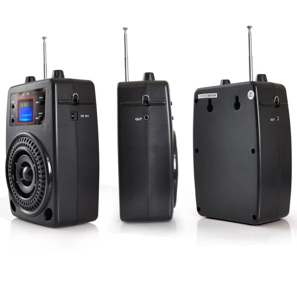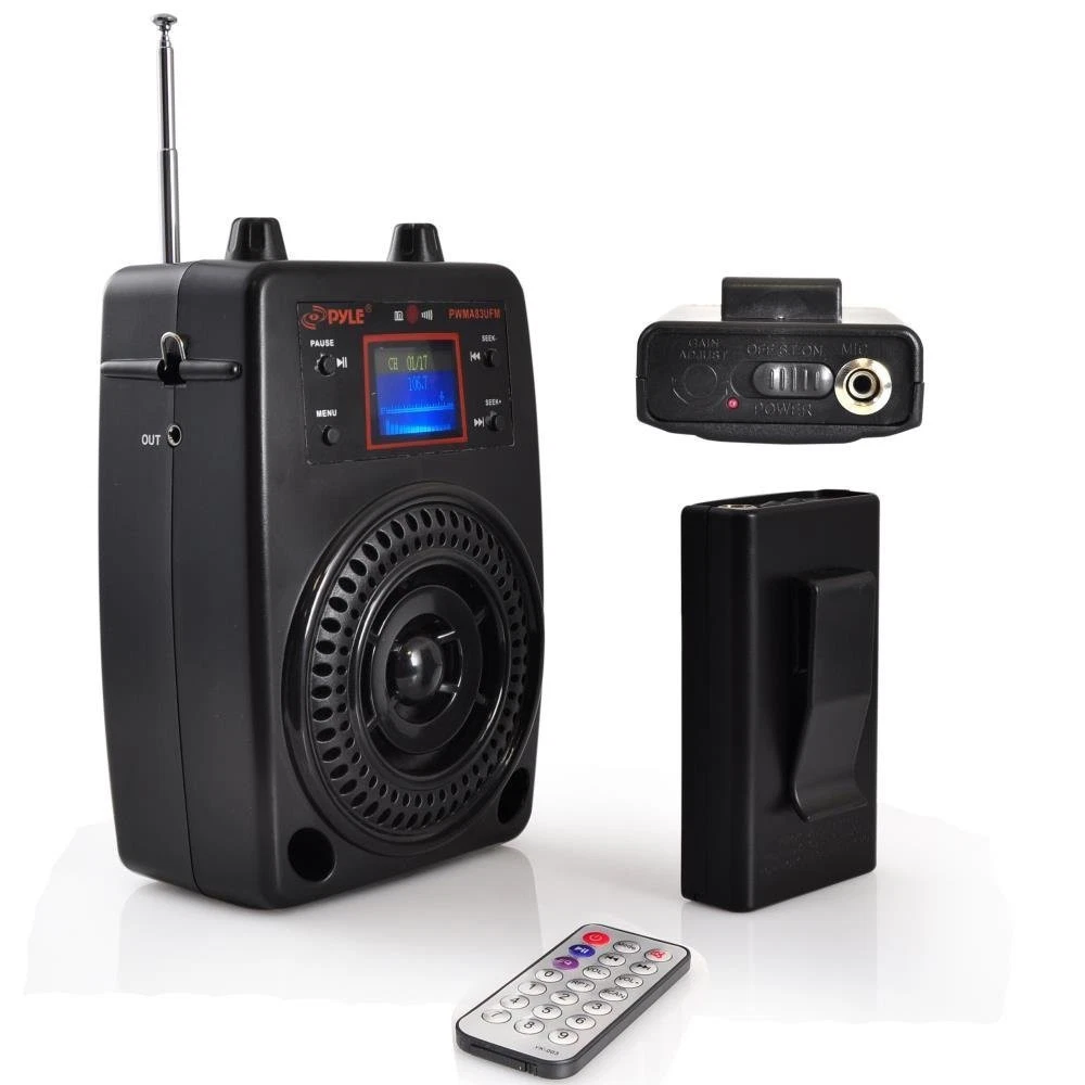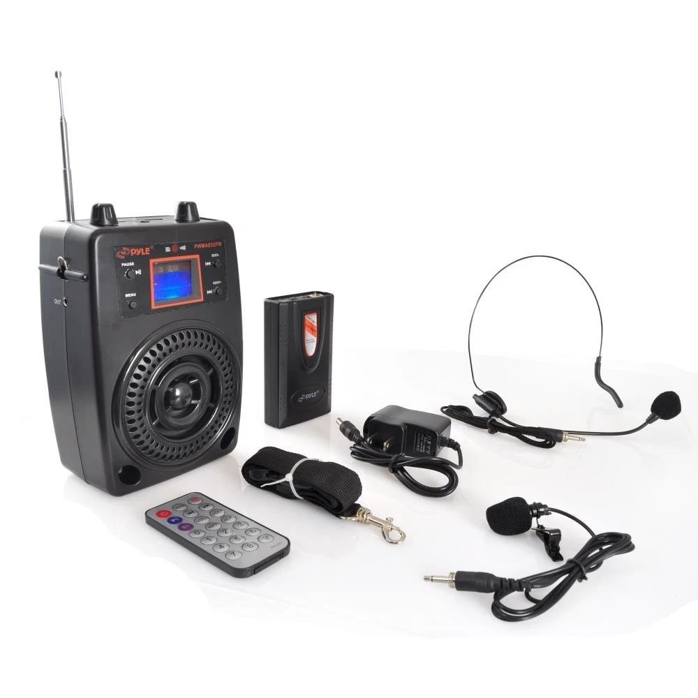 Pyle Portable PA System, Wireless Microphone Kit, Compact Stereo System, FM Radio, LCD Display, USB, Rechargeable Battery, includes Lavalier Microphone Headset, Outdoor Surround Sound (PWMA83UFM) PROJECT YOUR VOICE: Use the portable compact stereo system to make your voice heard with the included wireless headset and lavalier microphone. The built-in speakers project your voice or your music AUDIO STREAMING: Some of the compact portable stereo features include FM Radio with LCD display, USB and SD Memory Card Readers for MP3 digital audio playback, or use the Aux (3.5mm) input jack to connect audio from an external device FULL SYSTEM KIT: Includes a wireless headset, lavalier, belt-pack & power adapter. TRAVEL SIZE: System was designed to be handheld, along with a built-in rechargeable battery, making the system extra mobile & perfect for transportable sound power Extends the battery life up to 8 hours ADDITIONAL FEATURES: The portable pa speaker system upgrades include digital ID3 tag readout that displays song title and artist, EQ audio control, as well as repeat and random audio functions