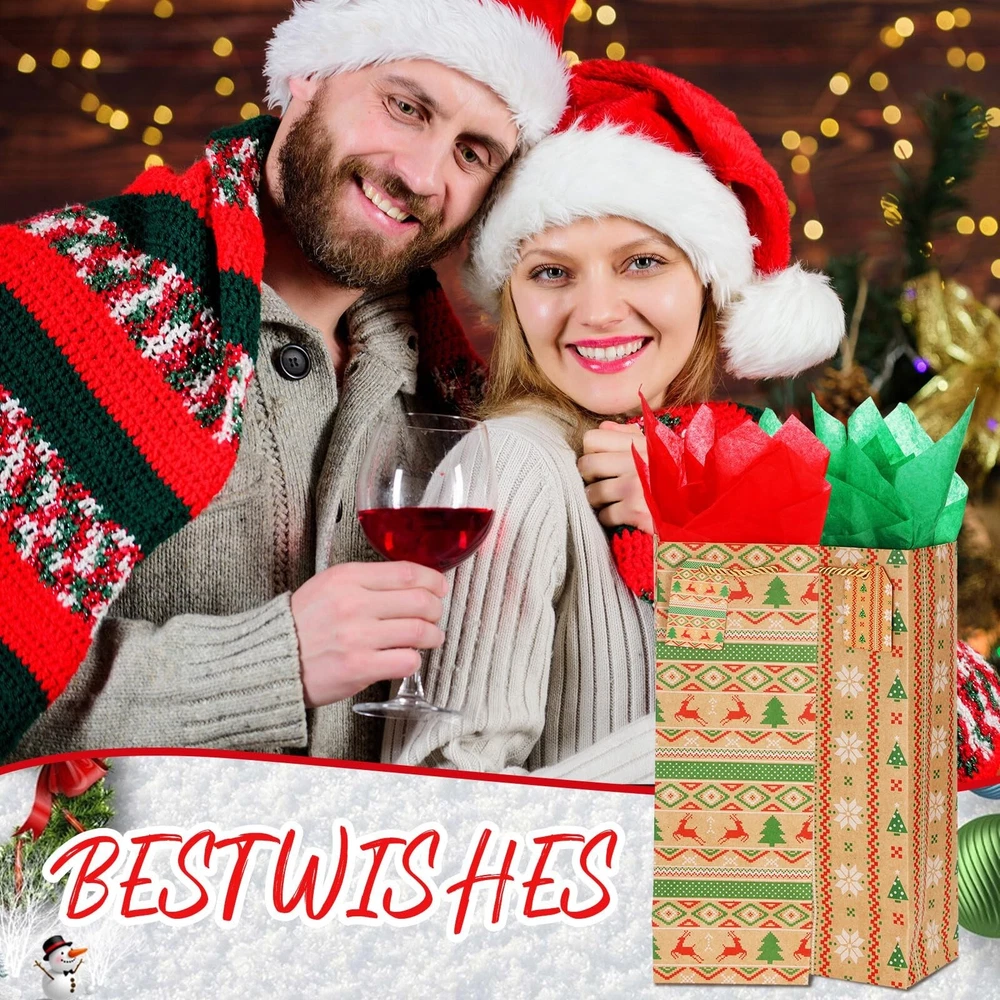 Qilery 60 Pieces Christmas Wine Bottle Gift Bags with Handle Christmas Kraft Wine Gift Bags Holiday Bottle Bags with Tissue Paper and Name Tags Kraft Wine Bags for Xmas Party Favors Supplies Product Details Brand: Qilery Color: Red Material: Cardboard Occasion: Christmas Included Components: Name tags, Tissue Paper, Twine Theme: Christmas Number of Items: 60 Unit Count: 1.0 Count Pattern: Christmas Size: Inches Package Dimensions: 15.98 x 10.75 x 7.09 inches Item Weight: 6.42 pounds Manufacturer: Qilery Country of Origin: China Item model number: YEN-Qilery-2228 Date First Available: July 24, 2023 Christmas Gift Bags Set: you will receive 60 Christmas wine gift bags including 6 different designs, 10 of each design, each Christmas pattern design is beautiful and colorful, the set also comes with 60 name tags, 60 sheets of tissue paper and a bundle of twine, to meet your packaging combination needs Suitable Size: Christmas wine bag bulk size is about 14 x 4.9 x 3.9 inch/ 35.5 x 12.5 x 10 cm, tissue paper size is about 20 x 24 inch/ 50 x 60 cm, suitable for packing a single standard wine bottle, you can use this wine bag to safely store your wine, gifts or other party favors Reliable Material: Christmas bottle gift bags are made of quality kraft paper, safe and reliable, light and strong, non fading, reusable, and can be applied for a long time with confidence, making your gifts look more delicate Christmas Exquisite Design: the wine Christmas gift bags are exquisitely designed, cute, colorful and eye catching, and have many Christmas elements, such as snowflakes, reindeer, Christmas trees, etc., to meet your gift giving and decoration needs, and create a strong Christmas atmosphere Suitable for Many Occasions: Xmas wine bag gifts are suitable for Christmas wine gift, winter holiday decorations, Christmas parties and gifts, and gifts for wine lovers and drinking lovers, making the gift look more exquisite Features: Ideal gift: These Christmas gift bags are suitable for wine, candies, biscuits, etc., with attached tags and twine, easy to hang tags and write names and wishes, ideal for wrapping gifts for Christmas. Strong Christmas atmosphere: Our holiday kraft wine bags are designed with classic Christmas patterns to enhance the Christmas mood and make your gifts more lively. Specifications: Material: kraft paper Color: as the picture shown Size: Christmas wine bags: about 14 x 4.9 x 3.9 inch Tissue paper: about 20 x 24 inch Name card: about 3.7 x 1.8 inch Hemp rope: 32.8ft Package includes 60 x Christmas wine gift bags 60 x Tissue paper 60 x Name card 1 x Hemp rope Warm reminder: Manual measurement, please allow slight errors on size. The color may exist a slight difference due to different screen displays.
